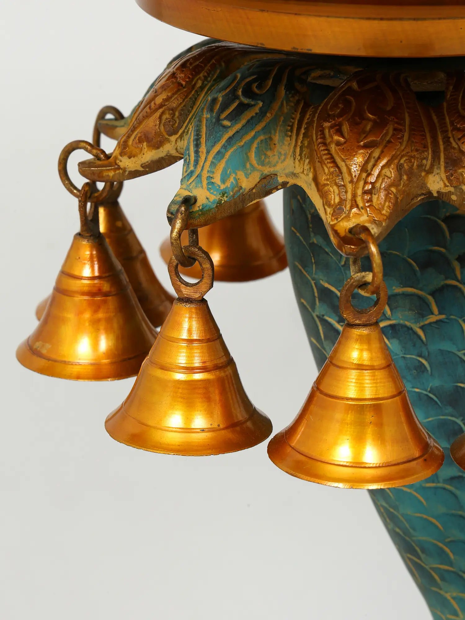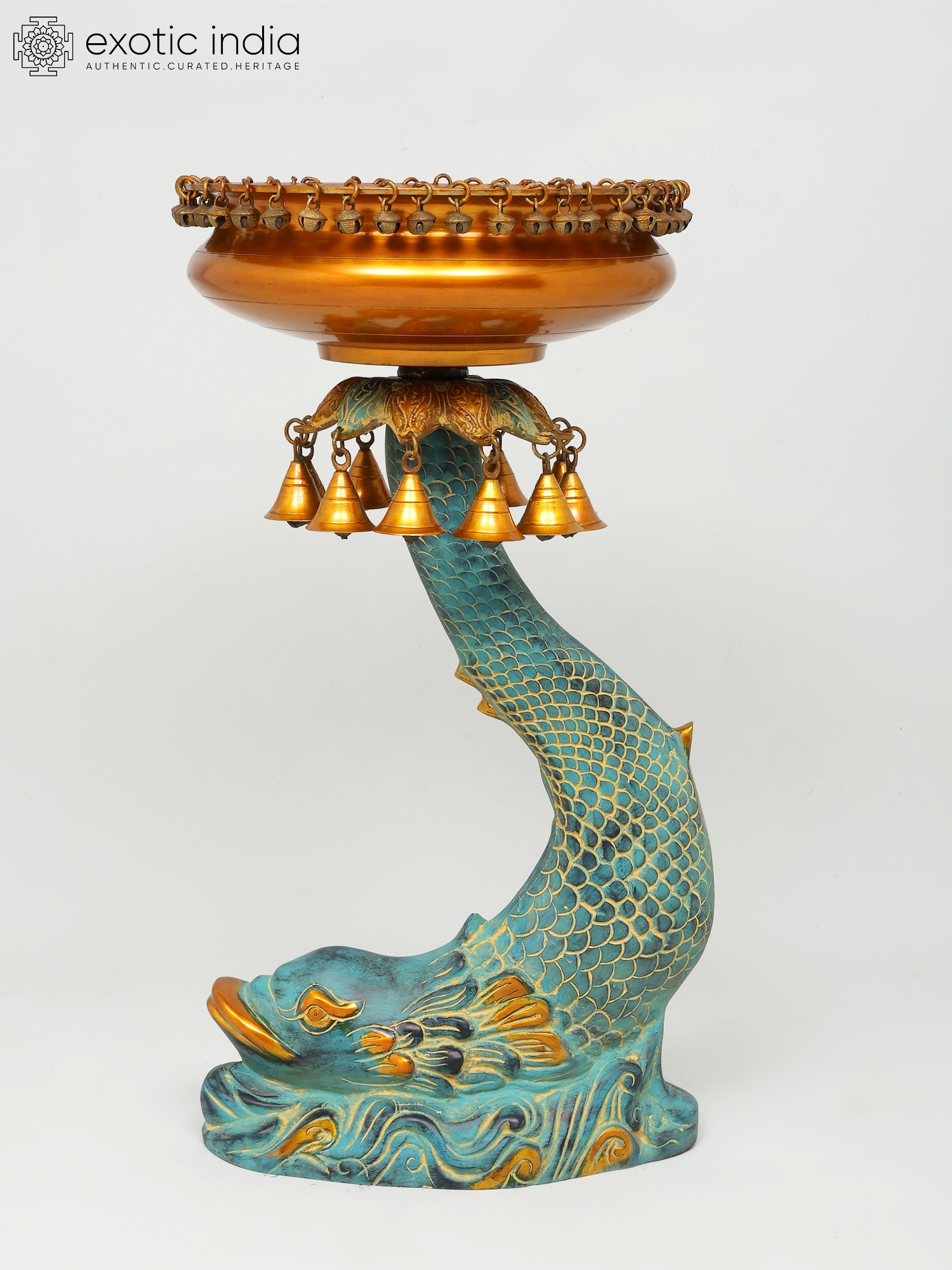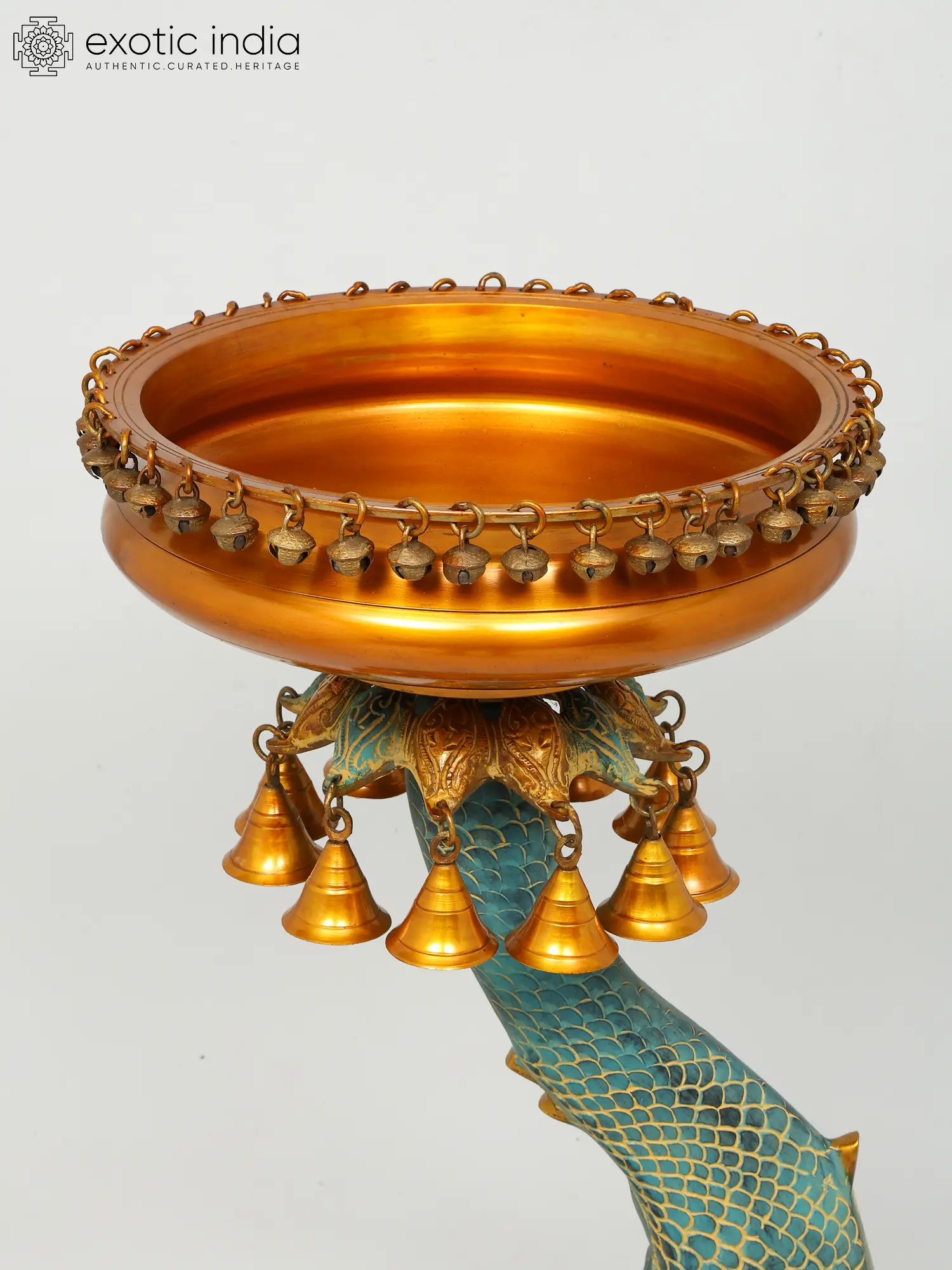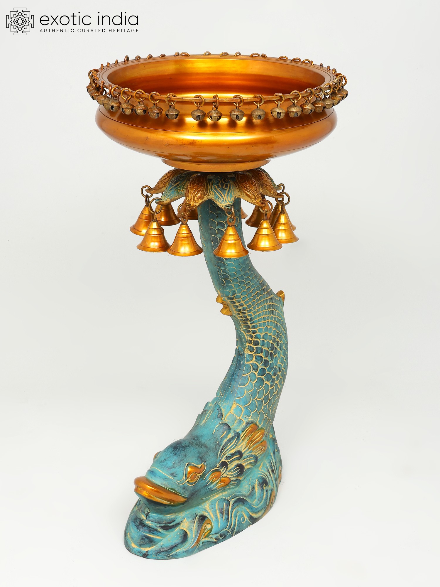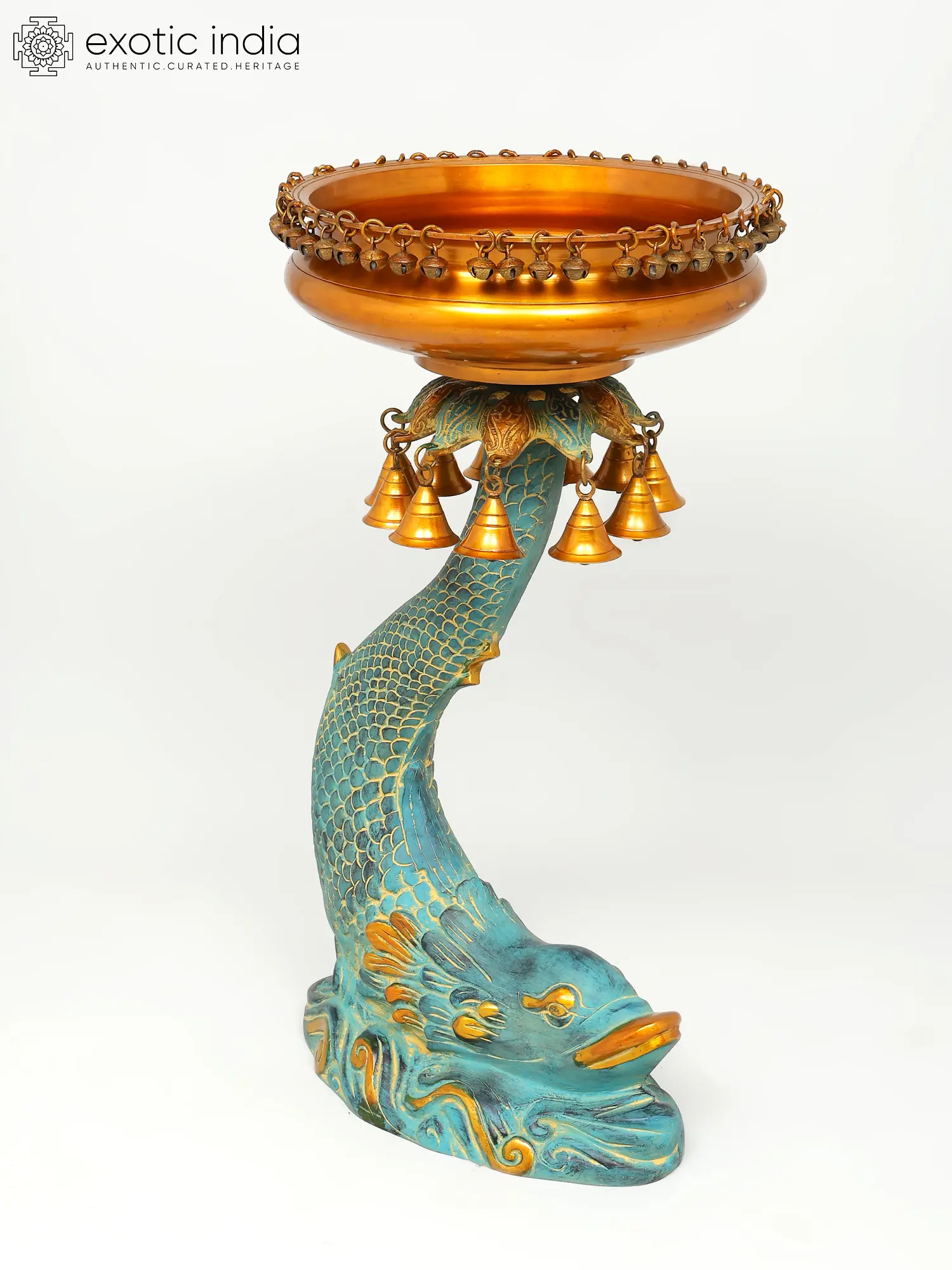 Standing atop a Koi Yama Carp stand, this Urli bowl emits a stunning mix of cultures and artistic quality. The Urli is embellished with exquisite Ghungroos, which lend a touch of rhythmic appeal and musical intrigue. The painstaking craftsmanship on display at the Koi Yama Carp booth is inspired by Japanese traditional stories. The fish's scales are meticulously carved to capture its mythological character. The Koi Yama Carp's tail blooms like a brilliant flower, studded with beautiful bells that chime with every movement. This stunning ensemble combines the peaceful balance of traditions and artistry, resulting in a compelling centerpiece that embraces nature's beauty and cultural symbolism.