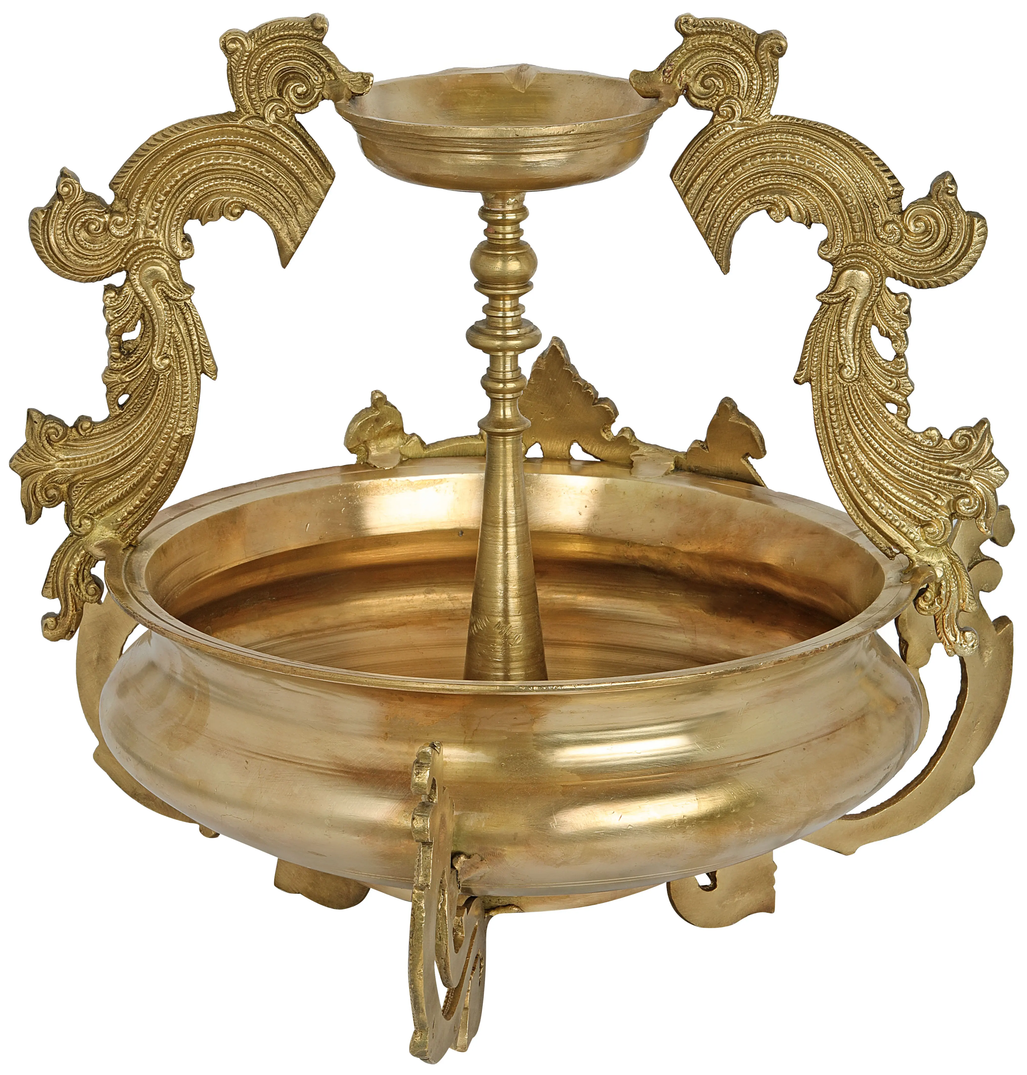 This graciously crafted brass Urli represents the ancient South Indian artistic style and if you closely observe, you will be intrigued by the amazingly carved engravings and designs. The large pot at the bottom is the main Urli bowl in which a good amount of water is to be filled and a layer of beautiful flowers is to be created on top. As you can see on the top, there is also a wick lamp that makes this Urli a perfect decorative piece to adorn the living room or the Puja area during festivities. The natural golden shine and luster of this brass Urli give a vibrant look to the space.