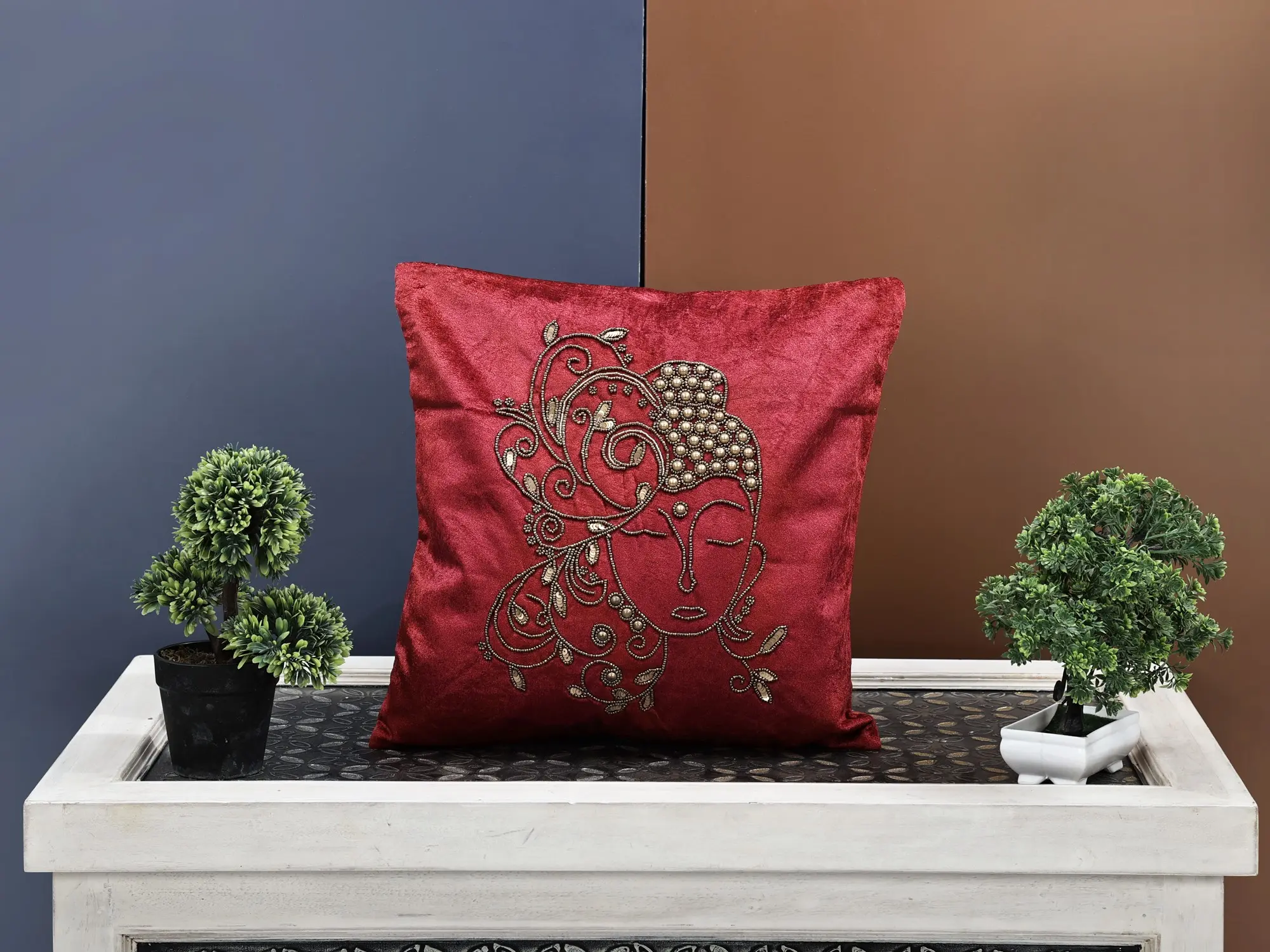 Immerse yourself in the tranquillity of our Velvet Hand Embroidered Buddha Cushion Cover, adorned with exquisite beadwork. This piece transcends mere decor, embodying a sense of peace and serenity inspired by Buddha's teachings. The velvet fabric, coupled with intricate hand embroidery and bead detailing, creates a tactile and visual masterpiece. Elevate your living space with this cushion cover that not only adds artistic flair but also serves as a reminder of mindfulness and enlightenment.
