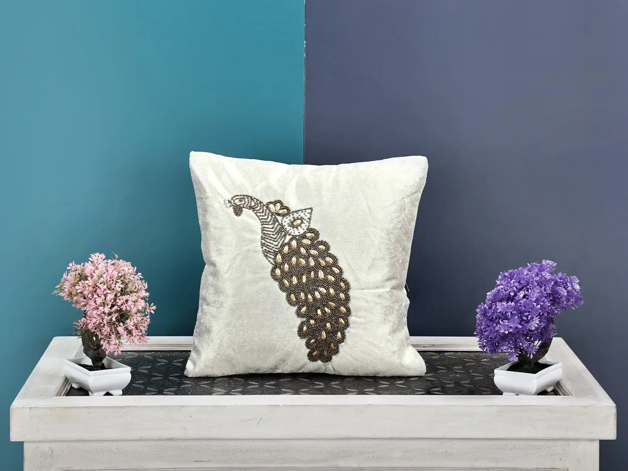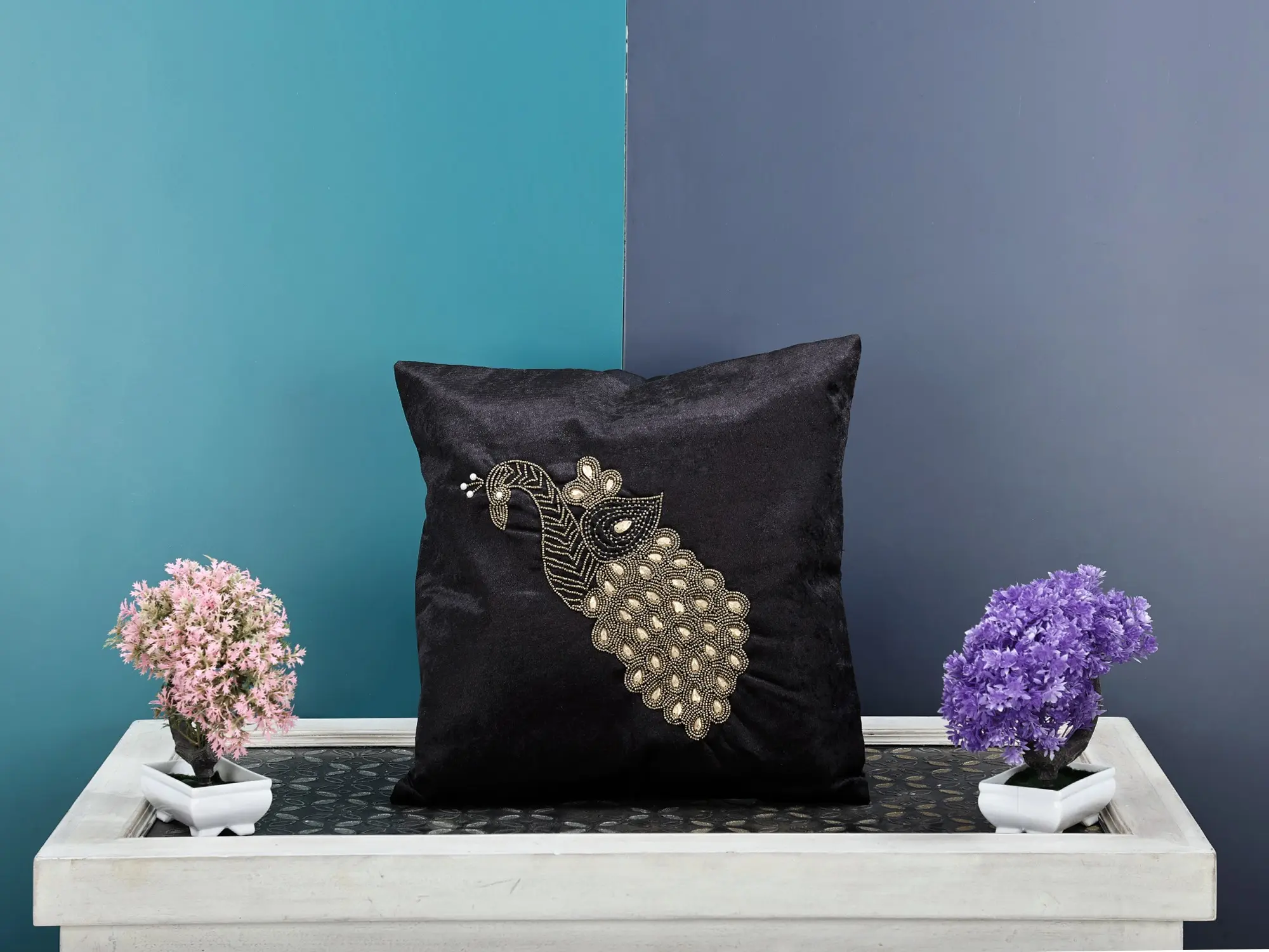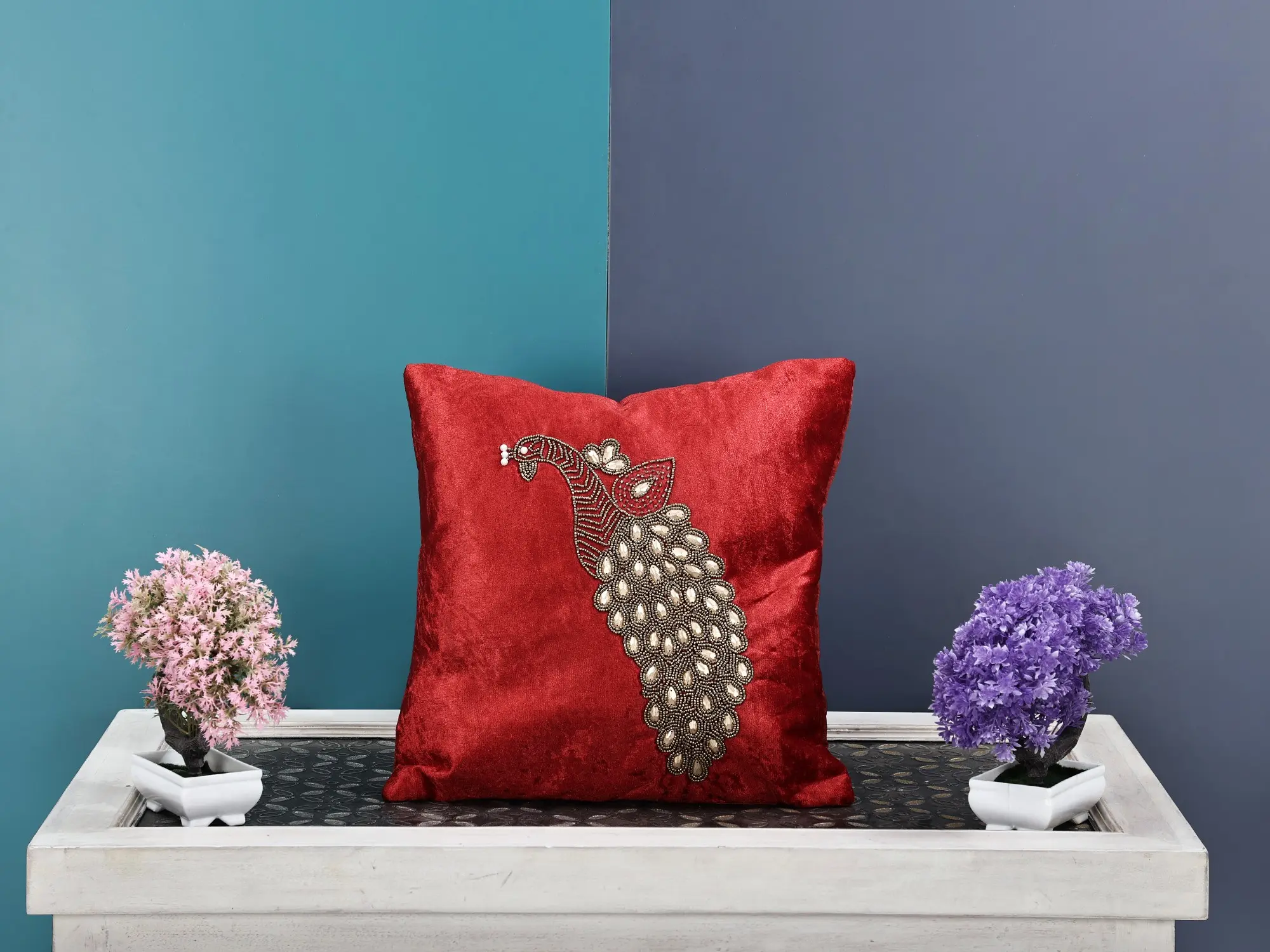Handmade cushion covers in traditional and classic styles can be used to dress up your couch, lounges, or boudoir. Indian Cultural Elements have a majestic and opulent feel to them that would brighten up any space! Choose this exceptional velvet hand embroidered peacock cushion cover with superbly created hand beaded work to enhance the decorum of your home decor. These rich velvet cushion covers are available in exotic colours. Espouse a splash of colour and poise to your furniture with this vibrant velvet cushion cover.