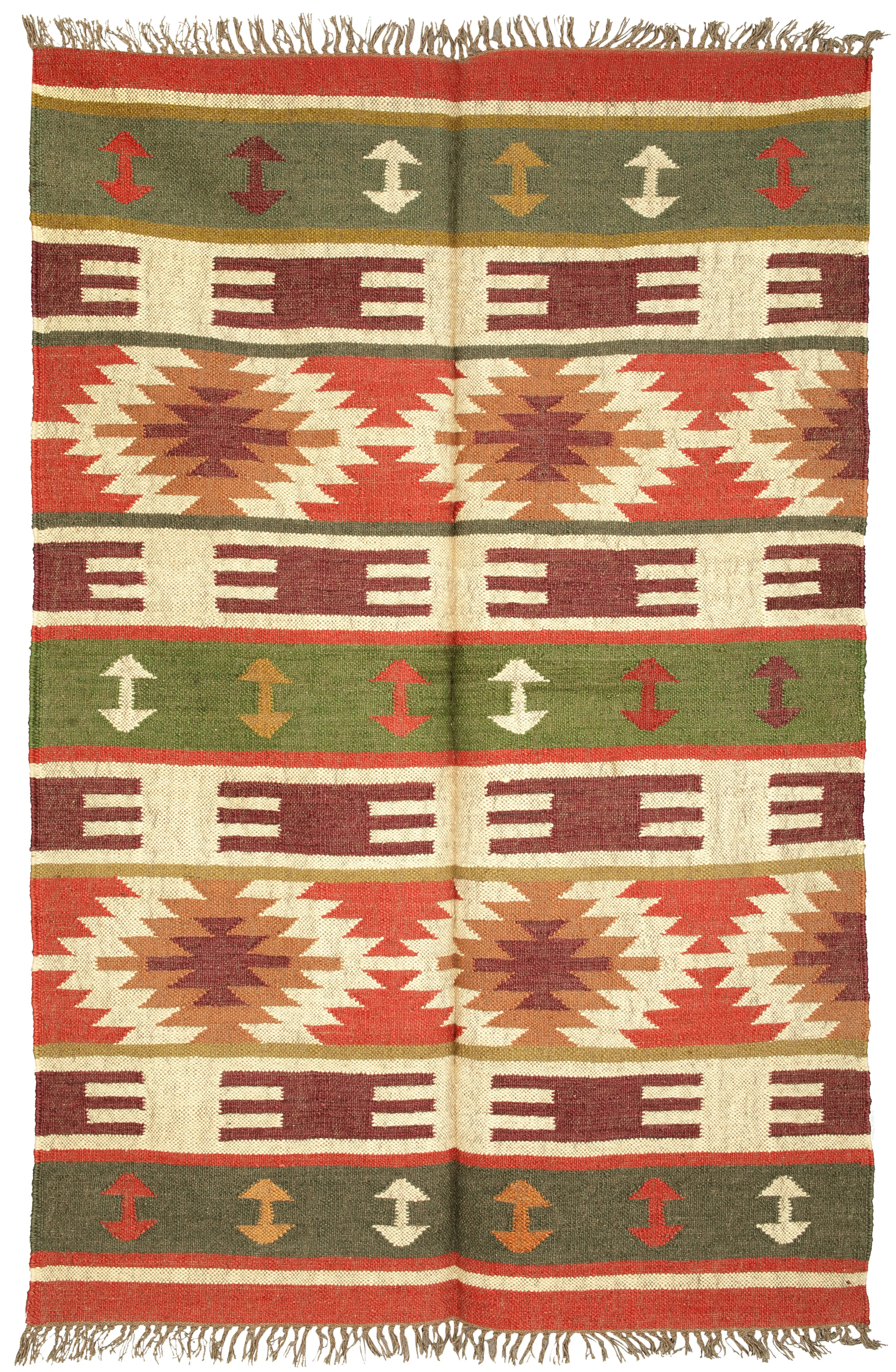 Off-White and Green Dhurrie from Sitapur with Woven Checks