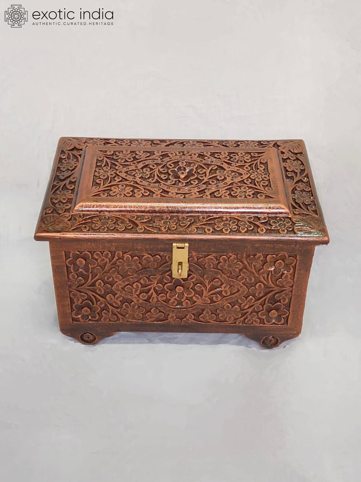 Features an intricate hand-carved floral motif covering the entire exterior.
