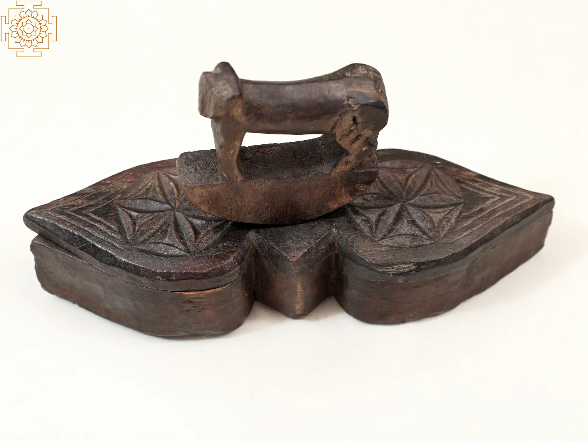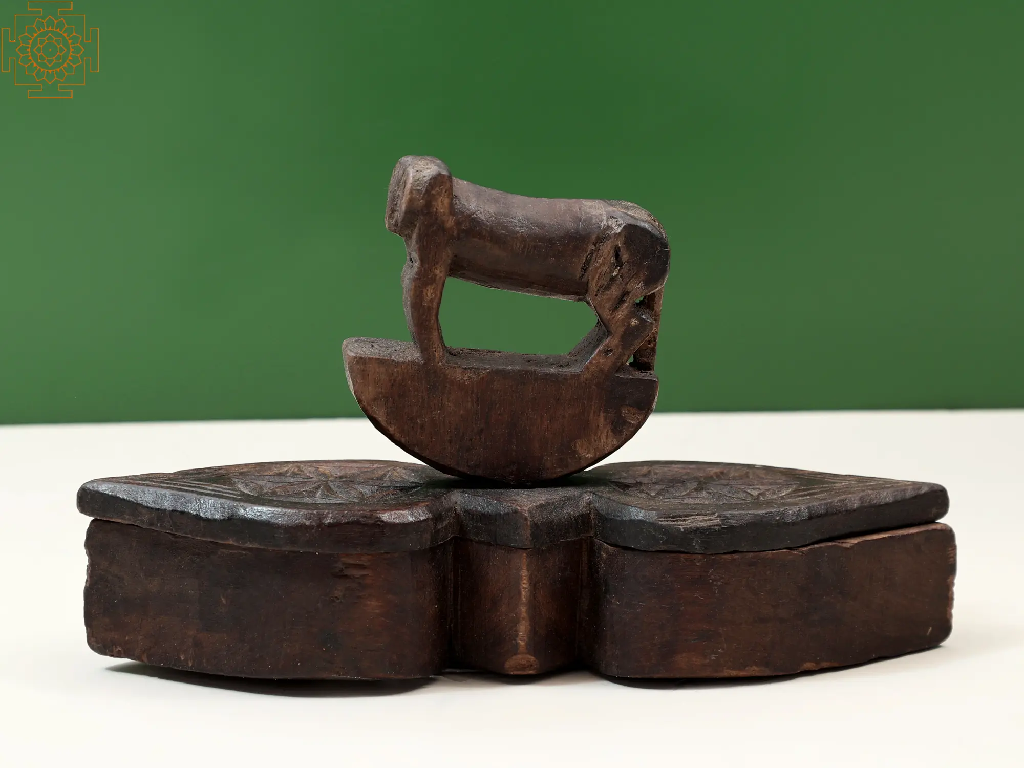 This exquisite Vintage Wooden Tika Box will take you back to the days when artisans made use of traditional carving methods to create masterpieces. This box is a story of artistic creation, revealing the charm of old-fashioned woodworking techniques. Warm and nostalgic, the rich wood exudes a sense of history in any setting. Its design resembles the Bael Patta or leaf of a wood apple. The cover of the tika box is assisted with a handle that can be rotated to open the box. This Vintage Wooden Tika Box offers a glimpse at the lure of times that have passed, showcasing craftsmanship from days past.