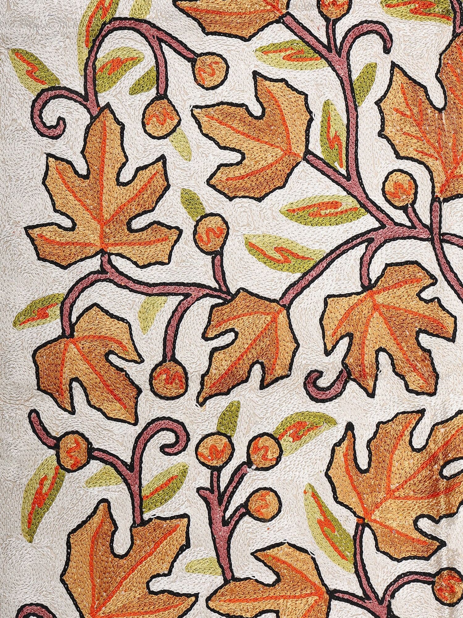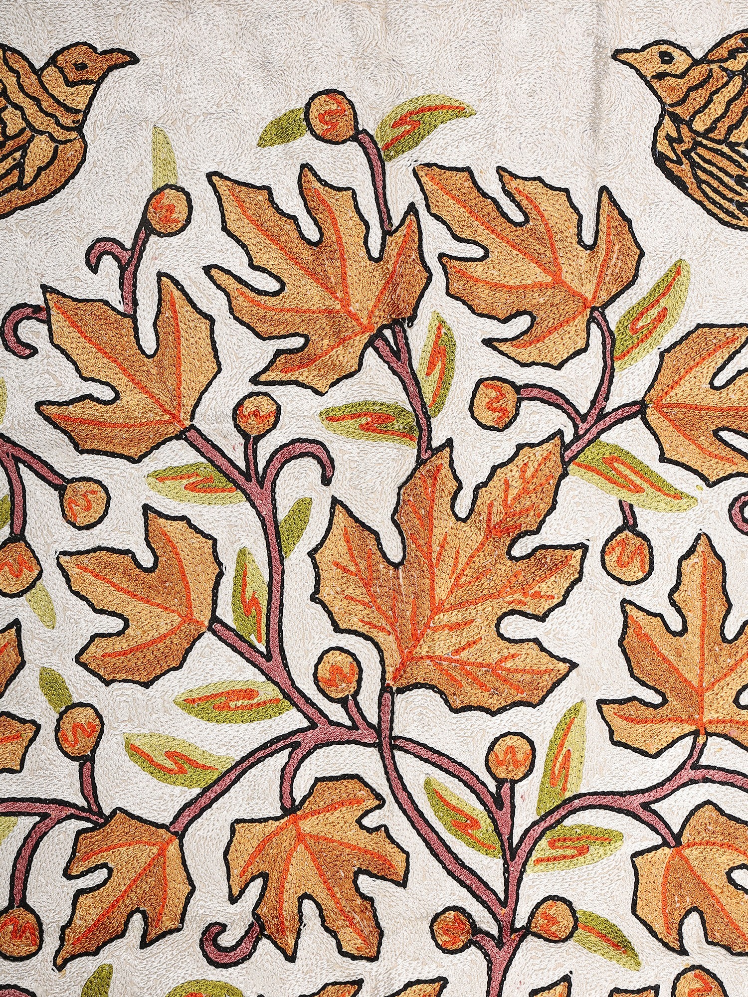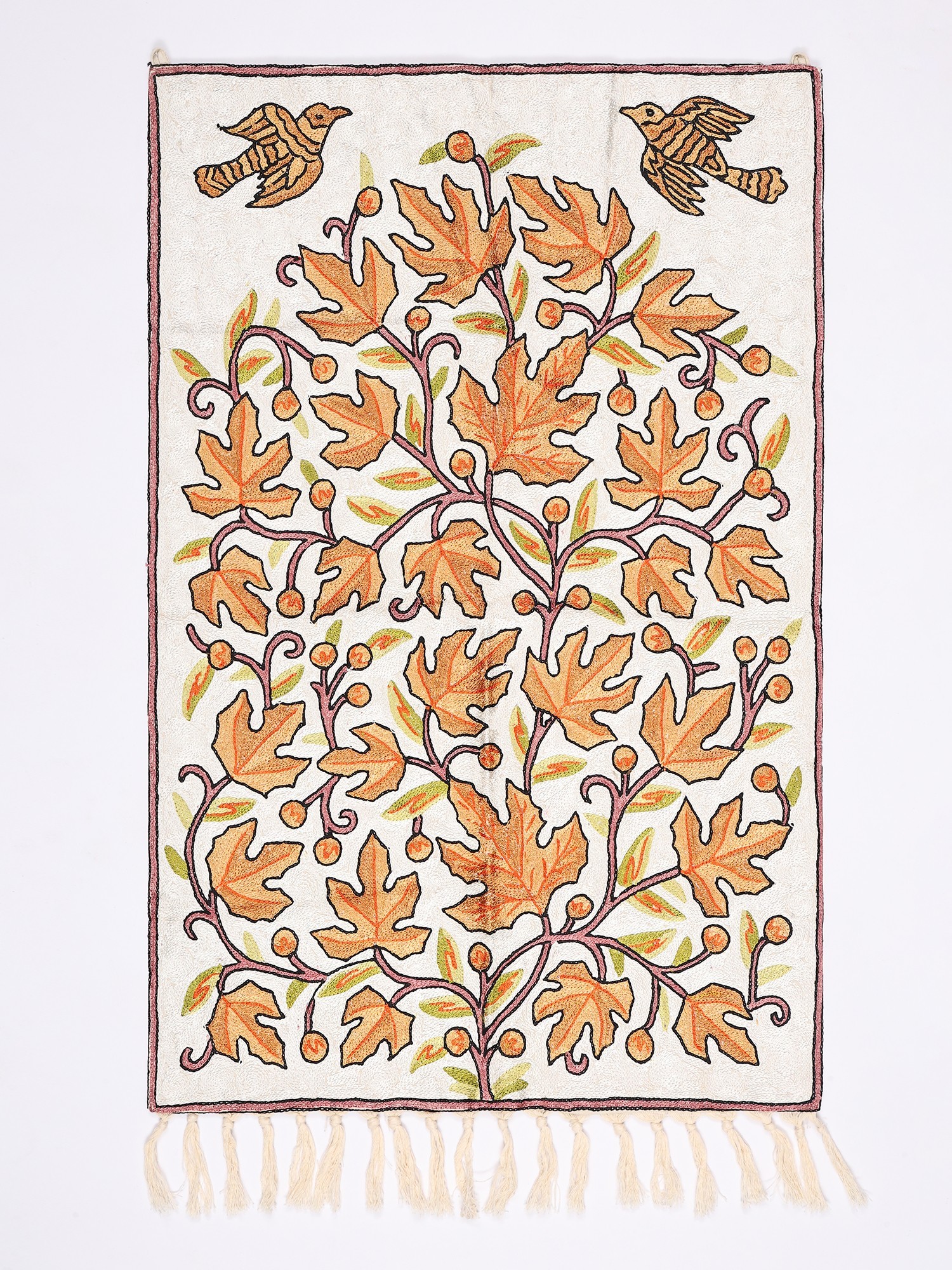 Bring the enchanting artistry of Kashmir into your home with this exquisite piece, a testament to traditional craftsmanship and natural inspiration. Designed to be both a captivating wall hanging and a refined floor accent, this creation showcases the delicate beauty of maple leaves and whimsical flying birds rendered in lustrous silk thread. Each stitch is a whisper of heritage, meticulously woven onto a sturdy canvas base, ensuring both durability and a luxurious feel. The intricate embroidery captures the essence of a vibrant autumnal landscape, inviting a sense of tranquility and natural wonder into any space. ––––––––––