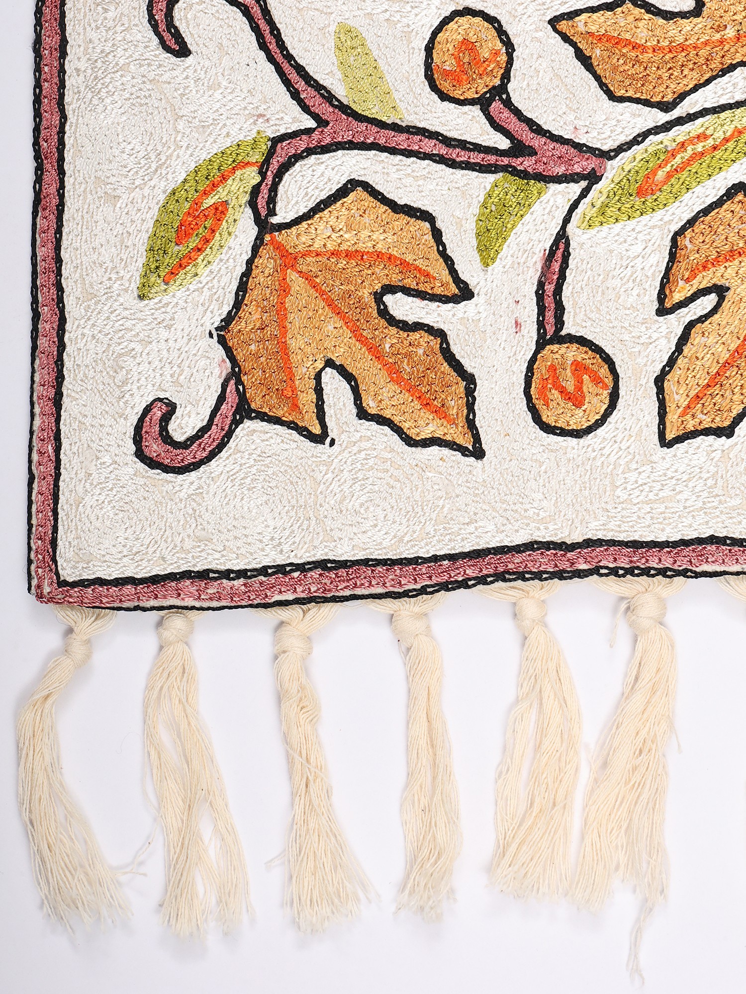 This versatile piece transcends conventional decor. Its thoughtful dimensions make it perfectly suited to adorn a blank wall, transforming it into a focal point of artistic expression. Imagine it gracing a hallway, a living room, or even a bedroom, adding a touch of sophistication and warmth. Alternatively, lay it on a console table, a sideboard, or at the foot of a bed to introduce a subtle yet impactful layer of texture and color to your floor decor. The natural canvas provides a robust foundation, while the delicate silk embroidery ensures it remains a cherished piece for years to come. The addition of charming tassels at the bottom edge further enhances its decorative appeal, adding a touch of Bohemian flair and completing the handcrafted aesthetic. Embrace the artistry and the heritage embedded within this unique Kashmiri creation, a beautiful fusion of nature's design and human skill.