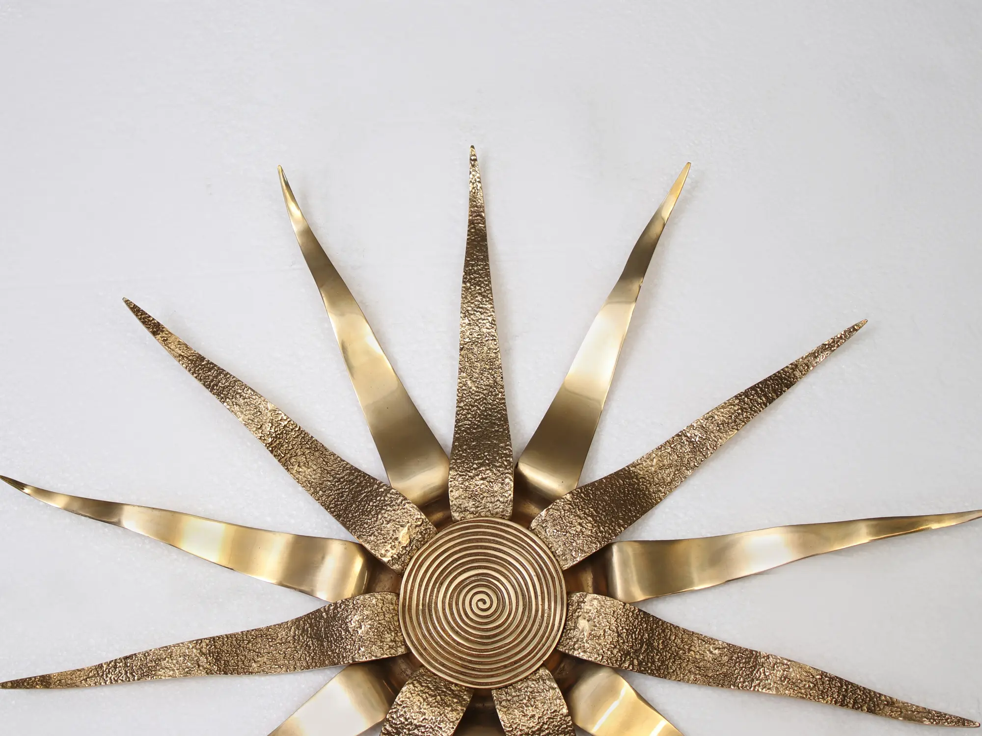 What sets this piece apart is its innovative design of two types of sun rays. One bears a rugged texture, symbolizing the raw power and energy of the sun, while the other boasts a smooth, polished surface, signifying its radiant and gentle aspects. At the heart of the design lies a captivating spiral motif, reminiscent of a hypnotizing whirl, adding an enchanting charm.