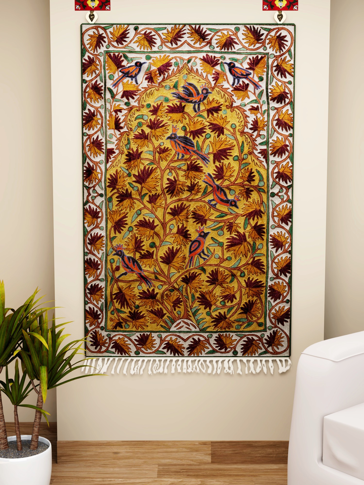 The central design showcases the timeless symbol of the Tree of Life, meticulously embroidered with resham threads on a durable canvas backing. This enduring motif represents interconnectedness, growth, and the enduring cycle of nature. Each stitch brings the vibrant scene to life, featuring a lush canopy of leaves in autumnal hues and a scattering of colorful birds perched among the branches. The intricate details and vibrant colors create a focal point that is both captivating and calming. The branches themselves, rendered in detailed brown and gold, reach across the canvas, creating a sense of depth and dimension.
