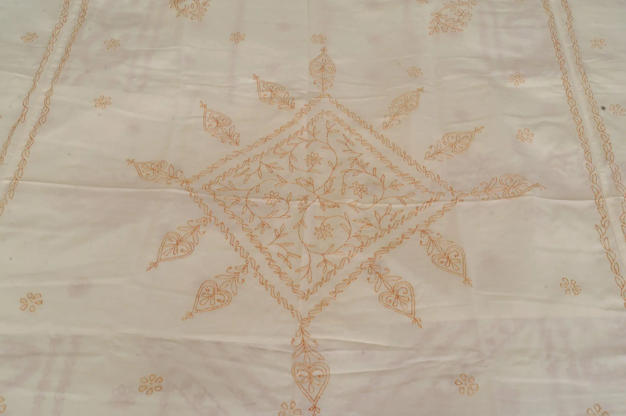 This bedspread is more than just a piece of bedding; it's a work of art rooted in the rich cultural heritage of Lucknow, India. The embroidery technique, passed down through generations, is known for its delicate beauty and intricate patterns. Each stitch is a testament to the artisan's skill and dedication, resulting in a truly special piece. The dimensions of 6.8 ft x 7.8 ft make it an ideal fit for most standard-sized beds, providing ample coverage and a luxurious drape. Included are matching pillow covers, continuing the elegant theme and completing the cohesive look of your bedding ensemble. The breathable cotton material ensures comfort in all seasons, keeping you cool in the summer and cozy in the winter. Enjoy the blend of comfort and style that this bedspread brings to your personal space.