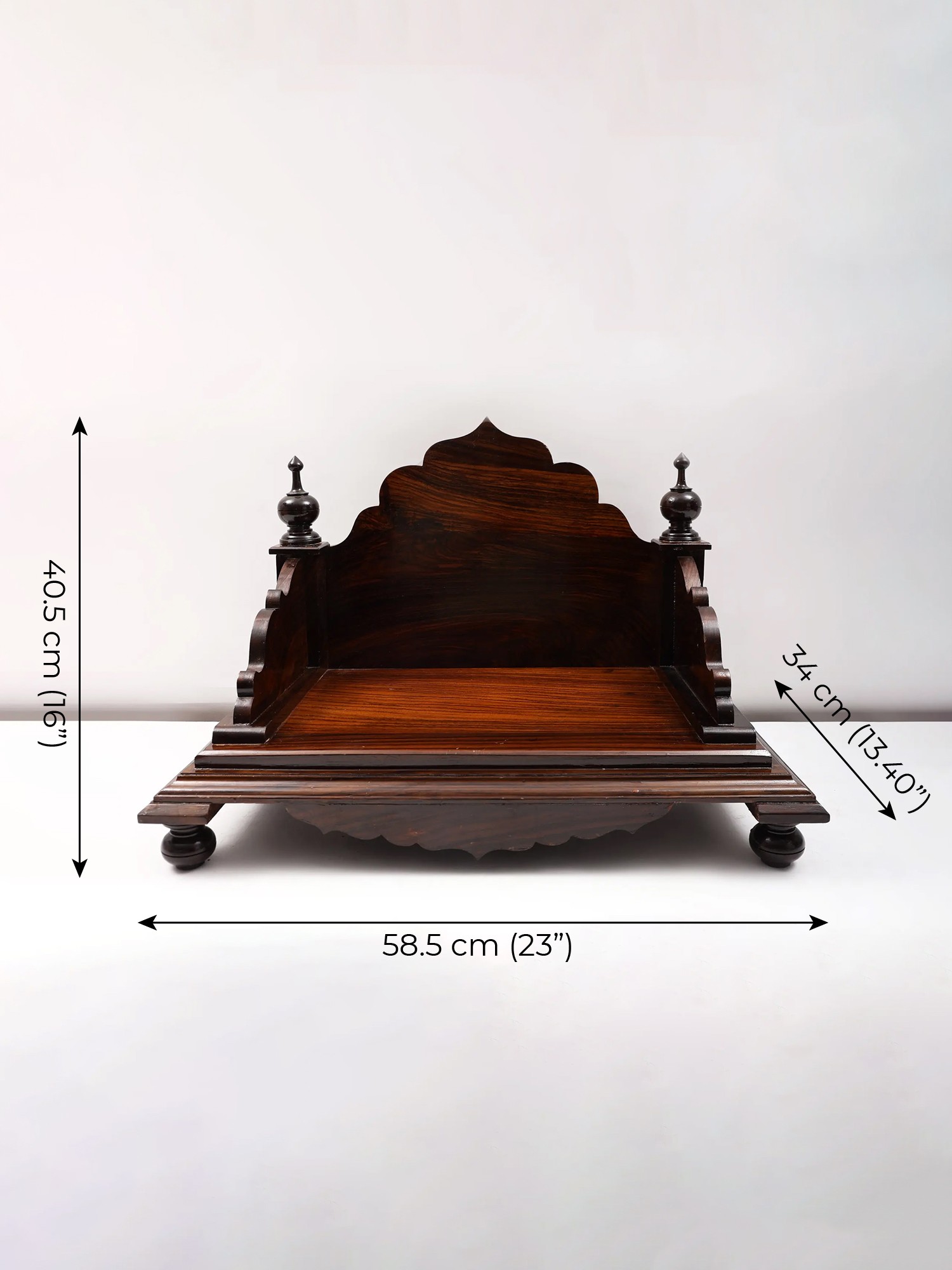 The ritual worship of a deity in Hinduism includes offering a sacred seat to the god or goddess, who is ardently invited to reside in that space with all their power and grace, filling a space with their heavenliness. Aasana or throne thus is a vital element in Puja, and with this wooden home temple crafted in the style of a regal throne, you can call upon your Ishta (tutelary deity) and offer them a befitting place in your home.