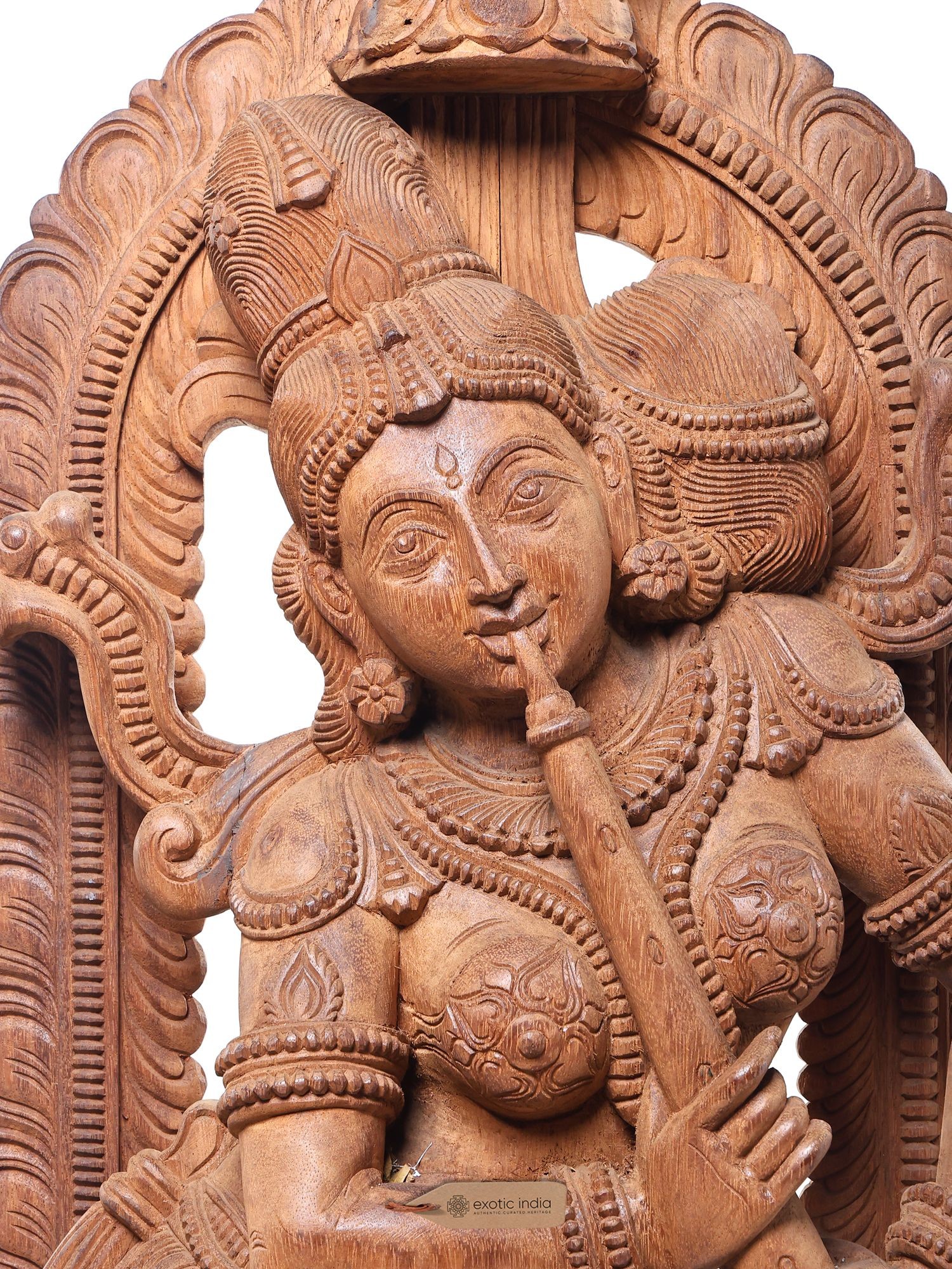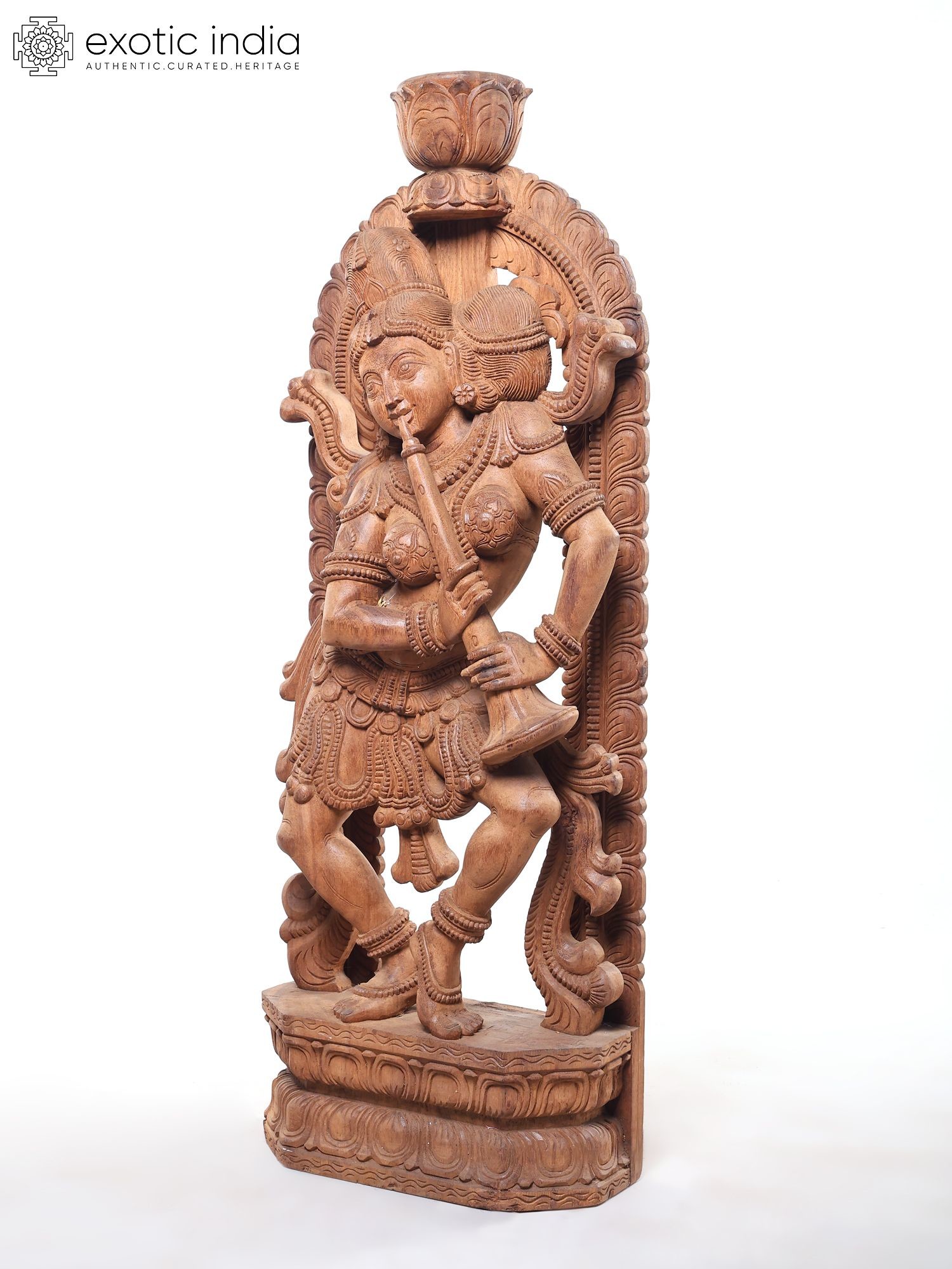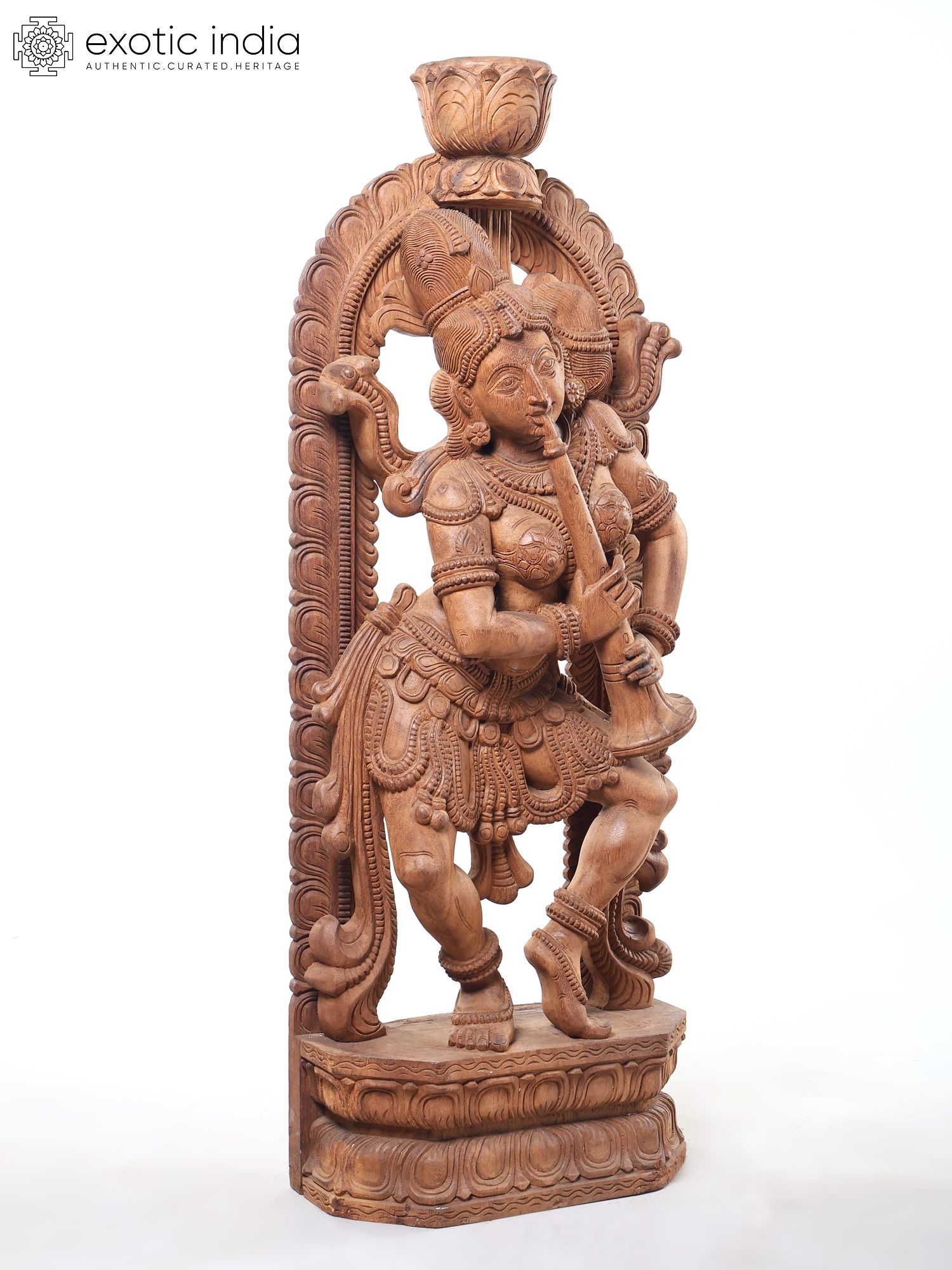 Wooden Temple Sculpture: Celestial Musician (Devangana) Playing Shehnai (42")