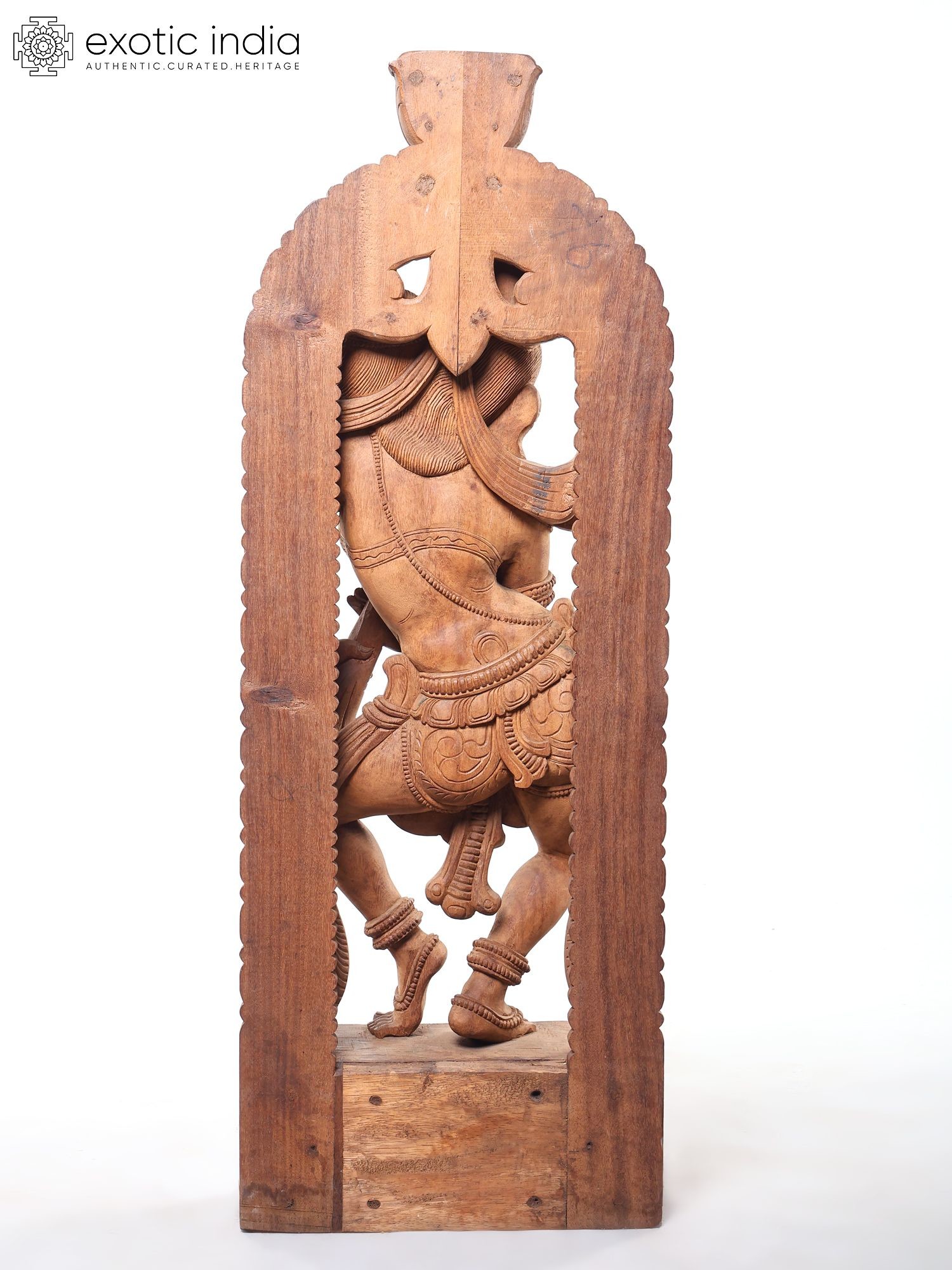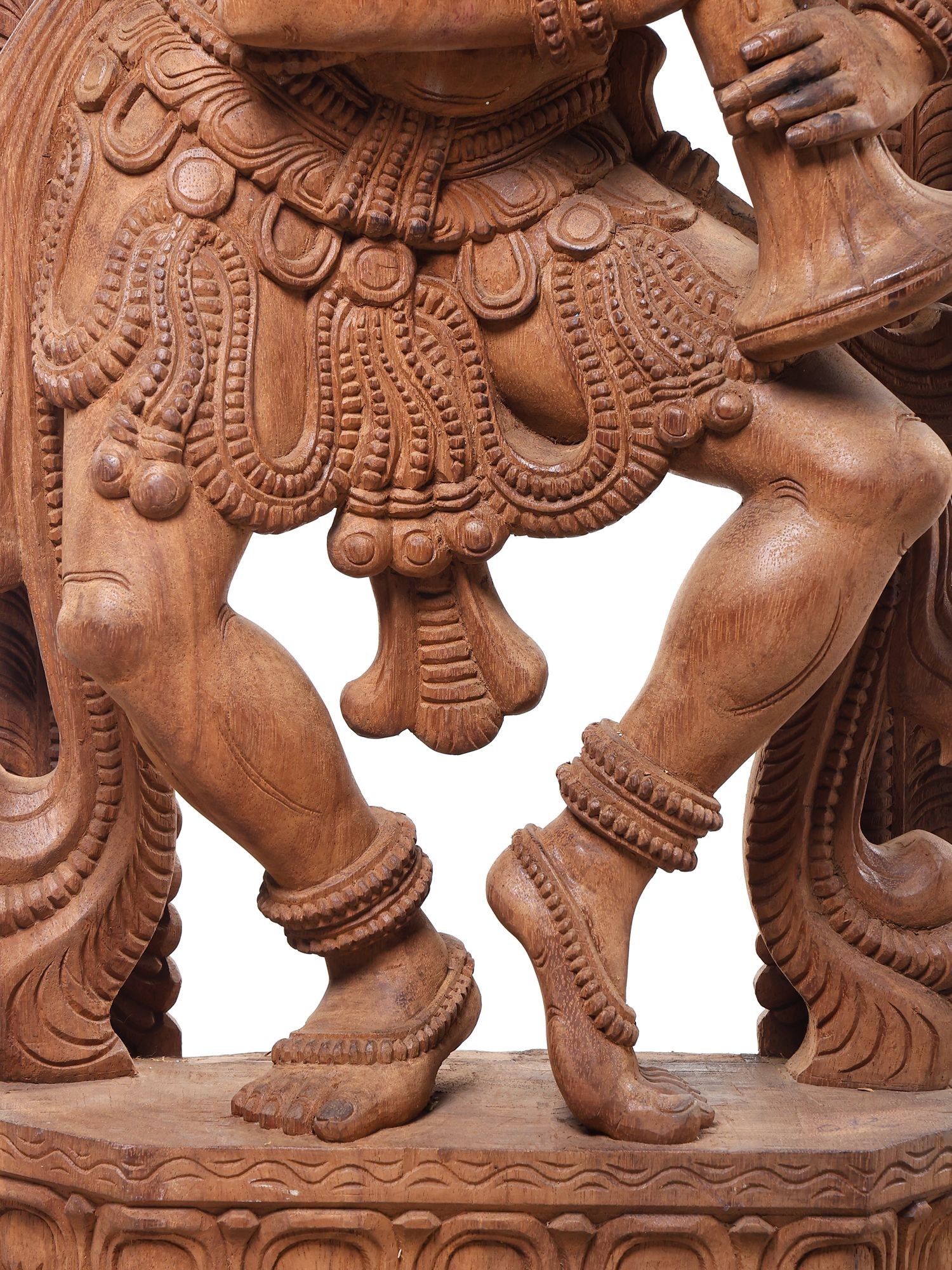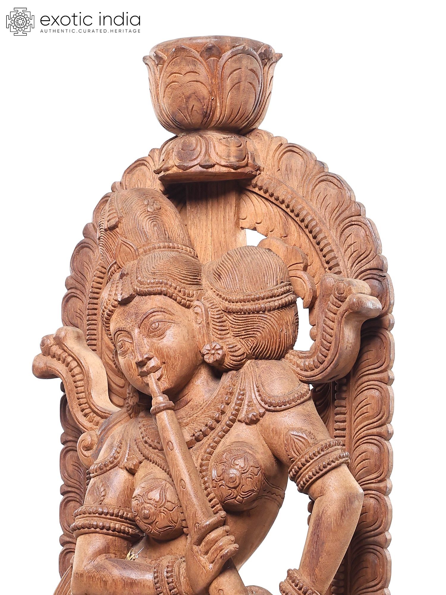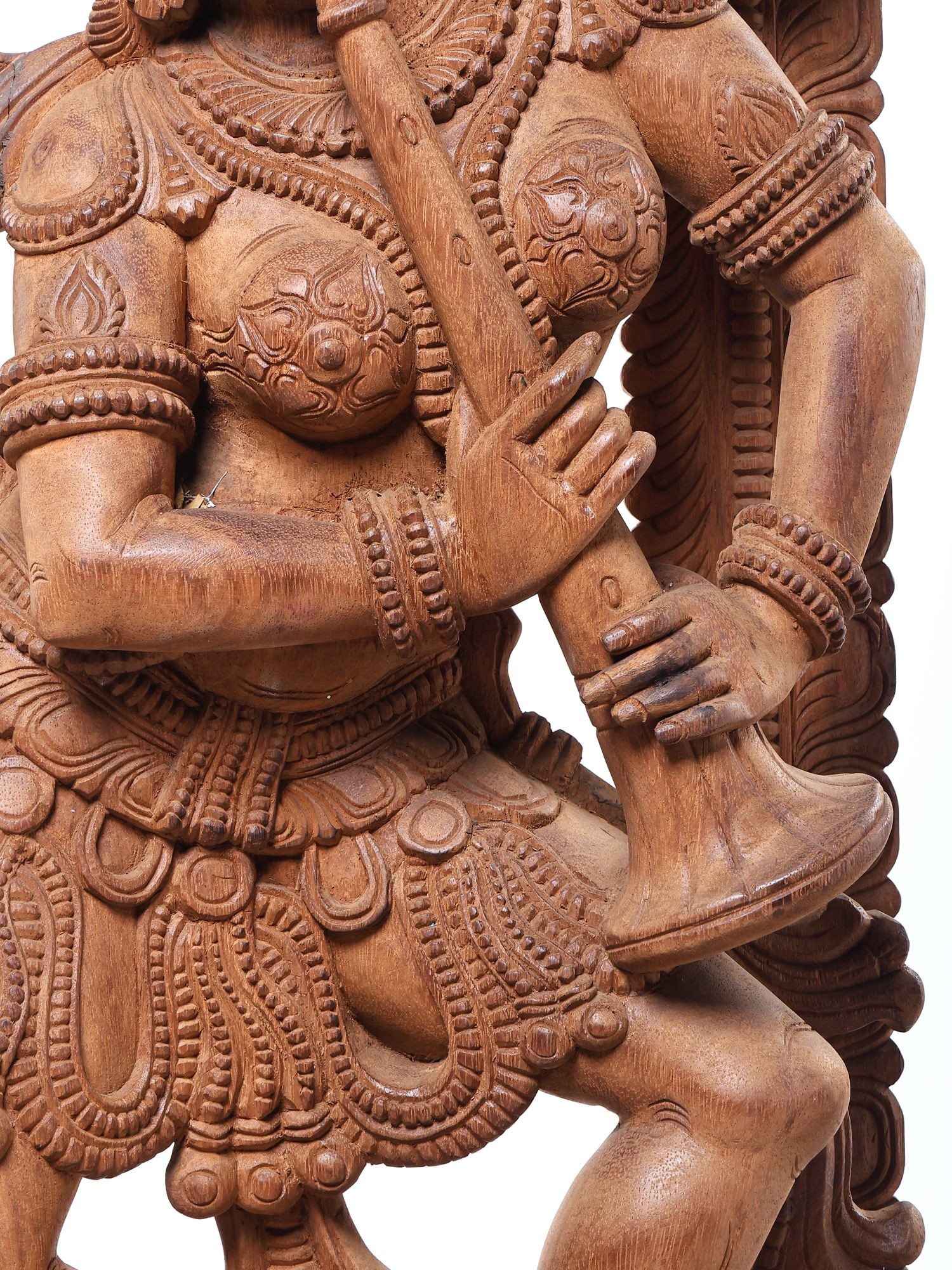 Wooden Temple Sculpture: Celestial Musician (Devangana) Playing Shehnai (42")