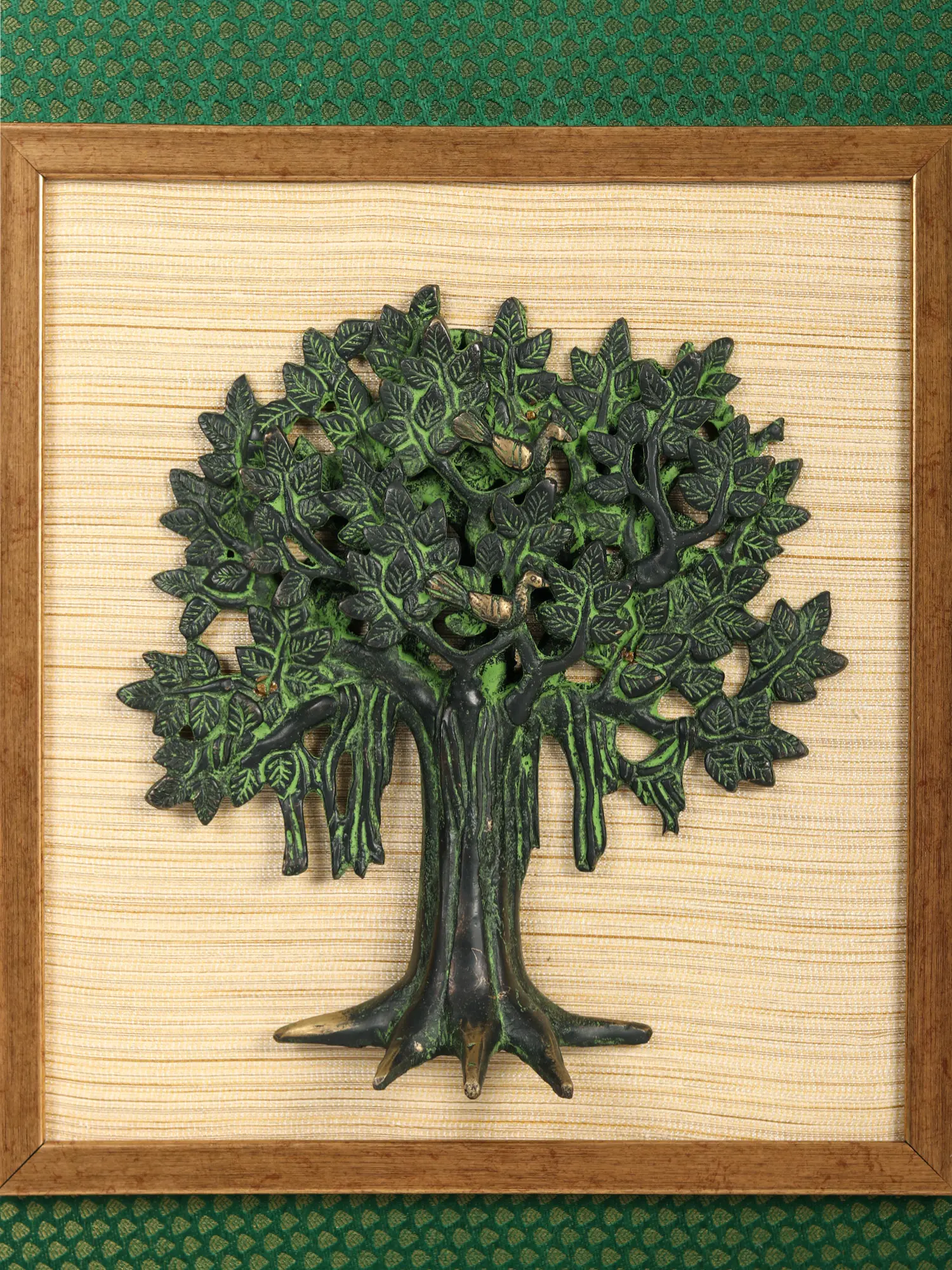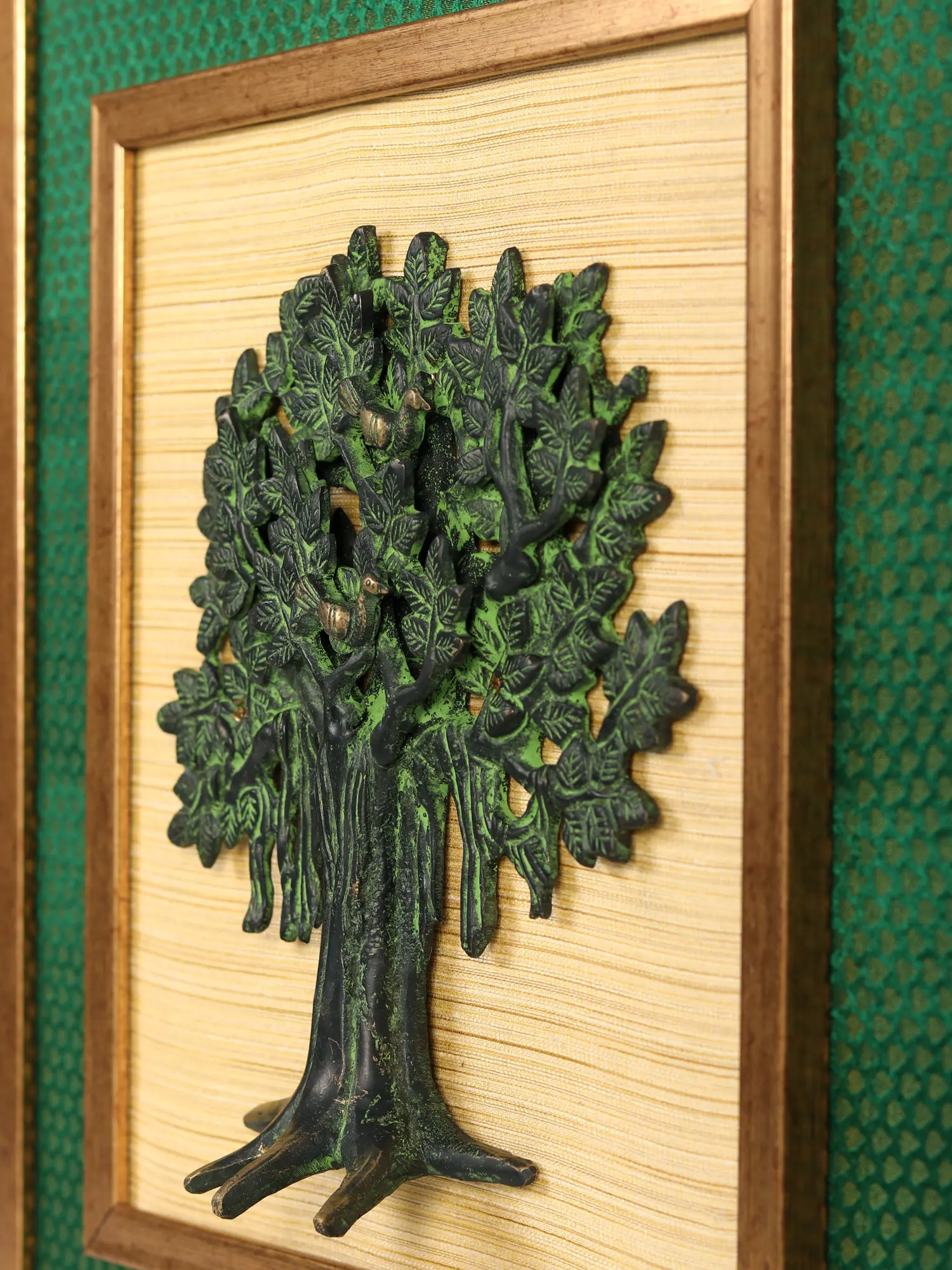 Wooden Wall Frame with Brass Tree and Bird Sculpture