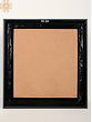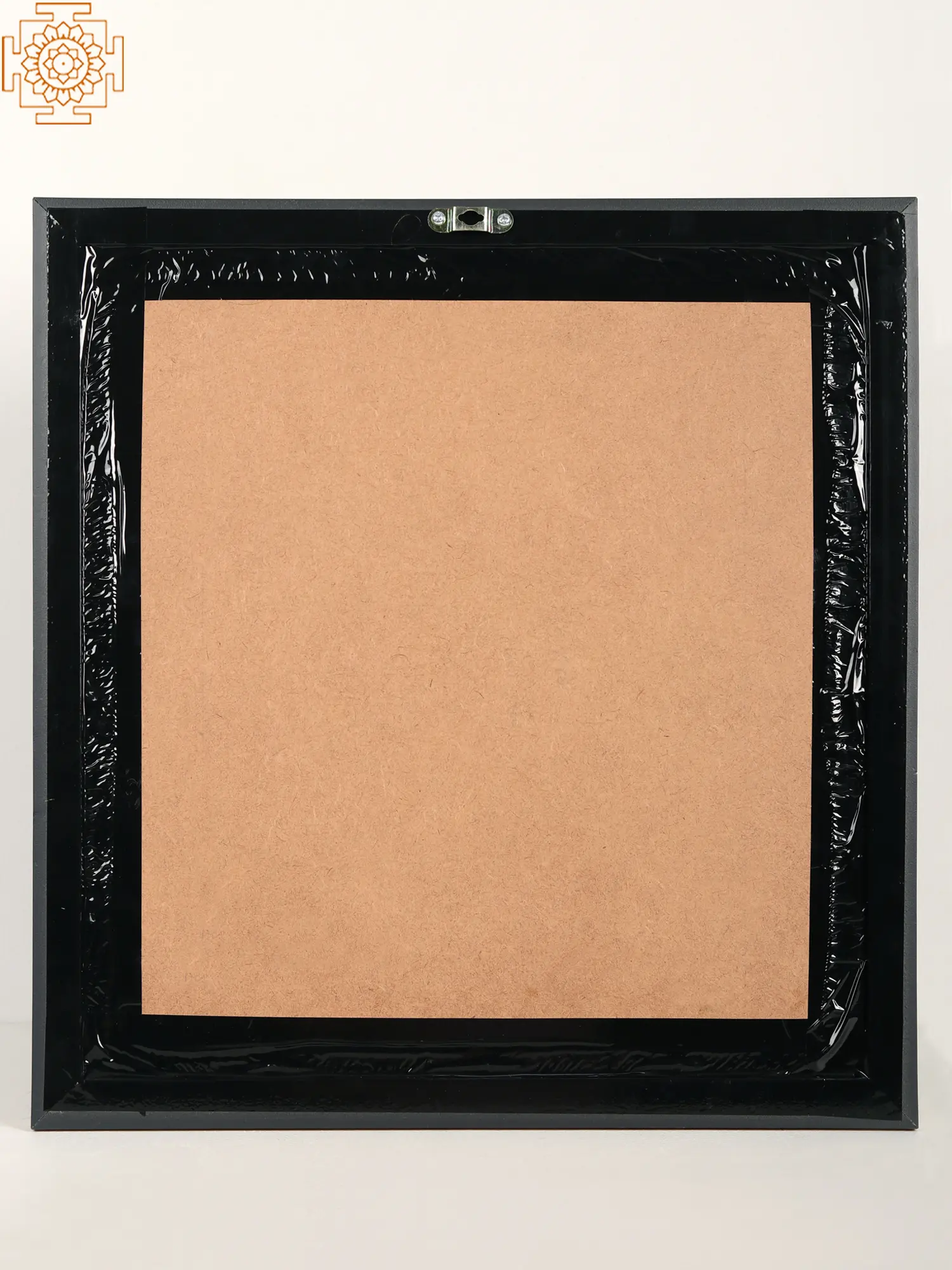• The central artwork is mounted on a textured, light-colored fabric background within a wooden frame.