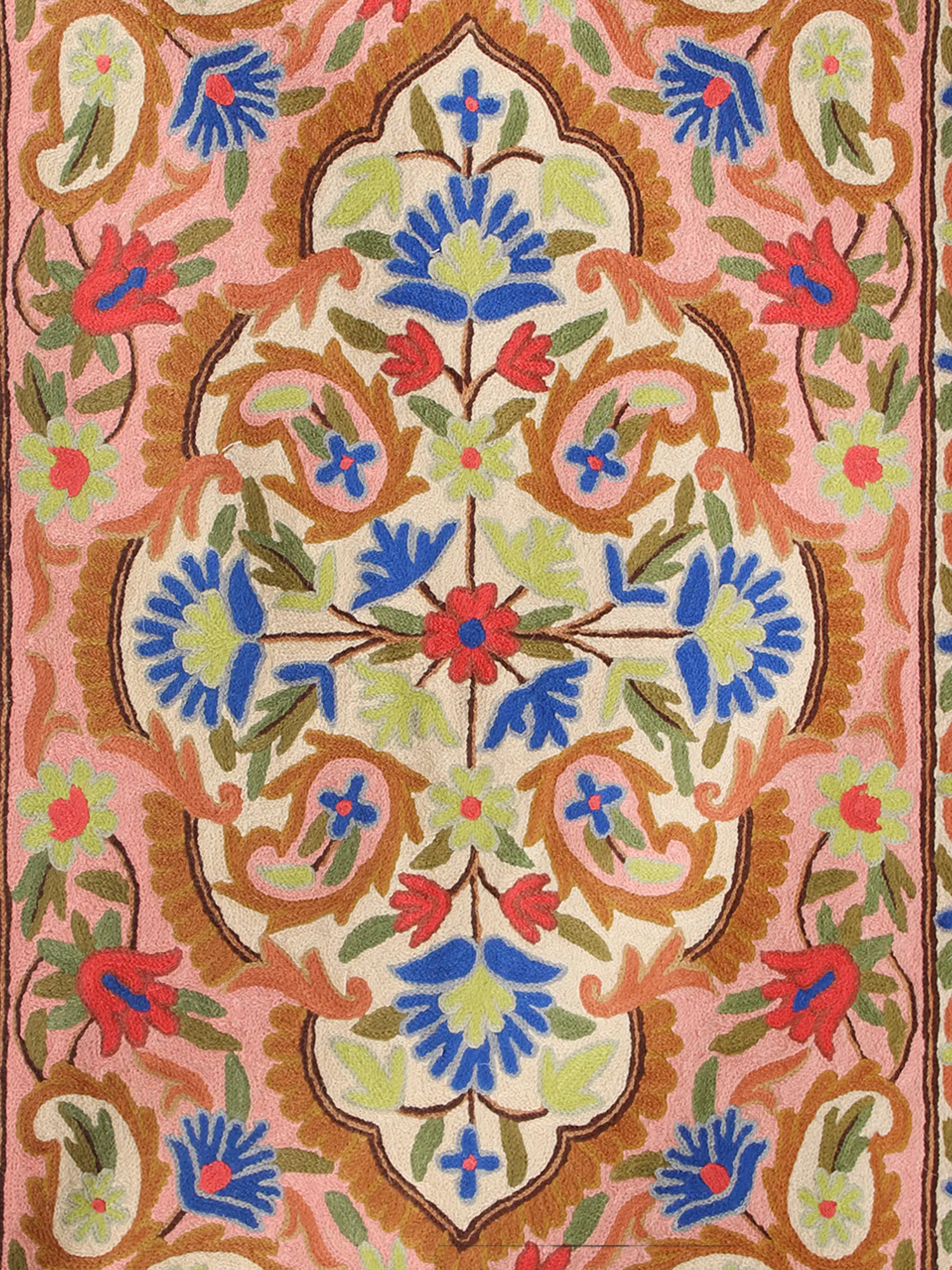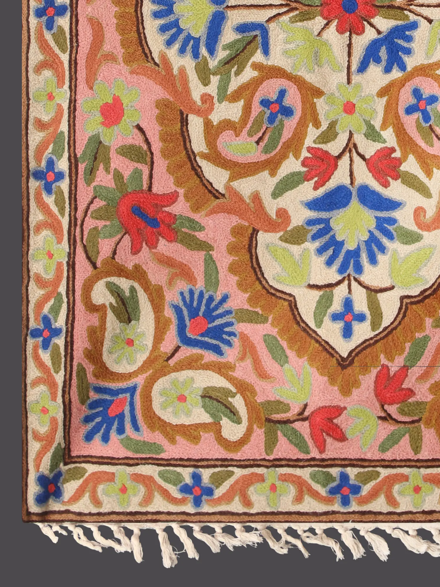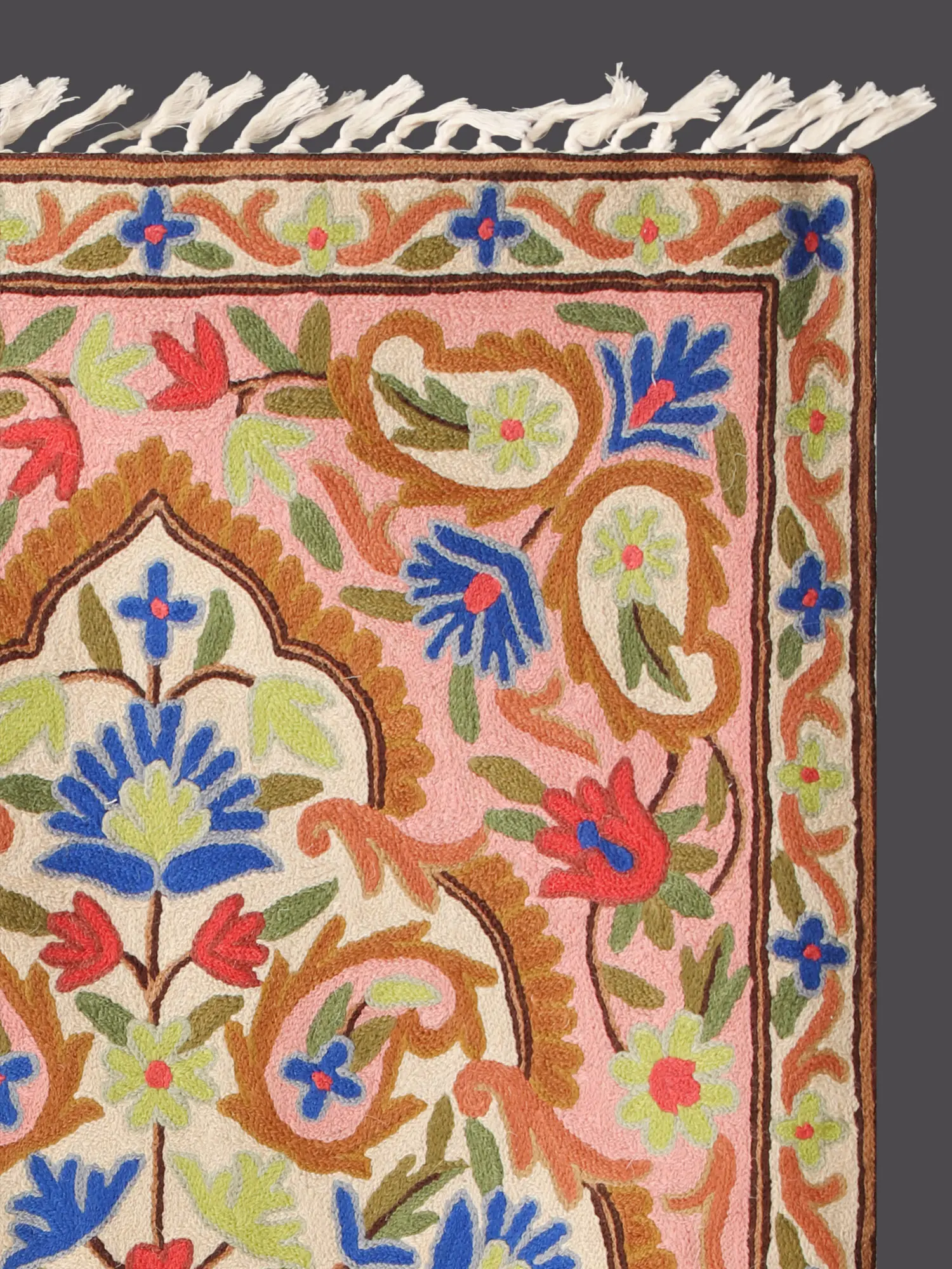 Wool Thread Hand-Embroidered Mughal Motif Rug with Pink and White Accents