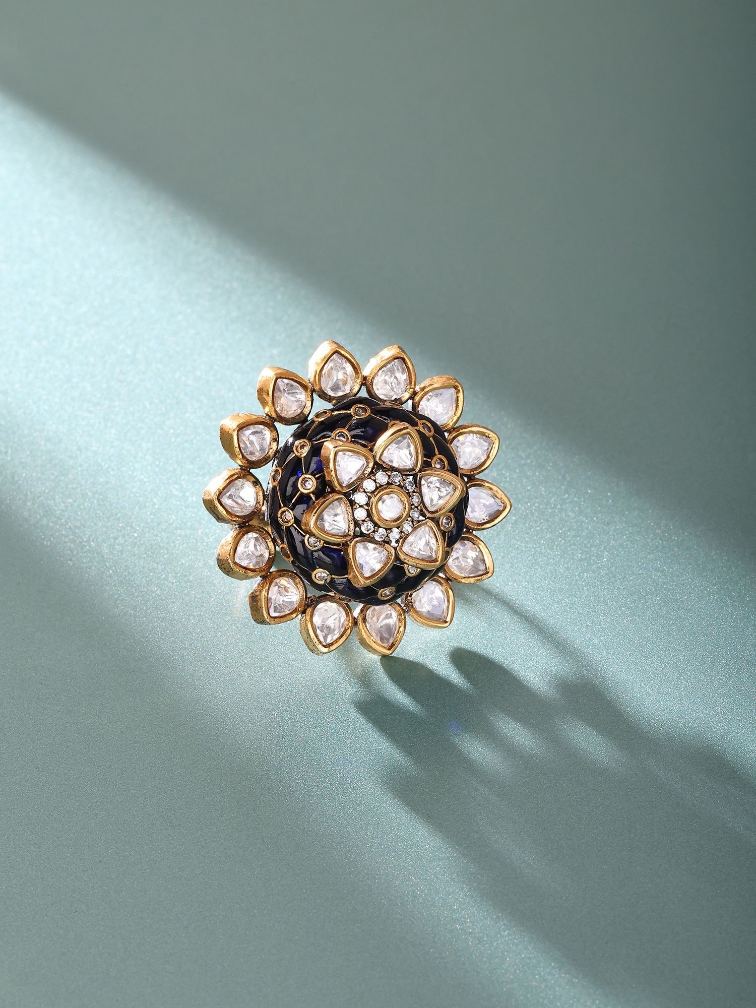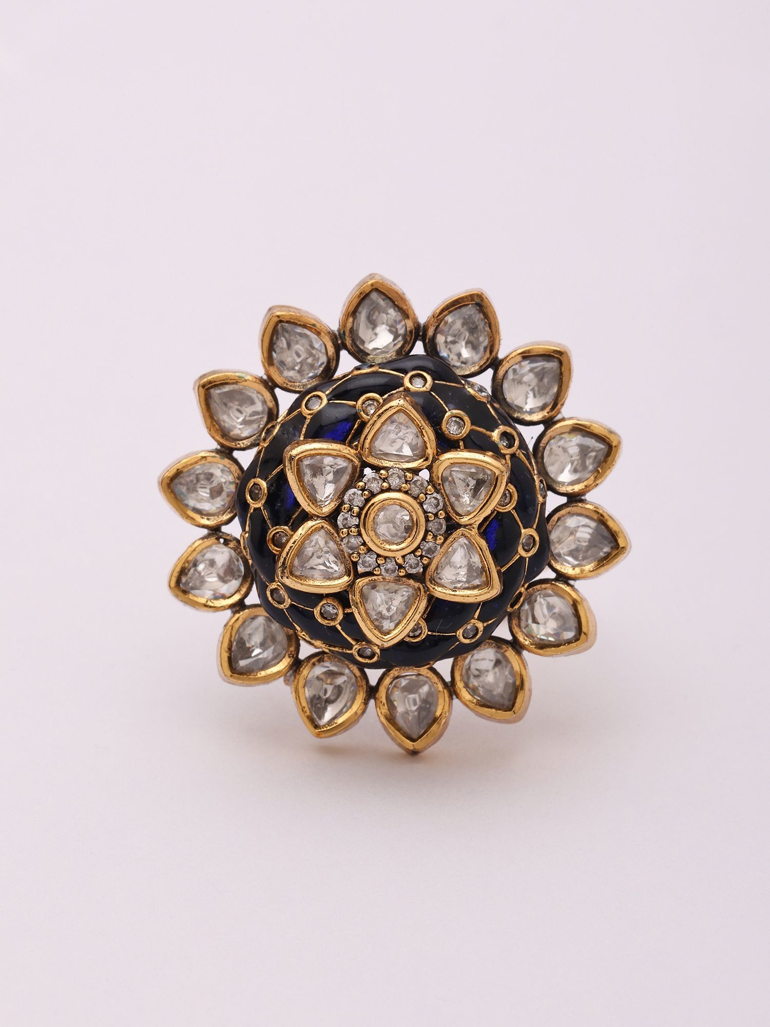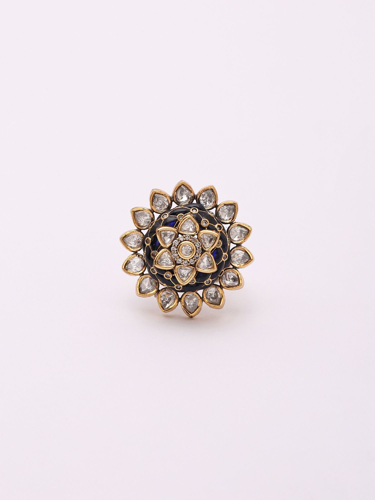 The deep blue enamel center provides a striking contrast to the stones.