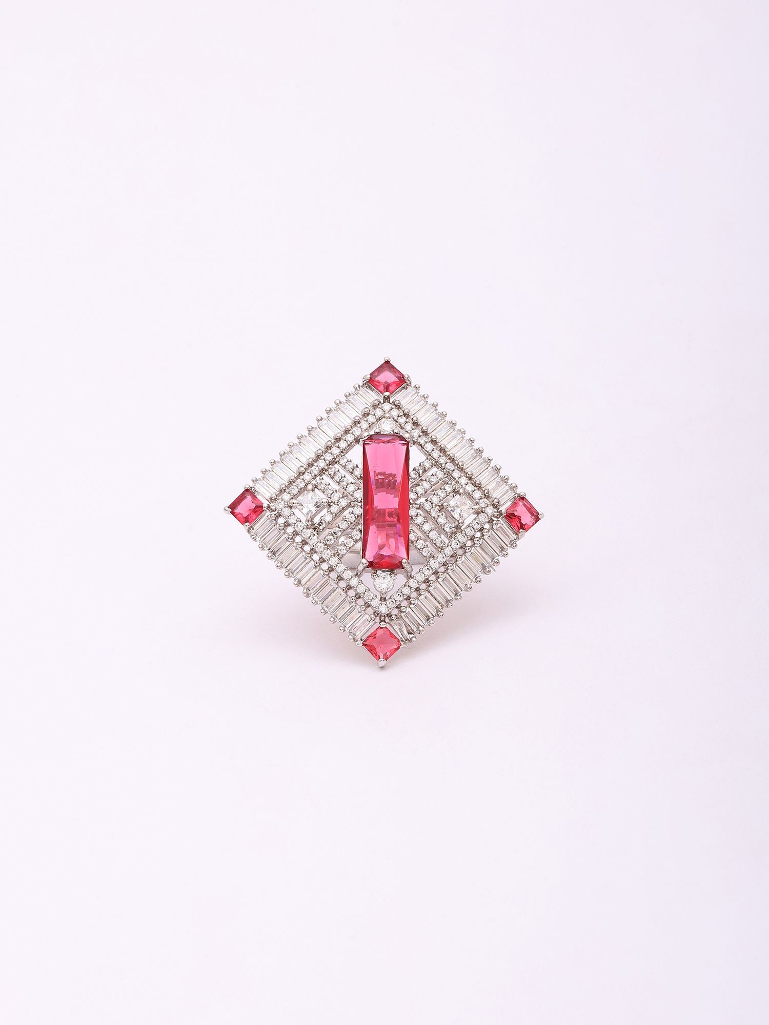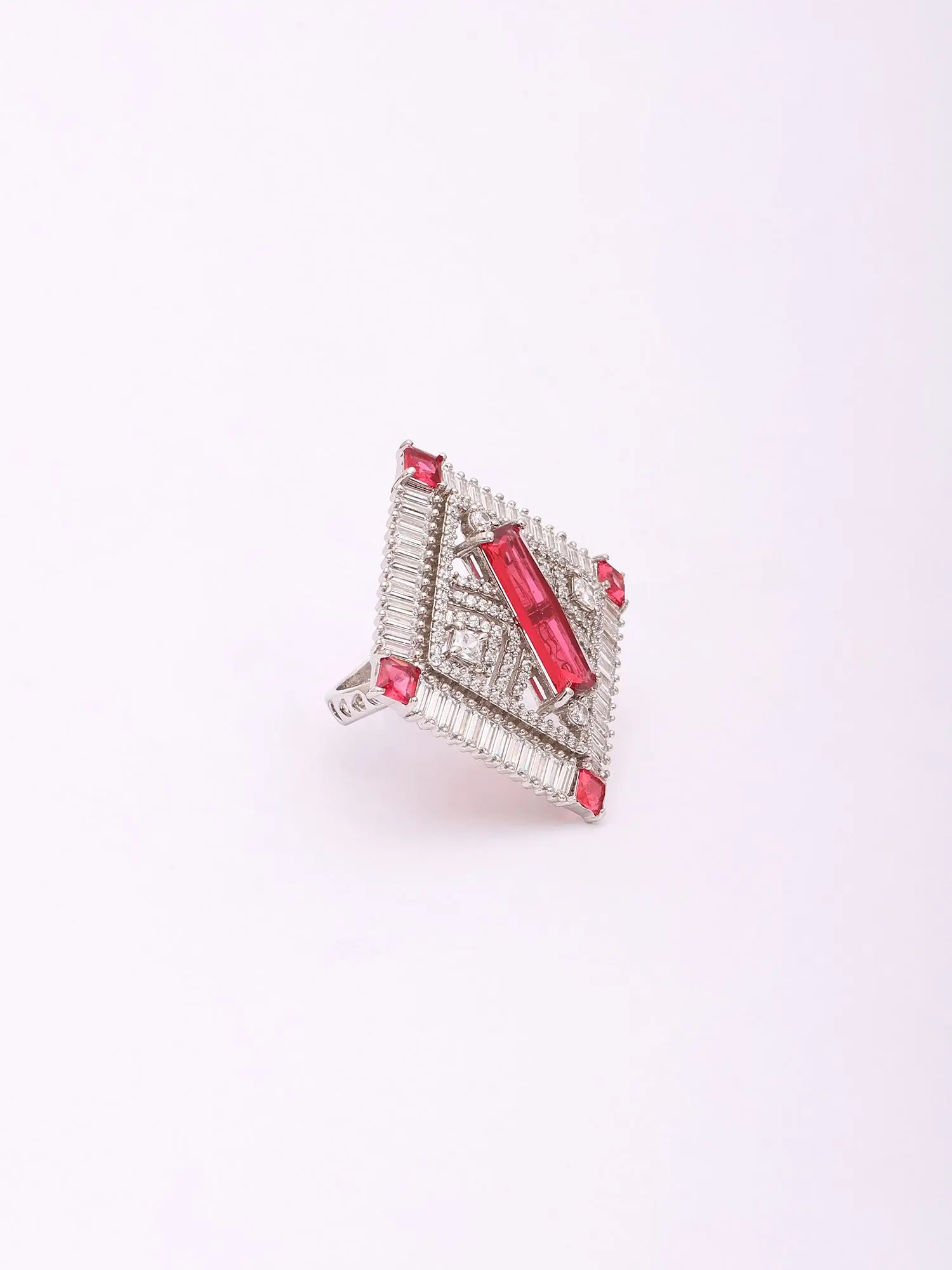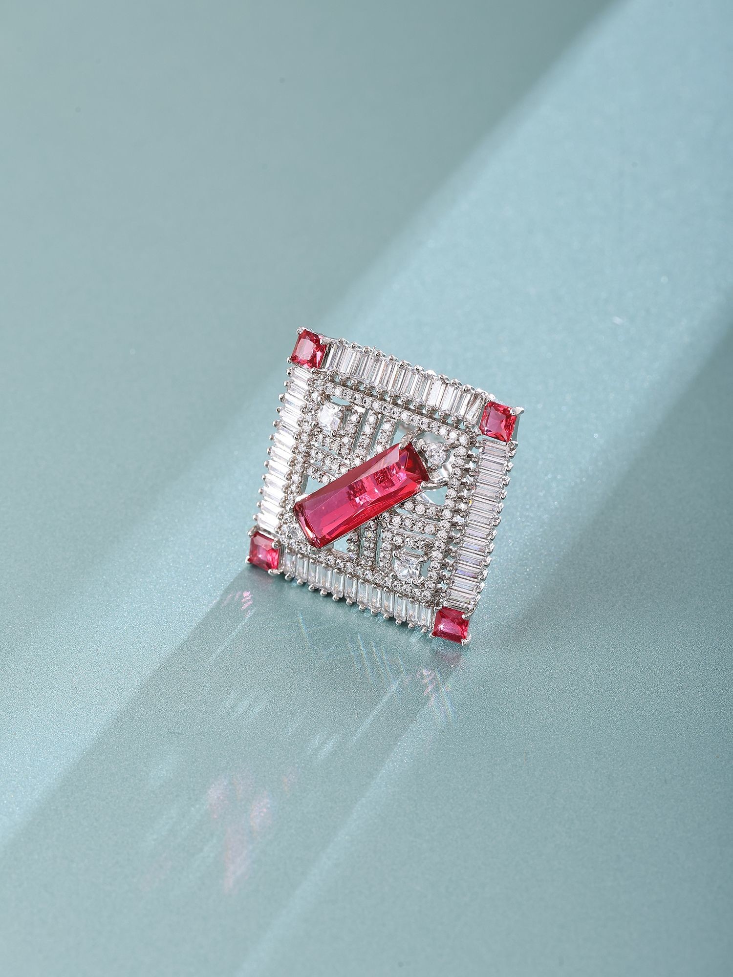 Experience the dedication of artisanal craftsmanship in every facet of this piece. Forged from lustrous sterling silver, its foundation offers a rich, enduring gleam. The design is meticulously brought to life through the precise setting of brilliant baguette-cut crystals, arranged to form a captivating geometric frame, interspersed with vibrant red stones that add a focal point of captivating color.