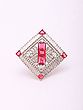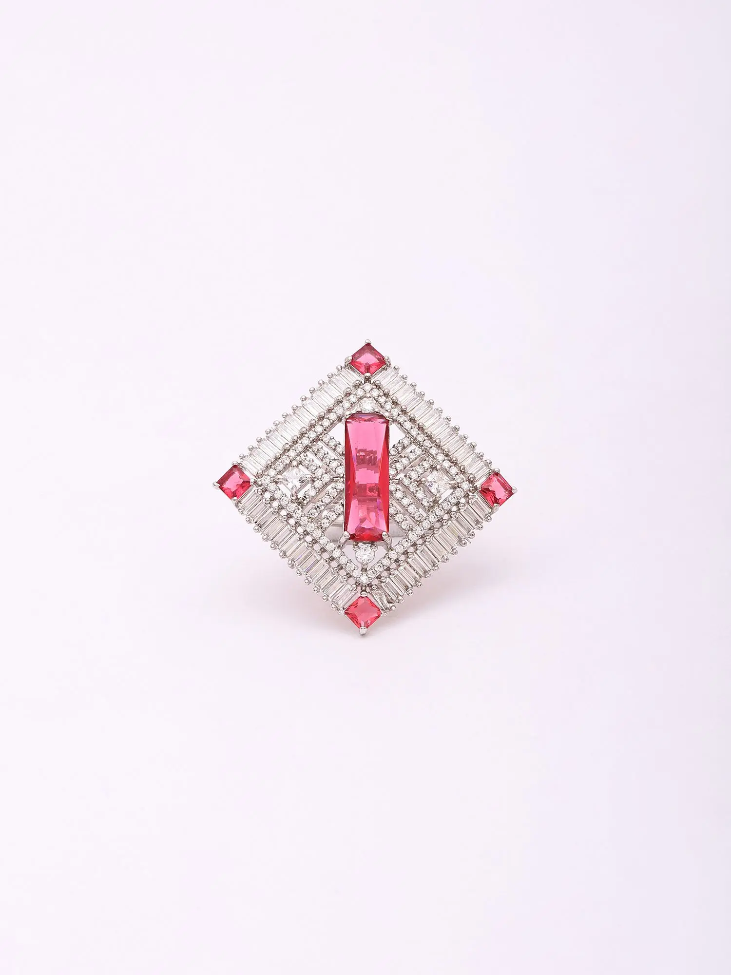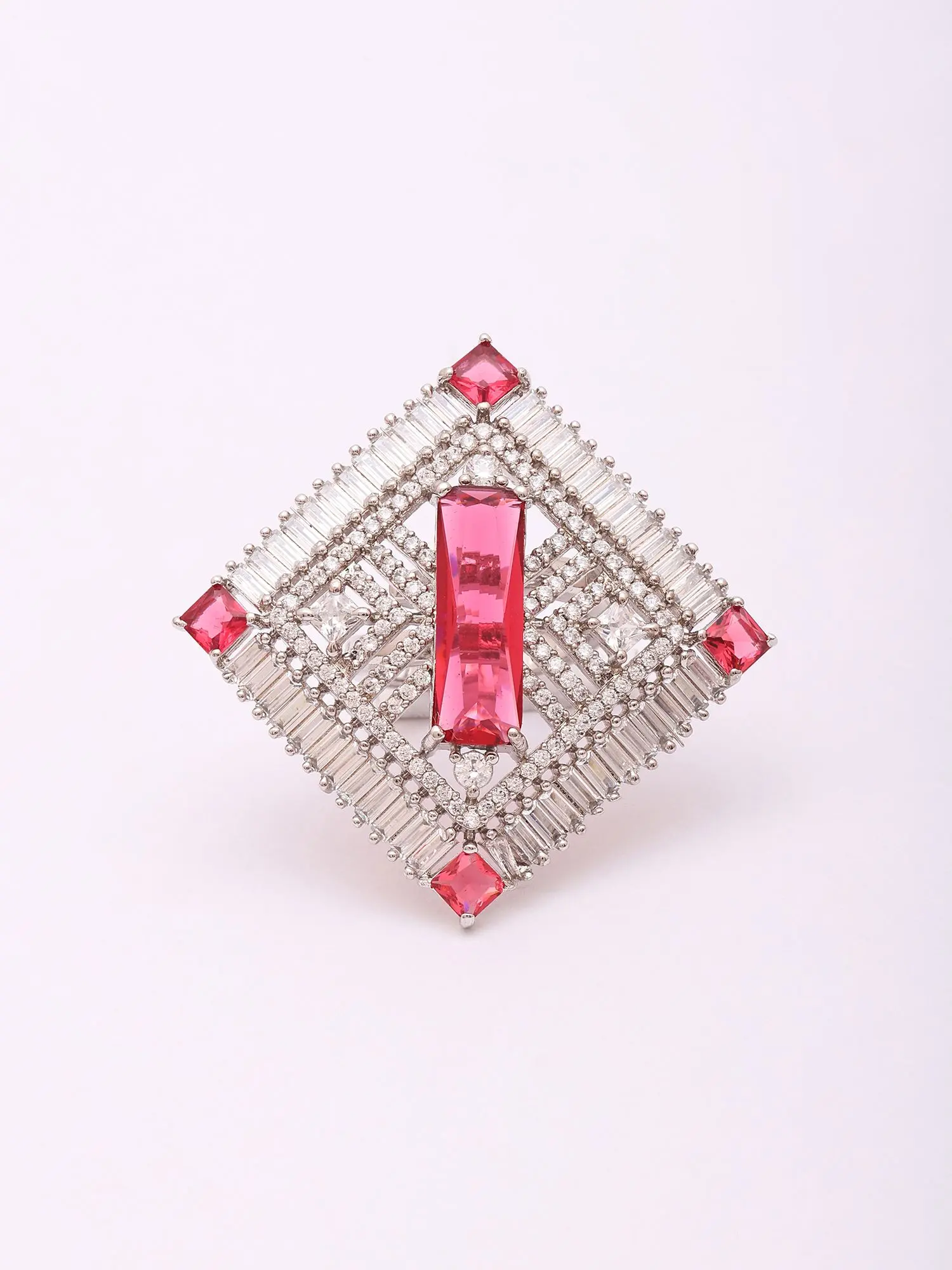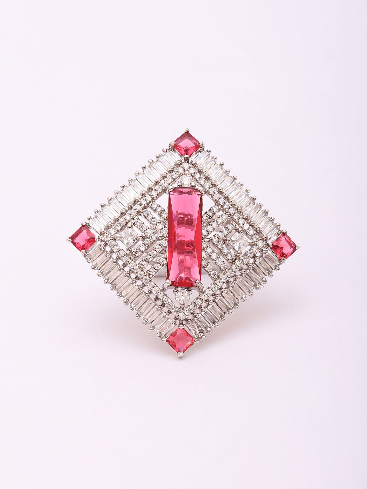 Experience the dedication of artisanal craftsmanship in every facet of this piece. Forged from lustrous sterling silver, its foundation offers a rich, enduring gleam. The design is meticulously brought to life through the precise setting of brilliant baguette-cut crystals, arranged to form a captivating geometric frame, interspersed with vibrant red stones that add a focal point of captivating color.