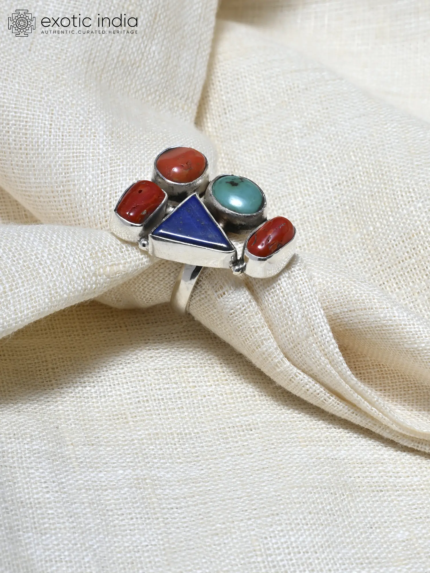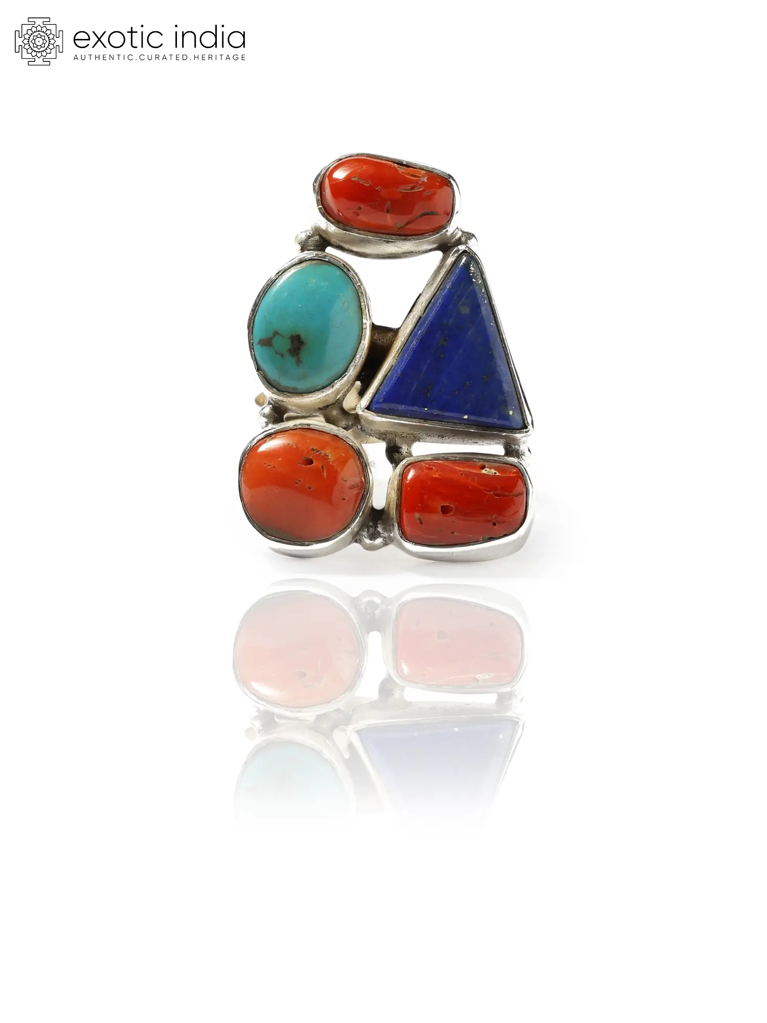 The heart of this ring lies in its intricate design. A collection of vibrantly colored gemstones are individually set and arranged in a cluster that provides visual interest and a unique aesthetic. The selection of stones includes a bold turquoise, a calming contrast to the warm coral stones. Finally, a deep blue Lapis Lazuli is cut into a triangle shape that complements the other circular or oval stones. The choice of shapes and hues work in harmony to create a captivating design. The ring's band is crafted from sterling silver, known for its durability and timeless appeal. The smooth, polished finish of the silver provides the perfect backdrop for the gemstones, enhancing their natural brilliance. The design allows the ring to be adjusted for a comfortable fit.