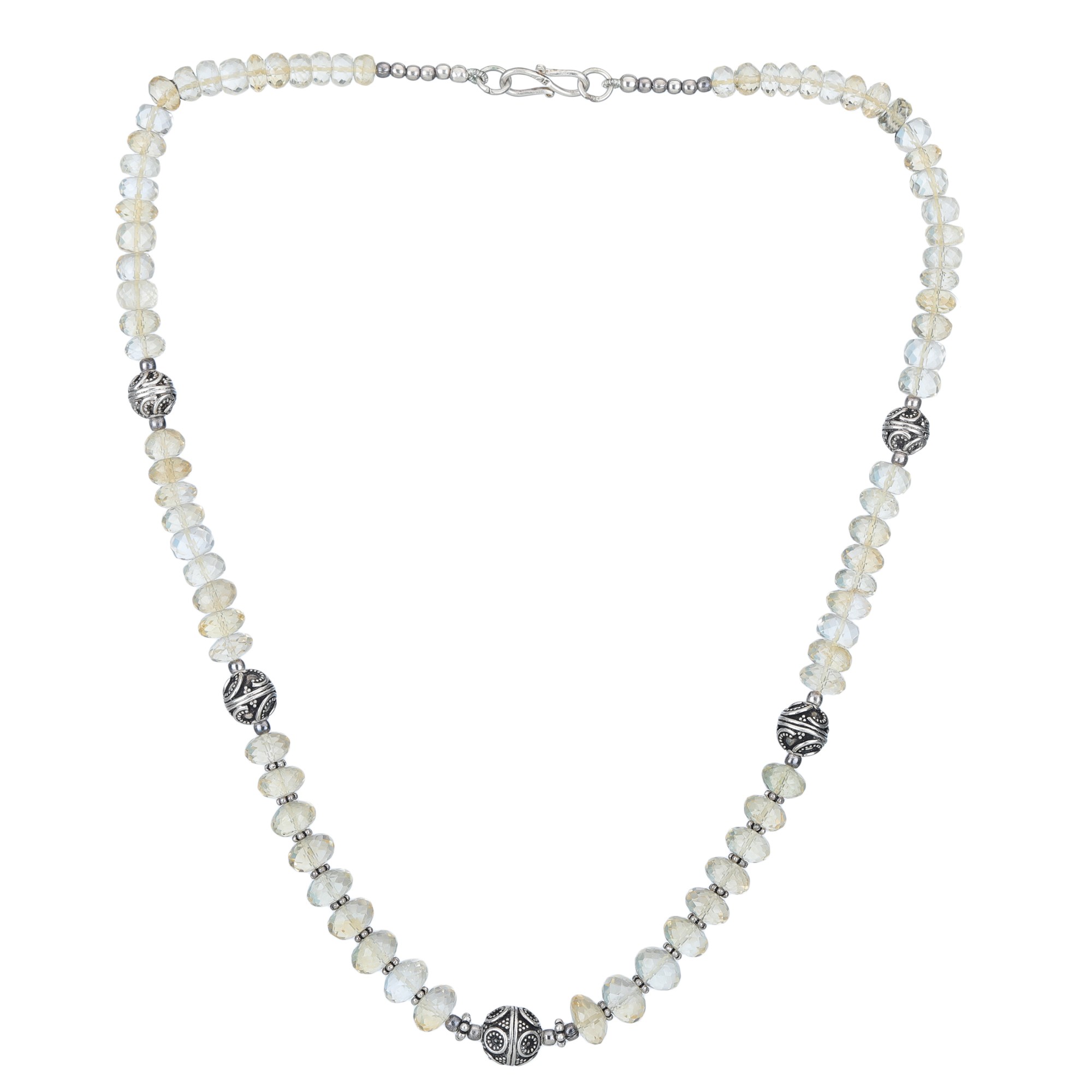 The sterling silver elements are not mere accents; they are integral to the necklace's overall aesthetic. The intricately designed silver beads punctuate the citrine stones, adding a touch of vintage charm and intricate detail. The filigree work on the silver beads showcases exceptional craftsmanship, each tiny curl and detail meticulously hand-finished for a truly luxurious feel. The lobster clasp ensures a secure and comfortable closure, while its simple design maintains the necklace's overall refined look. The combination of the lustrous silver and the glowing citrine creates a harmonious balance, resulting in a truly unforgettable piece of jewelry.