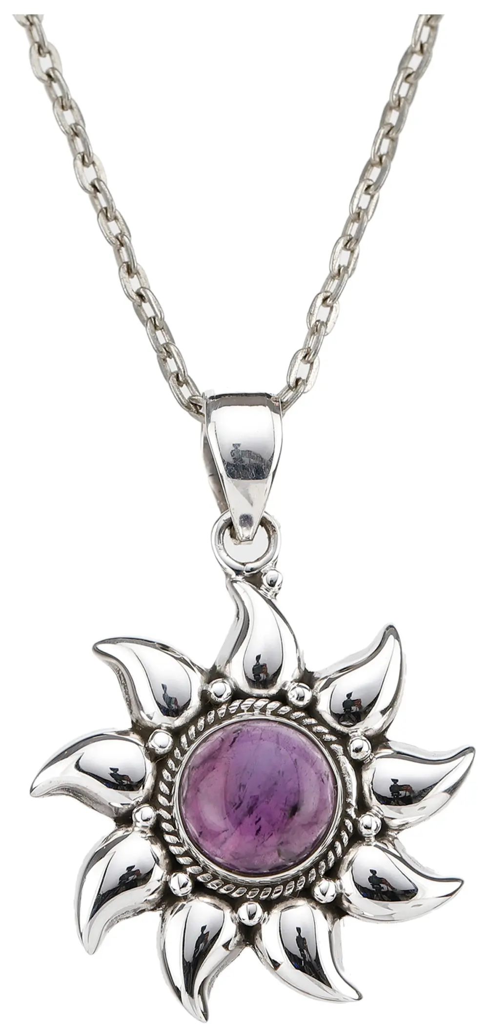 Made of sterling silver and amethyst, this pendant measures at 1.5 inch in height, and 1 inch in width. Weighing 11 grams, it is neither too heavy nor light. At the perfect weight, this statement jewelry brings elegance and grace to the wearer. The pendant is moulded into an inverted tear-drop shape, with the purple amethyst encrusted as the centrepiece. Amethyst is known for its healing properties, and the natural calming effects to soothe and dispel mood swings, rage, fear and anxiety. On the borders of the amethyst, are layers of repeated circular and triangular motifs, tracing the shape of the pendant.