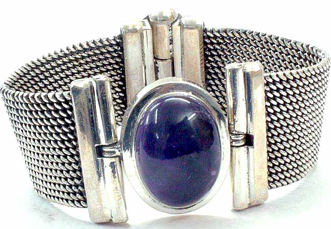 At the heart of the bracelet lies a captivating amethyst gemstone. This oval-shaped stone is securely bezel-set in a sleek, polished silver frame, allowing its rich, deep purple hue to take center stage. The amethyst's captivating color is known for its calming and spiritual properties, adding not only beauty but also a touch of mindful energy to your look. The smooth, polished surface of the gemstone reflects light beautifully, enhancing its vibrancy and depth.