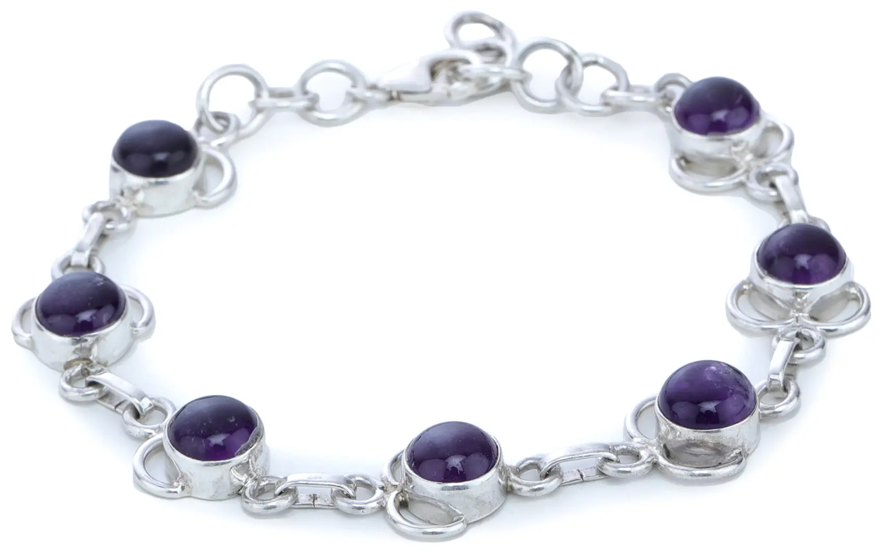 The construction of the bracelet showcases the perfect blend of artistry and precision. The round amethyst stones are held securely within intricately designed sterling silver settings that resemble a four-petal flower, adding a touch of whimsical charm. These settings are meticulously attached to the chain via links, creating a flexible and comfortable fit. The toggle clasp provides a secure and easy closure, ensuring that the bracelet stays safely in place. Its simple design blends seamlessly with the rest of the piece, maintaining the bracelet's overall elegant aesthetic. The sterling silver is polished to a lustrous shine, enhancing the beauty of both the metal and the gemstones.