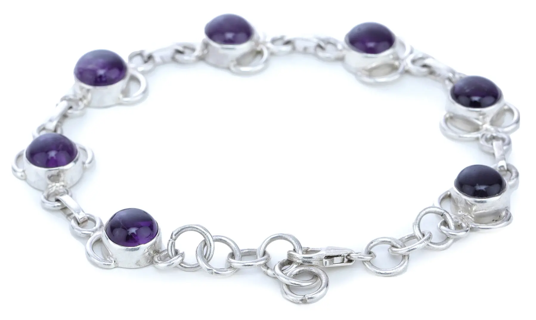 Embrace the understated beauty of this exquisite bracelet. Crafted with meticulous attention to detail, this piece is more than just an accessory; it's a statement of refined taste. The smooth, polished sterling silver chain gracefully encircles the wrist, creating a delicate shimmer that catches the light with every movement. The deep, captivating hues of the amethyst stones add a touch of mystique and sophistication. Each gemstone is carefully selected for its rich color and clarity, ensuring a captivating visual experience. The placement of the stones along the chain creates a balanced and harmonious design, adding to the bracelet's overall allure.
