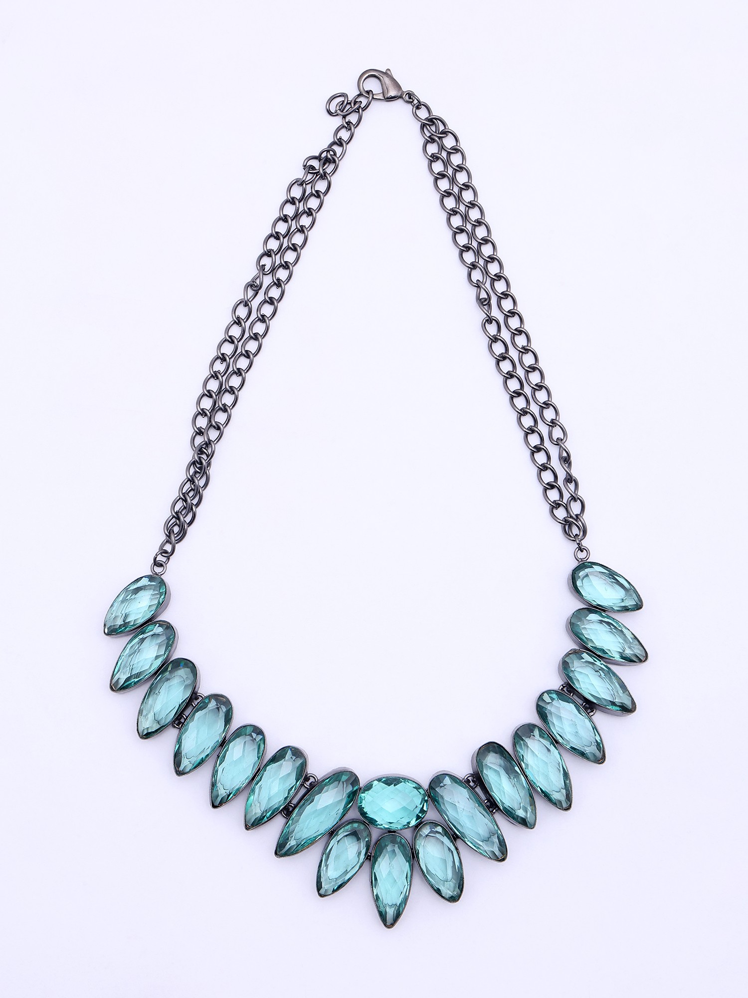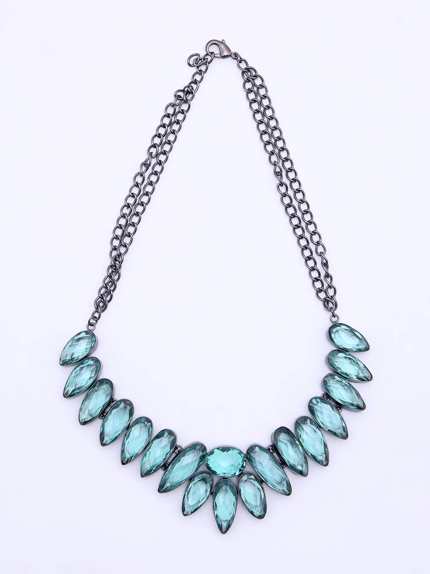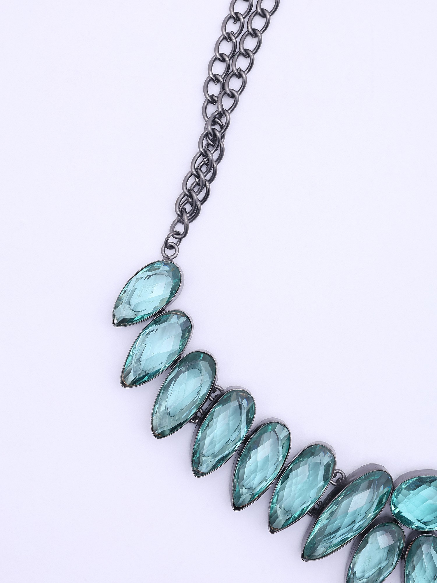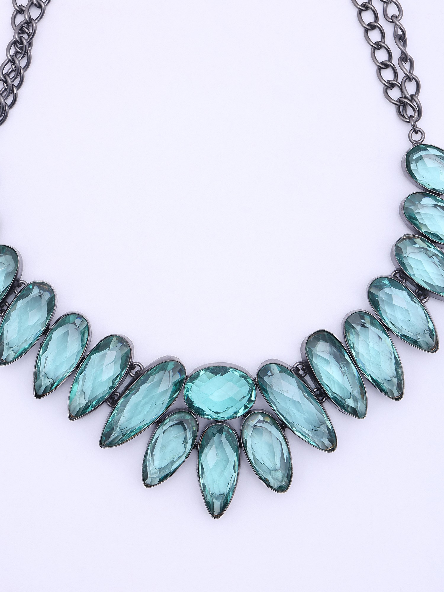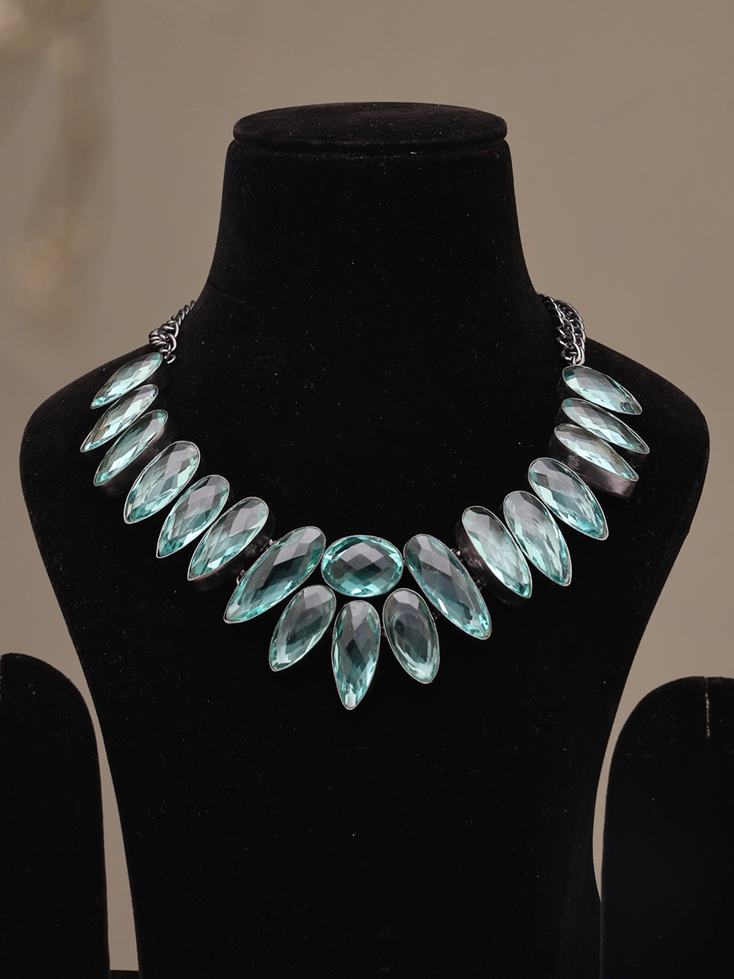 The arrangement of the aqua-toned stones creates a mesmerizing, fan-like cascade. The necklace chain, measuring 11 inches, provides an elegant drape, while the front end, extending 4.3 inches, forms a striking focal point. Each faceted stone is precisely cut to refract light, creating an ethereal glow that mimics sunlight on water.