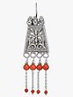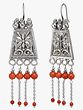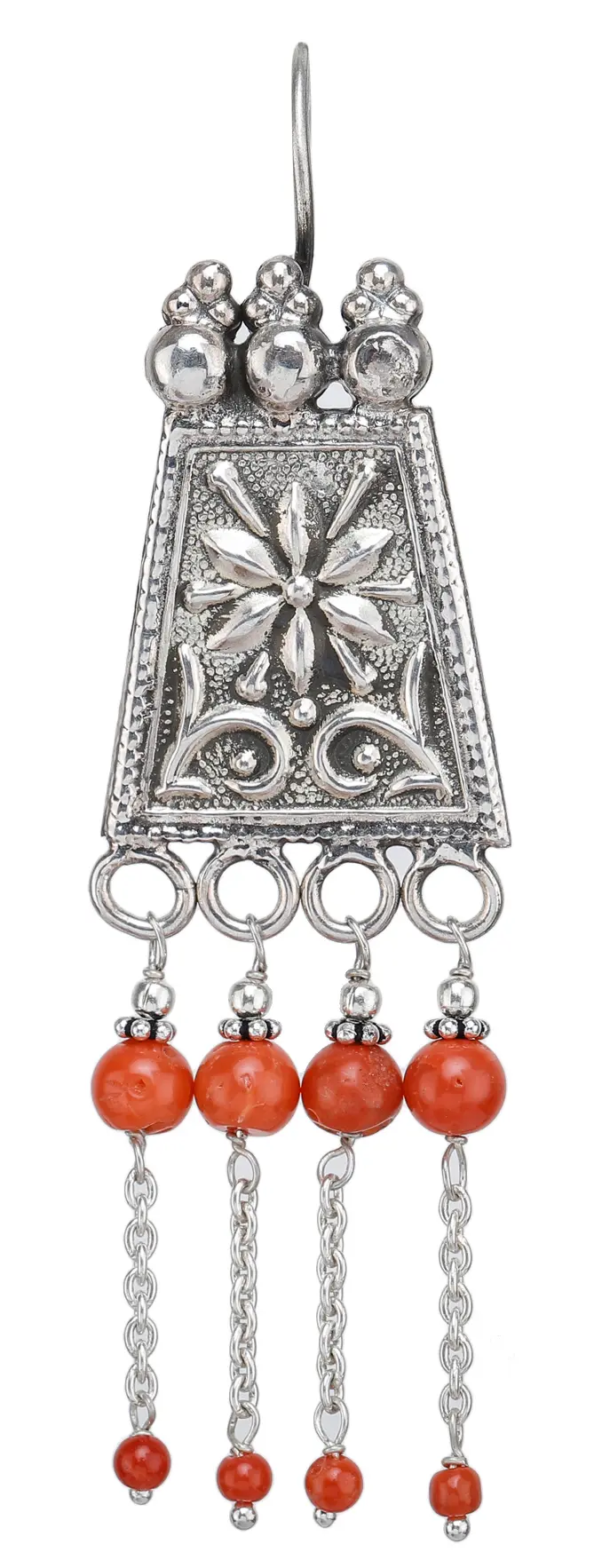 Cascading from the base of each silver pendant are multiple delicate sterling silver chains, each culminating in a smooth, round coral bead. The rich, warm hue of the coral provides a striking contrast to the cool sheen of the silver, imbuing the earrings with a lively and natural character. The coral beads are interspersed with small, textured silver accents, adding a refined finishing touch to each dangle. The gentle movement of the chains and beads creates a dynamic and alluring effect as you wear them, adding a subtle sway that enhances their visual appeal. These earrings are perfect for those who appreciate the fusion of bold color and classic design.