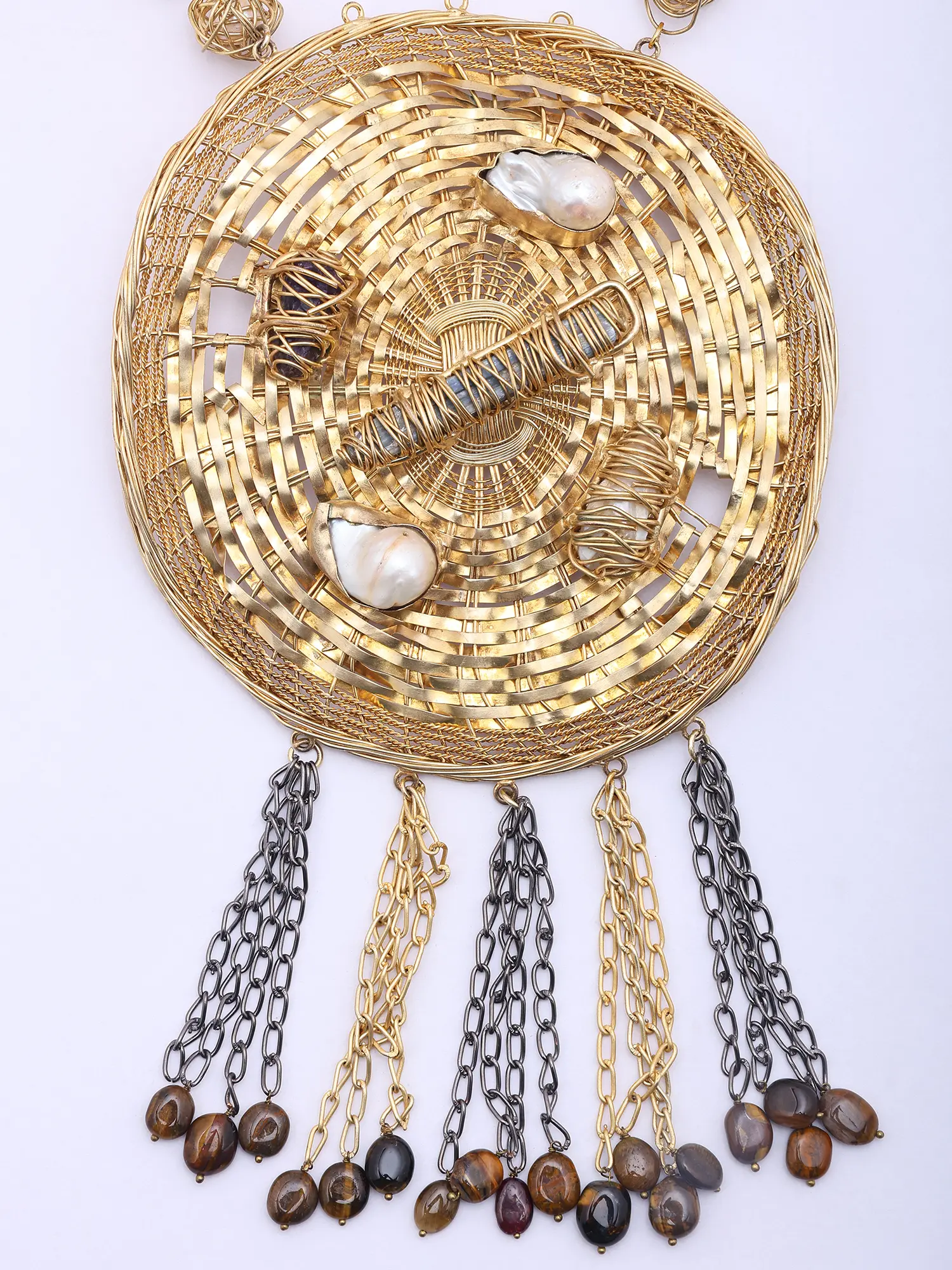 You'll appreciate the substantial yet graceful presence of this circular centerpiece, designed to be a captivating focal point. Its substantial diameter, complemented by the delicate yet durable brass chains that drape artfully below, creates a dynamic visual balance. The 24-inch length ensures it rests elegantly at the décolletage, providing a flattering frame for your neckline. The interplay of tightly woven brass and the subtle shimmer of embedded pearls offers a tactile and visual richness that is simply unparalleled.