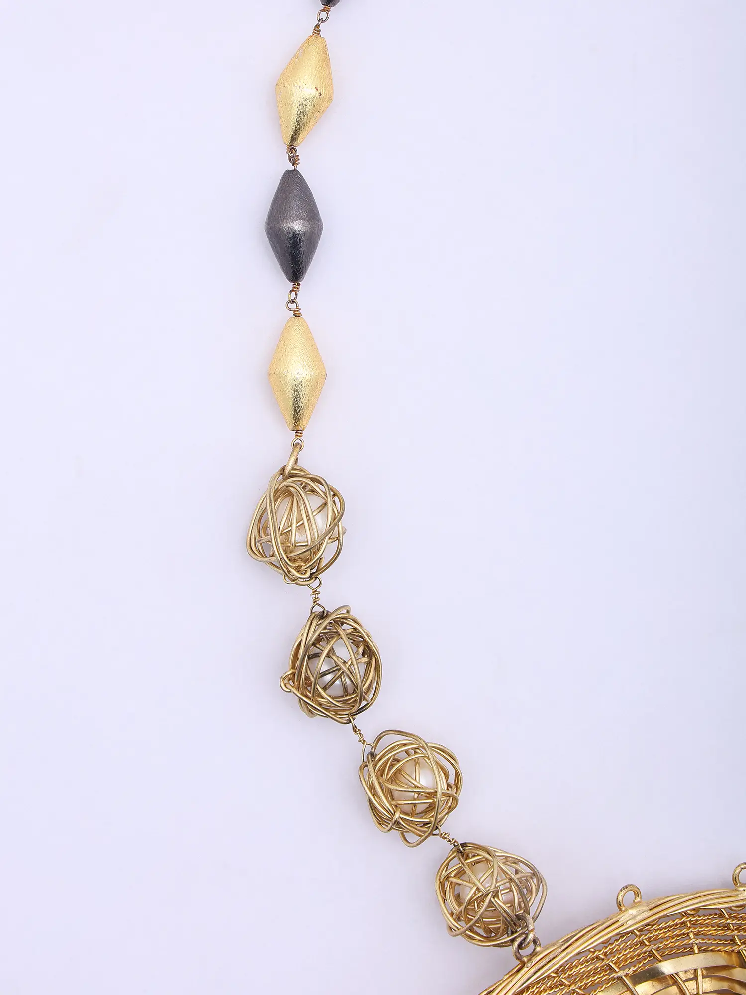 Discover the masterful artistry embedded within each meticulously shaped element. Fashioned from lustrous brass, this piece showcases an intricate woven design, reminiscent of time-honored textile techniques. Each strand is carefully manipulated and interlocked by skilled hands, creating a textured surface that gleams with a warm, inviting glow. The deliberate inclusion of natural pearls further enhances its organic beauty, adding a touch of iridescent elegance to the robust metalwork.