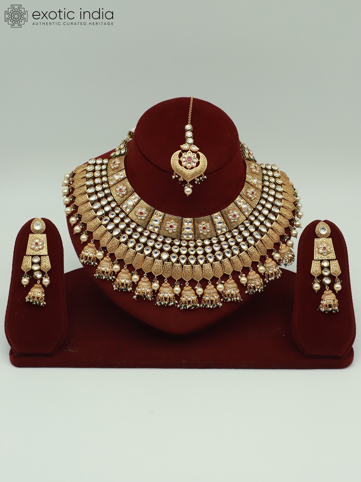 This exquisite necklace set, complete with matching earrings and a mangtika, is a breathtaking testament to traditional craftsmanship. The lustrous brass forms the foundation for a design that seamlessly blends the richness of heritage with a touch of modern sophistication. It’s an ensemble designed to make a lasting impression, perfect for those special occasions where you want to exude confidence and timeless beauty. The set presents a regal aesthetic that will complement a variety of traditional outfits. Whether it's for a wedding, a festive celebration, or any event where you want to stand out, this jewelry set will add a touch of glamour and sophistication to your look. It's a statement of elegance, designed to enhance your natural beauty and make you feel like royalty.