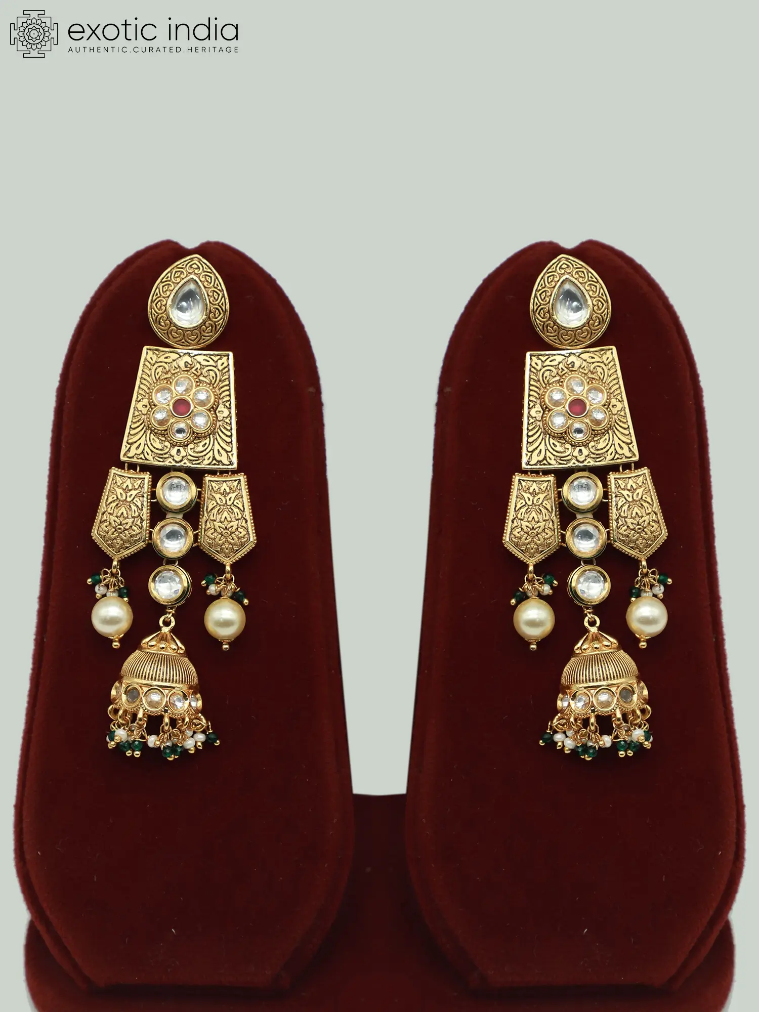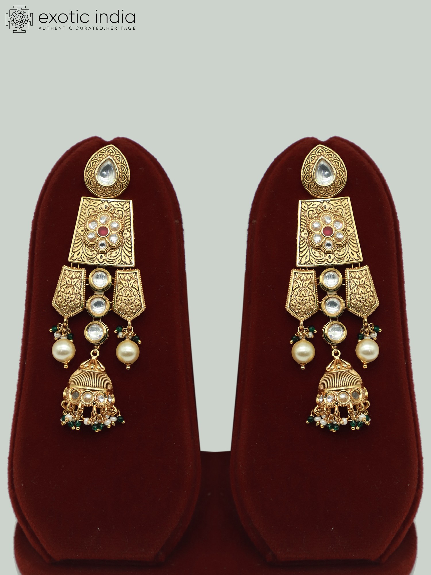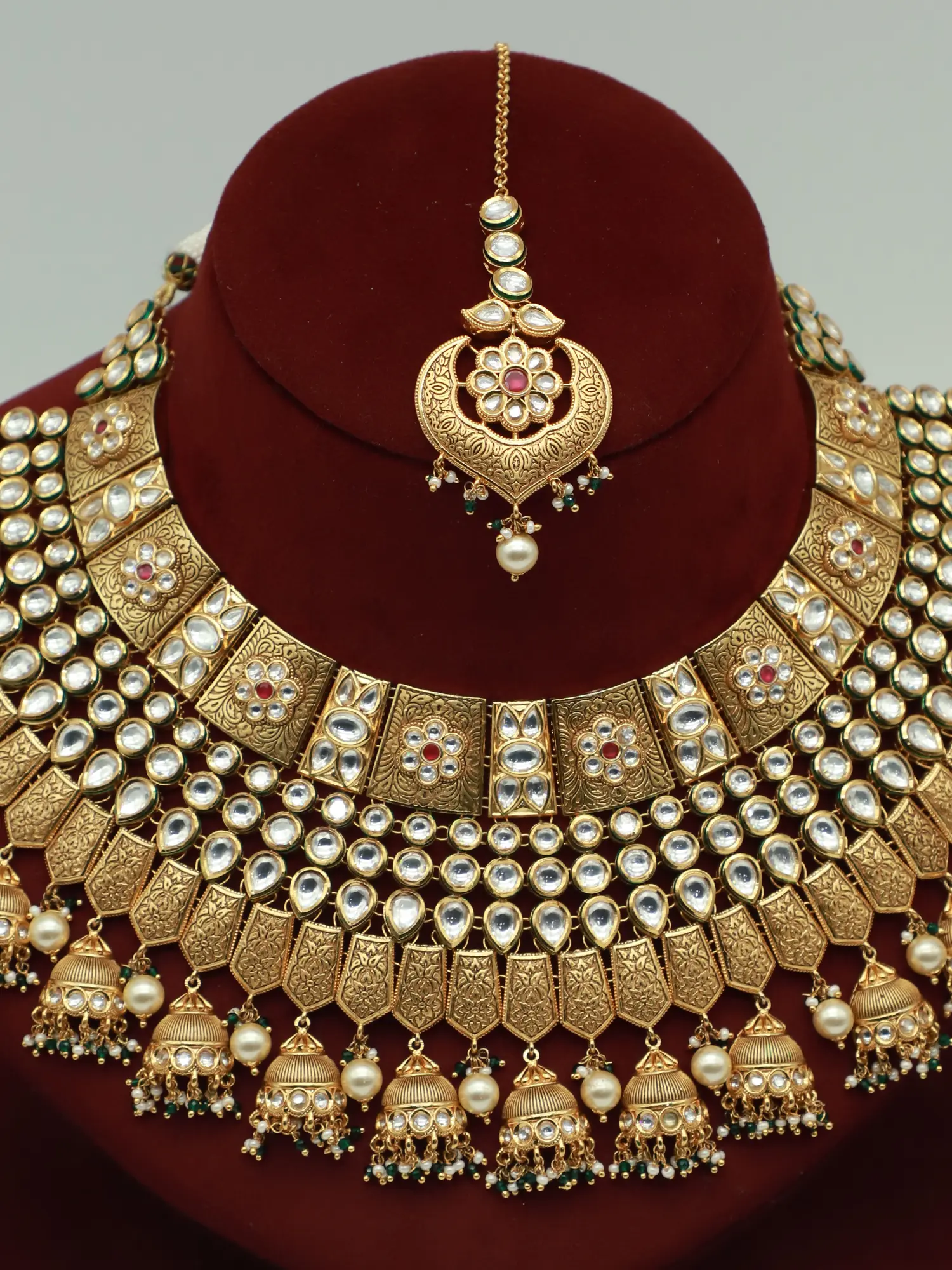 The centerpiece of this set is the necklace, an intricately designed masterpiece adorned with Kundan stones. These radiant stones, renowned for their brilliance and clarity, are carefully placed to create a dazzling effect that catches the light with every movement. The meticulous arrangement of the Kundan stones showcases the skill and artistry involved in creating this stunning piece of jewelry. Complementing the Kundan stones are delicate hanging beads that cascade from the necklace and earrings. These beads add a touch of whimsy and movement to the design, creating a captivating visual effect. The earrings echo the design elements of the necklace, featuring Kundan stones and hanging beads, creating a harmonious and balanced aesthetic. The mangtika, a traditional head ornament, completes the set, adding a final touch of grace and sophistication. It features a similar design with Kundan stones and a delicate pendant that dangles gracefully on the forehead. The brass base of the jewelry is finished with an antique gold tone. The antique gold finish lends an air of vintage charm to the piece, making it look like a treasured heirloom passed down through generations. This finish not only adds to the aesthetic appeal of the jewelry but also enhances its durability, ensuring that it will remain a cherished part of your collection for years to come.