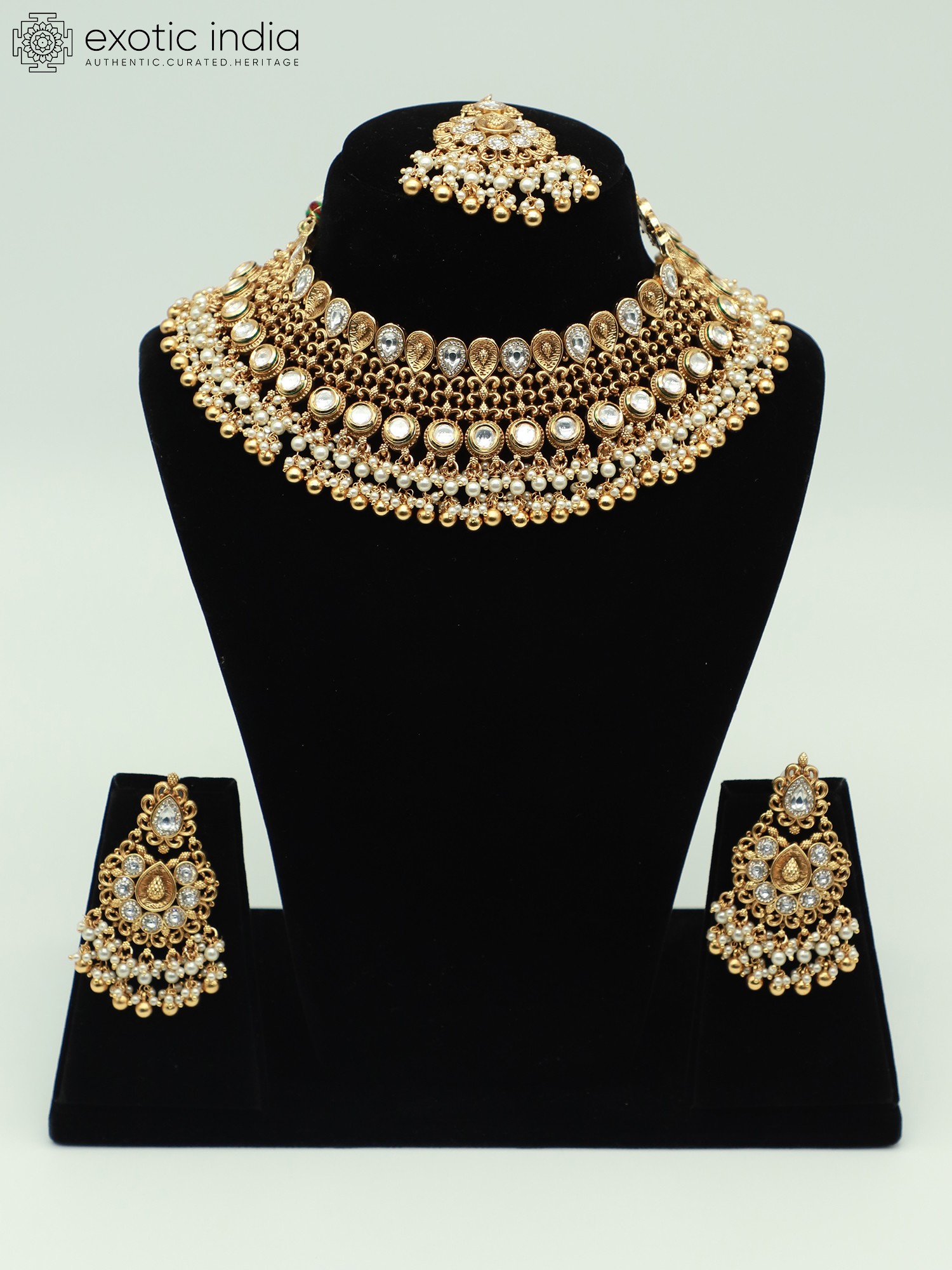 Kundan Studded Brass Necklace Set For Women With Earrings And Mangtika