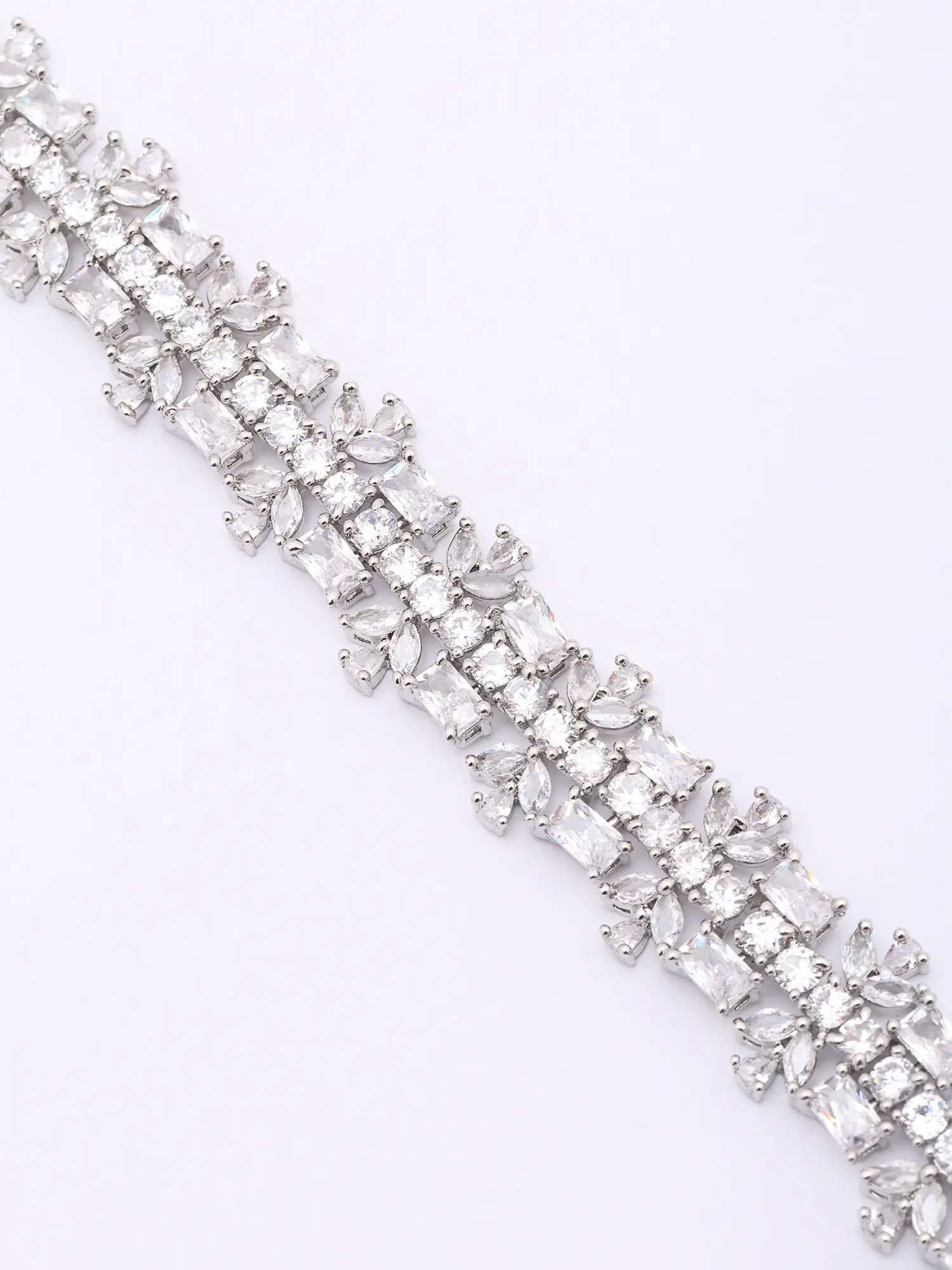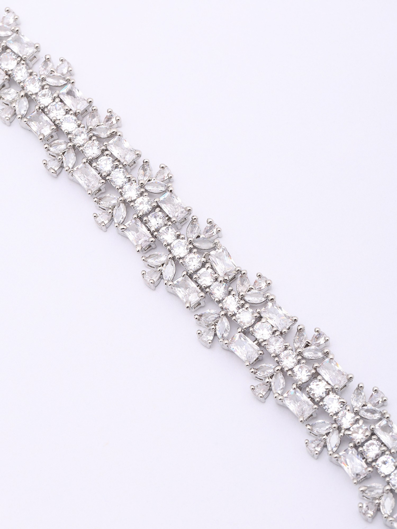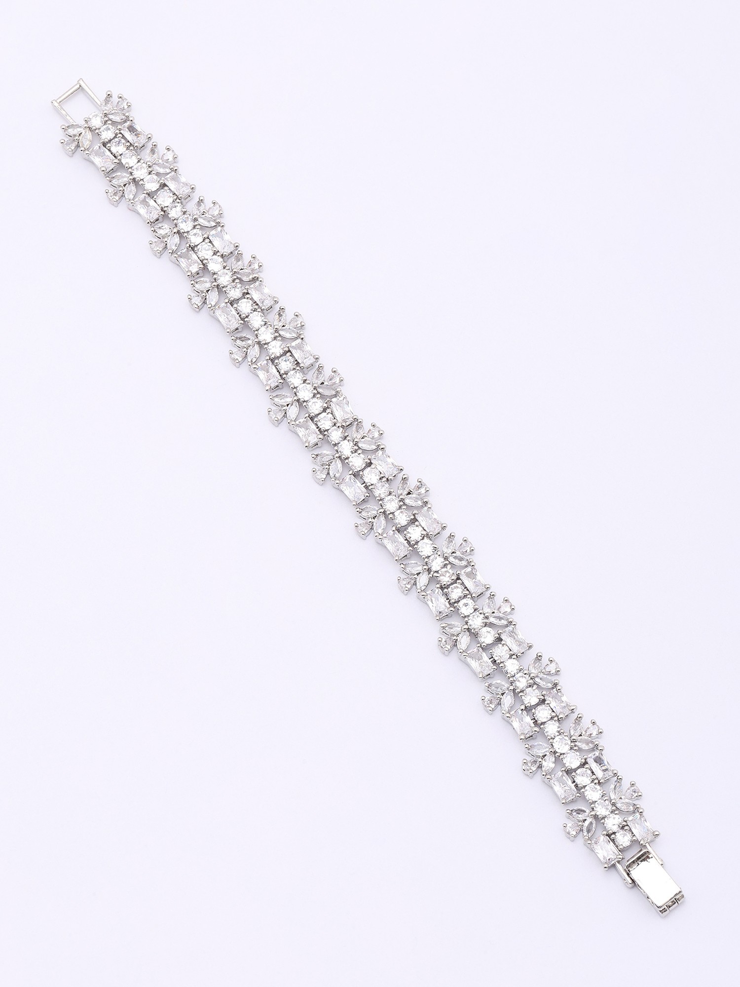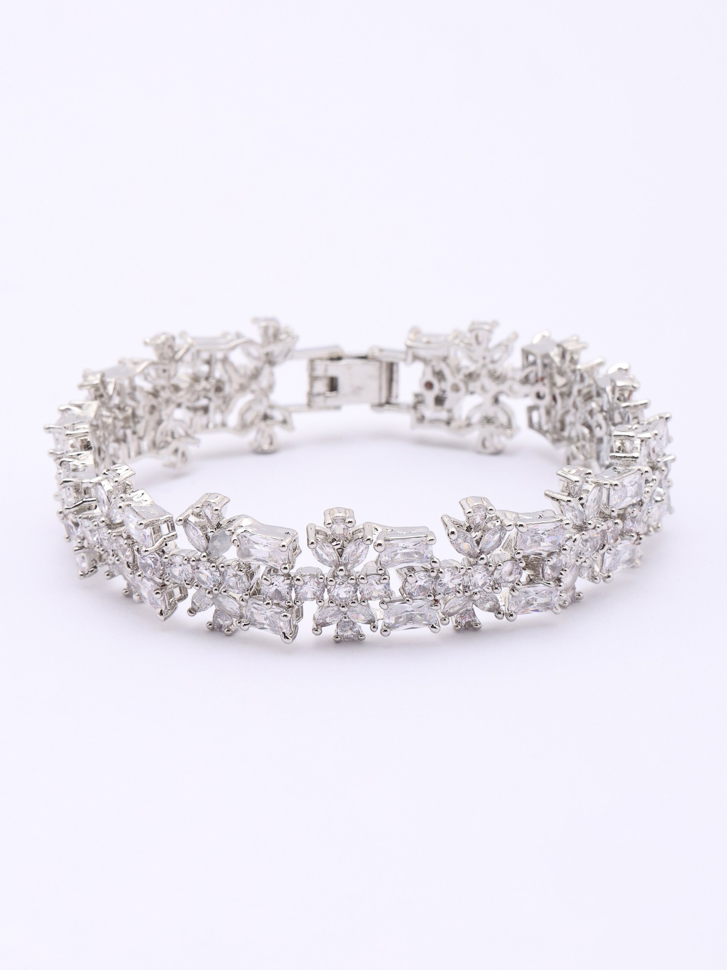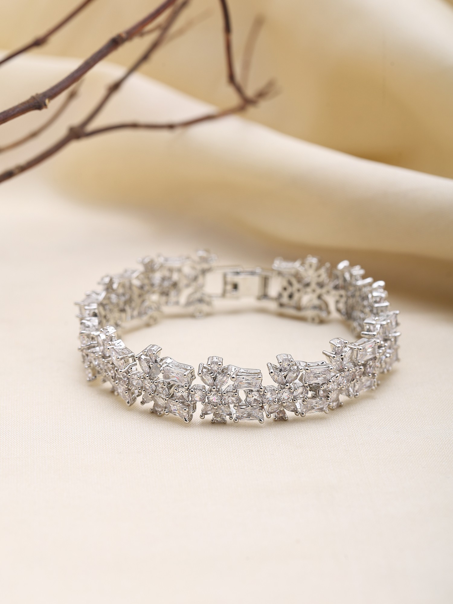 The captivating design features a rich tapestry of precisely cut American diamonds, arranged to create a breathtaking floral motif. Measuring a refined 0.5 inches in width, it gracefully encircles the wrist for a comfortable and flattering fit, extending to a versatile 7.5 inches in length. You'll notice how the interplay of baguette and round-cut stones creates a mesmerizing dance of light with every movement.