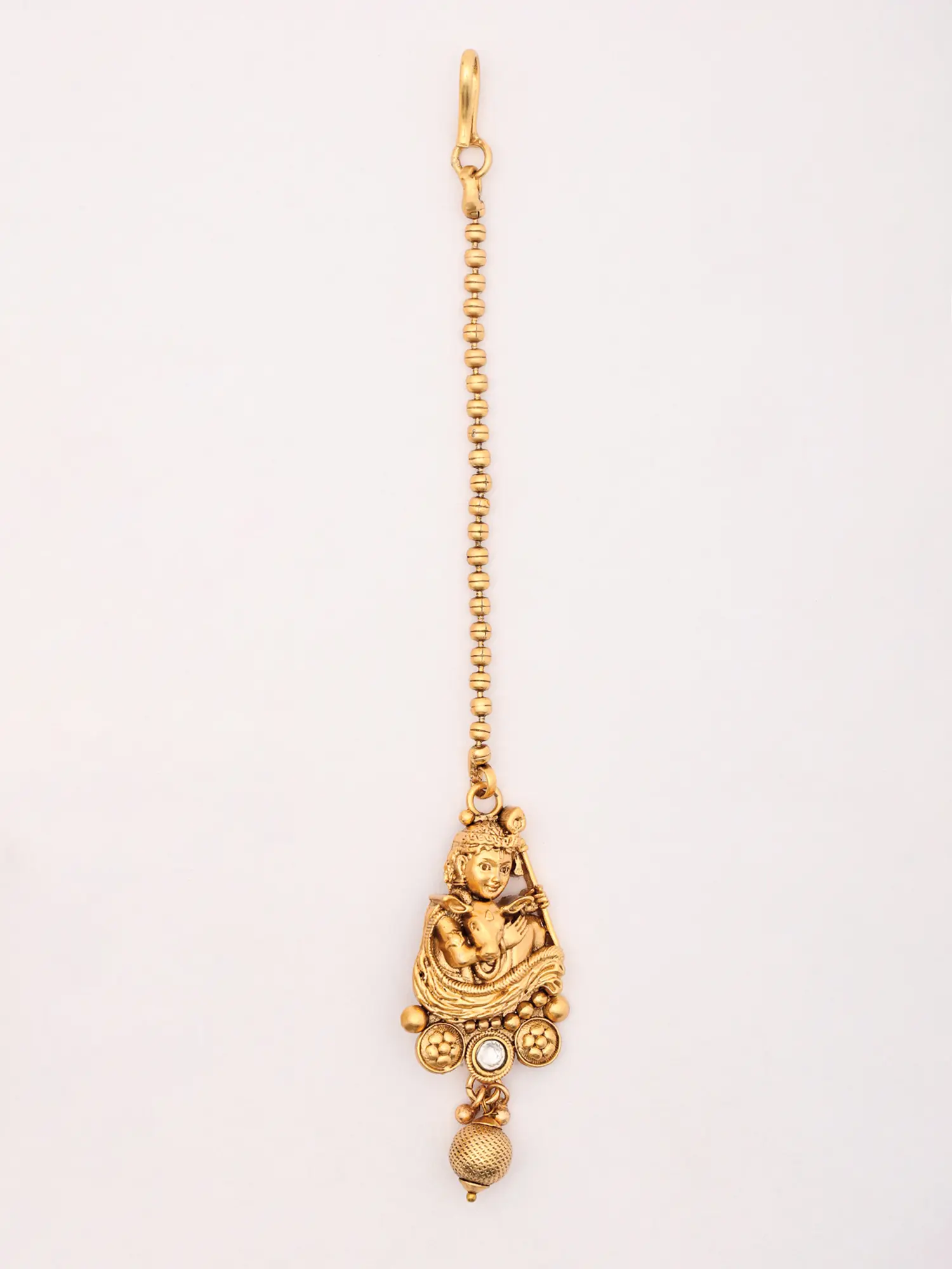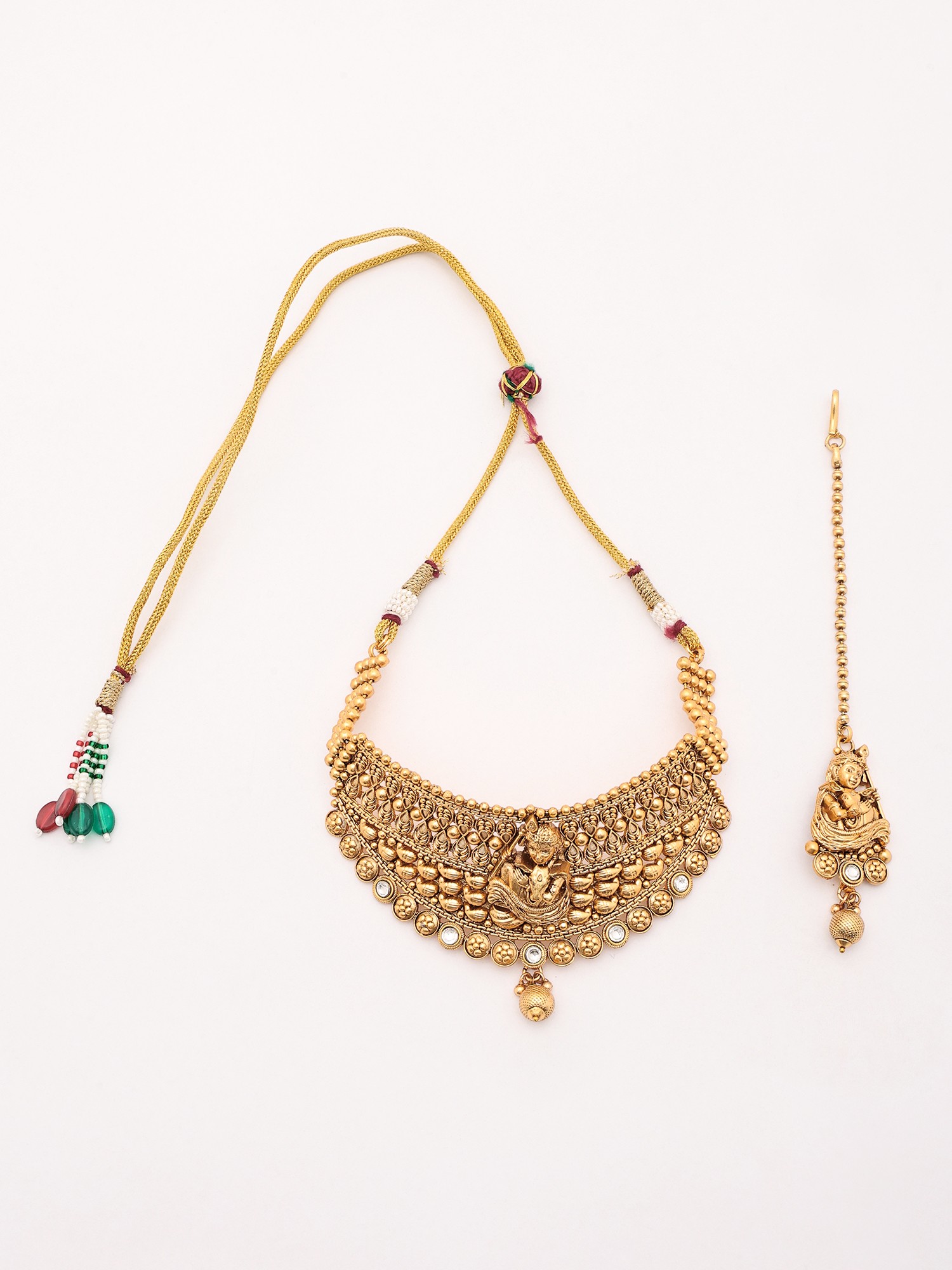 Completing this divine ensemble are the matching earrings and mangtika. The earrings are designed to be eye-catching yet harmonious with the necklace. Each earring features a similar Bal Krishna motif, suspended from a decorative top stud. The intricate detailing of the pendant, complete with its own cascade of beads and a small dangling bead, ensures these earrings make a statement without overwhelming the overall aesthetic. The mangtika, a traditional forehead ornament, adds the final touch of elegance. Its slender chain is designed to rest gracefully on the forehead, with a pendant that mirrors the intricate design of the necklace and earrings, creating a cohesive and stunning bridal or festive look.