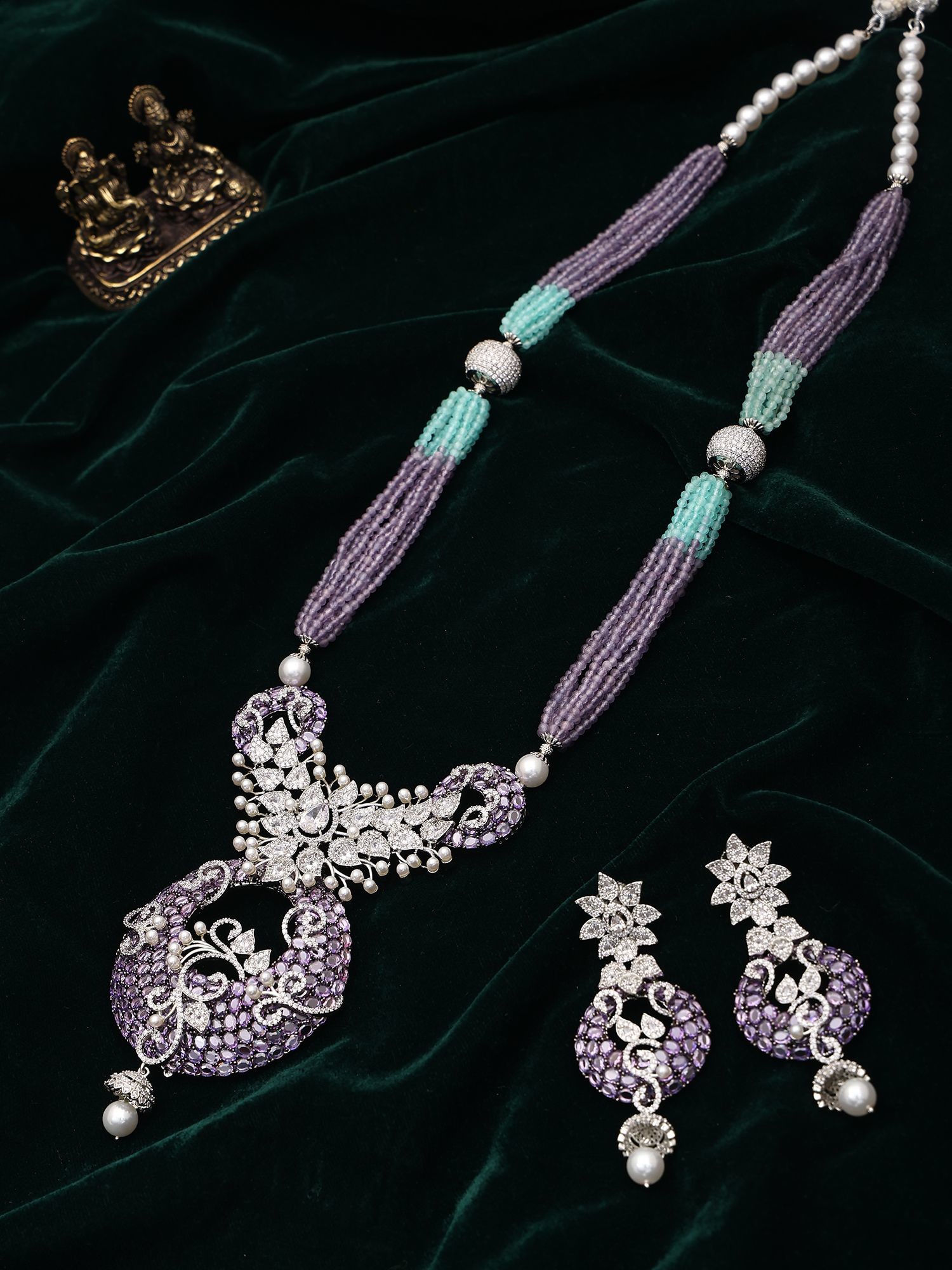 The necklace, extending to approximately 20.5 inches with an adjustable dori, offers a flattering drape. Its centerpiece, a pendant measuring 5.05 inches in height and 3.25 inches in width, is a breathtaking display of intricate patterns and sparkling stones. Complementing the necklace are earrings, each approximately 3.25 inches tall and 1 inch wide, echoing the pendant's refined beauty. The interplay of multi-strands, adorned with serene purple and refreshing aqua beads, creates a visual symphony.