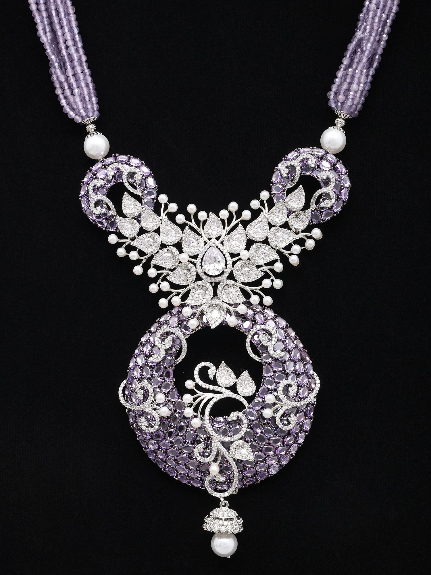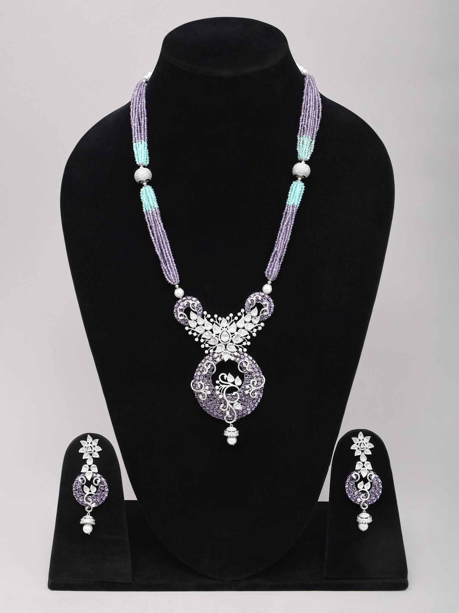 Beaded Multi Strand Zircon Stone Studded Necklace Set with Pearl Drop