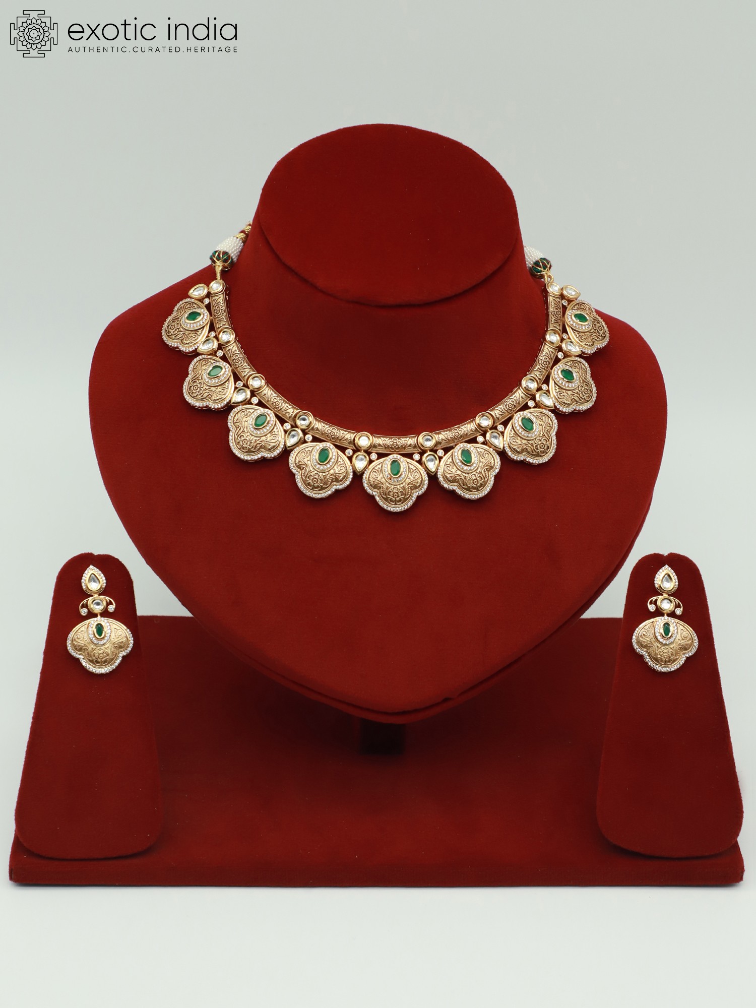 Beautiful Brass Necklace Set With Studded Kundan And Earrings