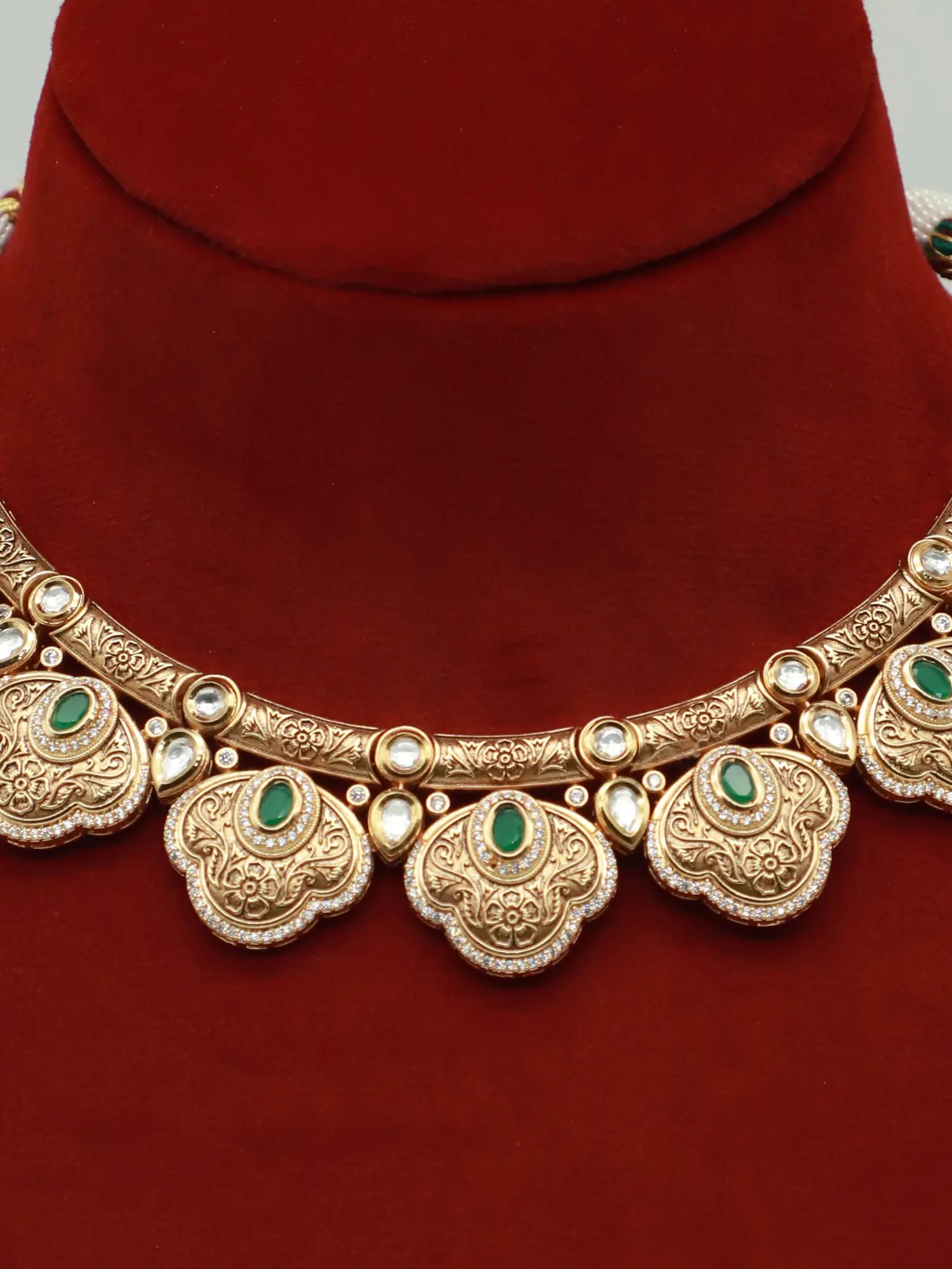 Floral Leaf Stone Studded Moissanite Kundan With Monalisa Beads Elegant Necklace With Earrings