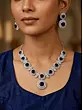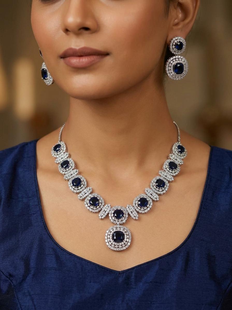 This exquisite necklace and earring set is a true masterpiece of design and craftsmanship. The rich, deep blue of the ruby stones is exquisitely complemented by the sparkling American diamonds, creating a look that is both elegant and captivating. Perfect for adding a touch of glamour to any outfit, this set is sure to turn heads wherever you go. The silver polish base provides a sophisticated backdrop that enhances the brilliance of the stones, making it a timeless piece you'll cherish for years to come.