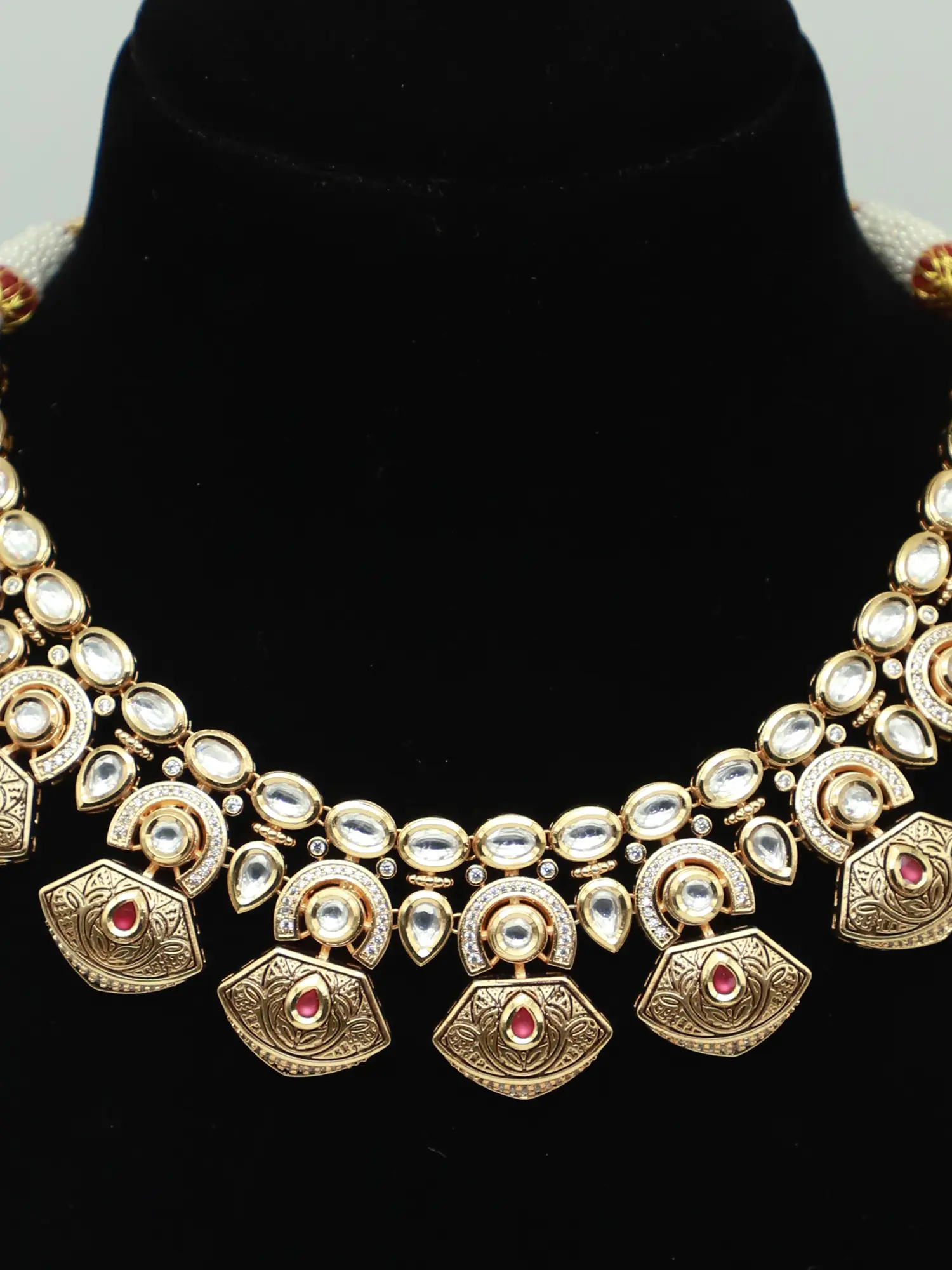 The necklace features a series of delicately carved floral elements. These intricate carvings bring an element of nature-inspired charm to the design. The design exudes a sense of traditional artistry. The complementary earrings echo the same design elements as the necklace, creating a cohesive and balanced look. Their petite size ensures comfortable wear while still making a statement. This set is more than just jewelry; it's an expression of your unique style and appreciation for fine craftsmanship. Whether you're attending a special occasion or looking to elevate your everyday look, this necklace and earrings set is the perfect choice.