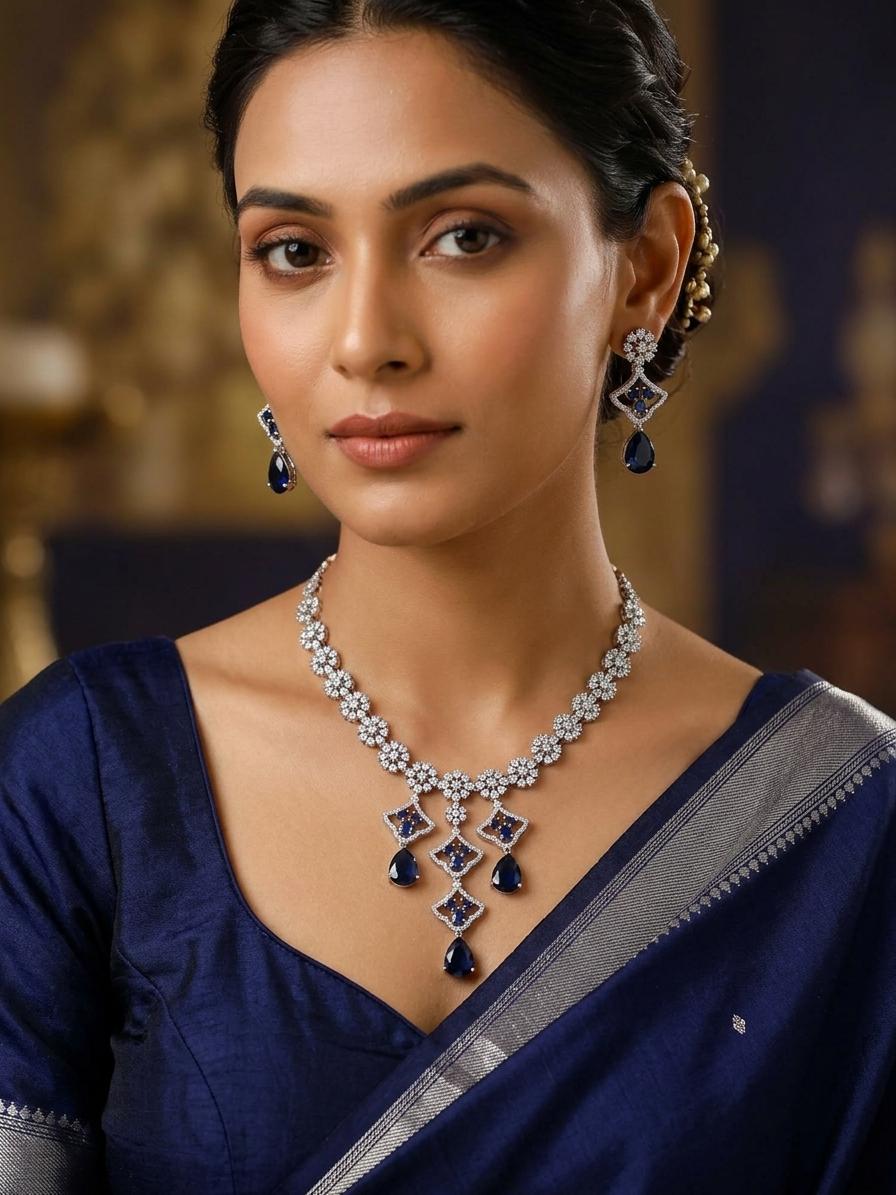 Elevate your style with this captivating American Diamond necklace and earring set. Designed to make a statement, this set features a delicate floral motif intricately crafted and studded with shimmering American Diamonds, creating a radiant and luxurious appeal. The brilliant sparkle of the American Diamonds mimics the fire of genuine diamonds, offering an accessible way to achieve a high-end look for any special occasion. The thoughtful design blends classic elegance with modern sensibilities. This set is ideal for those who appreciate fine jewelry with a touch of contemporary flair. Imagine pairing it with a sophisticated evening gown for a gala, or using it to add a touch of glamour to a more understated outfit for a wedding or upscale event. Its versatile design complements a range of styles, making it a valuable addition to any jewelry collection.