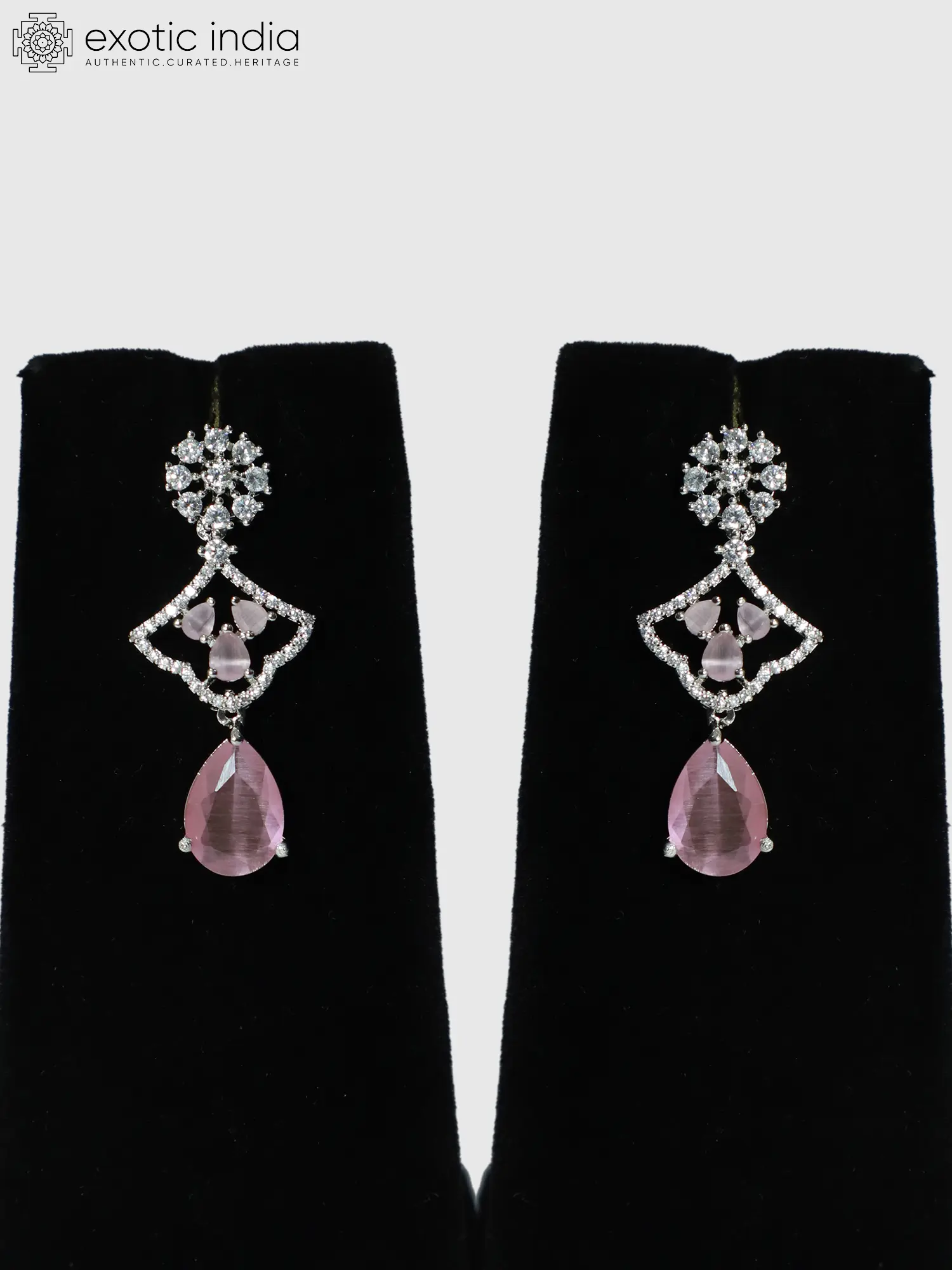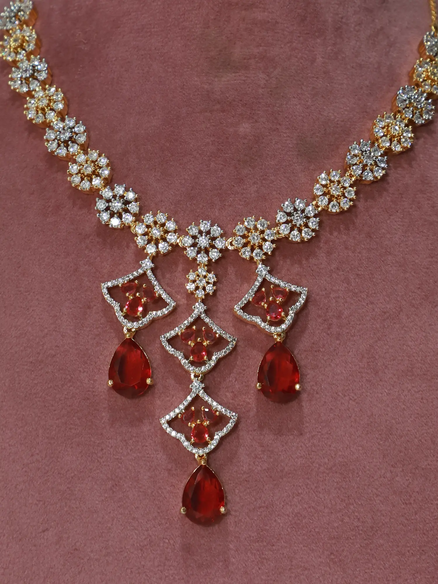 The necklace itself is a masterpiece of design, with a length of 10.7 inches, it sits perfectly to frame the neckline. The floral design is meticulously detailed, with each "petal" catching the light and reflecting a dazzling array of sparkle. A unique feature is the drop pendants which add another layer of sophistication and visual interest to the necklace. The contrast of clear American Diamonds against the deeper hue of the center stones creates a captivating effect that is sure to turn heads.