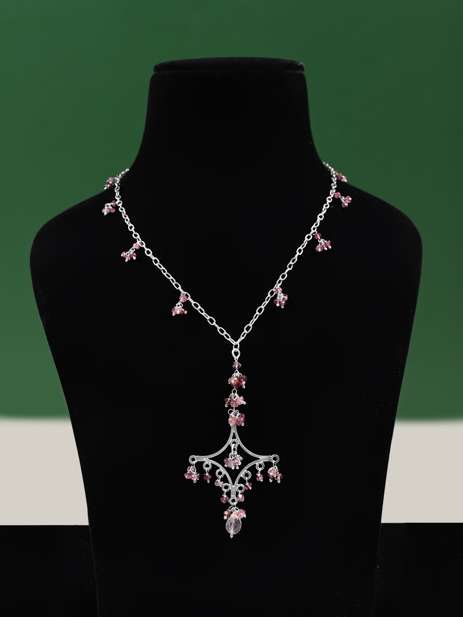 Indulge in the timeless elegance of a sterling silver necklace adorned with a captivating gemstone. Crafted with meticulous attention to detail, this exquisite piece exudes sophistication and charm. The lustrous silver chain delicately embraces the neckline, while the gemstone pendant adds a touch of color and brilliance.