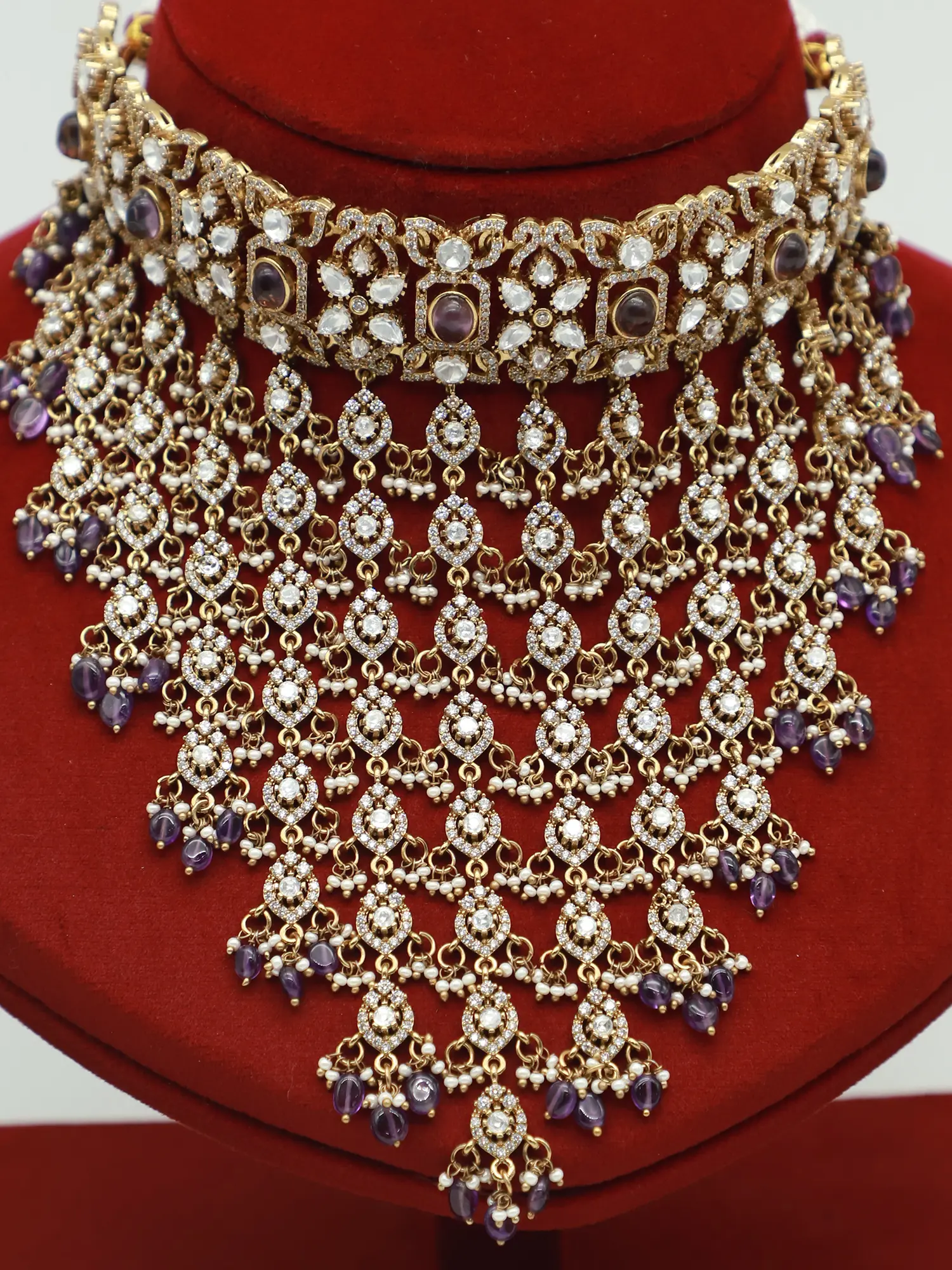 Attractive Floral Design Stone Studded American Diamond Necklace Set With Matching Earrings