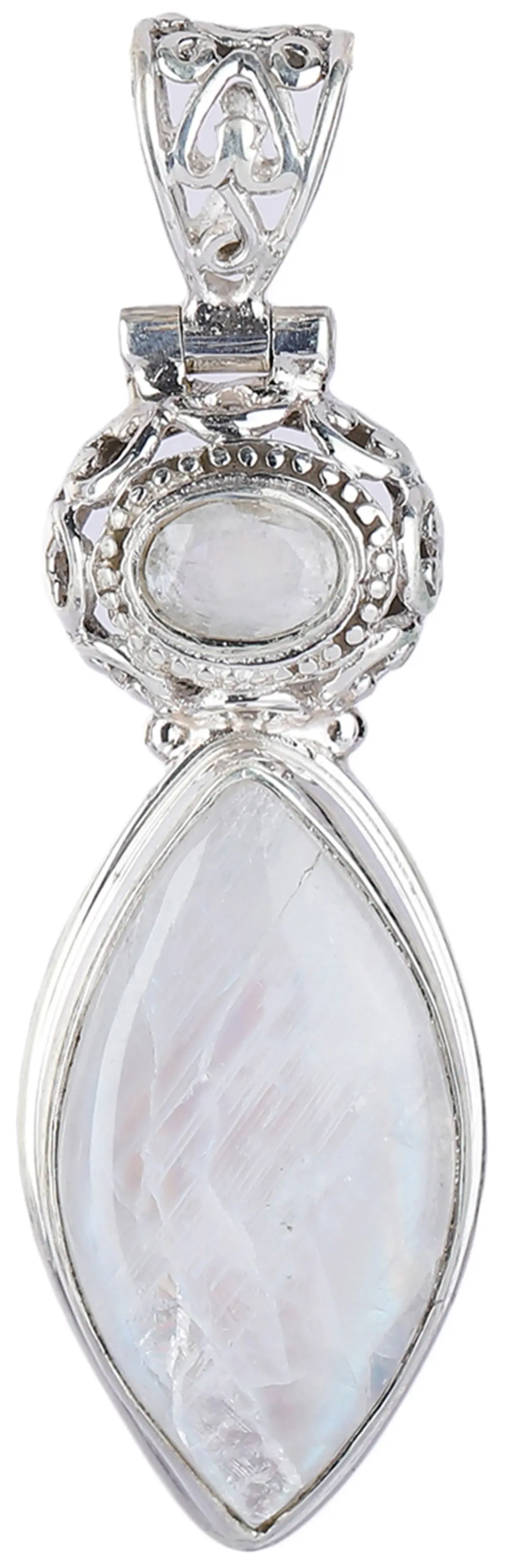 The sterling silver setting has been artfully designed to complement the radiant moonstone. The bail, a delicate filigree work, adds an intricate detail that catches the light and draws the eye towards the luminous gem. Below the bail, a beautifully ornate silver bezel encases a smaller, oval-cut moonstone, creating a captivating layered effect. This secondary stone further enhances the pendant's visual appeal, offering a subtle contrast and depth. The main moonstone is elegantly suspended in a marquise-shaped bezel, elongating the pendant's graceful silhouette and maximizing the display of its captivating iridescence. The entire piece is designed to hang beautifully, showcasing its unique charm.