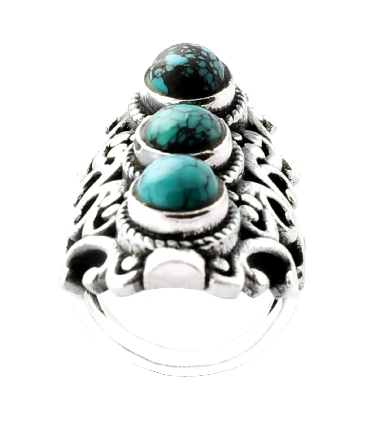Expertly crafted from high-quality sterling silver, this ring boasts durability and a timeless appeal. The sterling silver provides a lustrous backdrop for the vibrant turquoise stones, enhancing their natural beauty. The metalwork features an ornate, filigree-inspired design that adds depth and dimension. The combination of the polished silver and the striking turquoise creates a captivating contrast that is both elegant and edgy. The meticulous attention to detail ensures that this ring will remain a treasured piece in your jewelry collection for years to come.