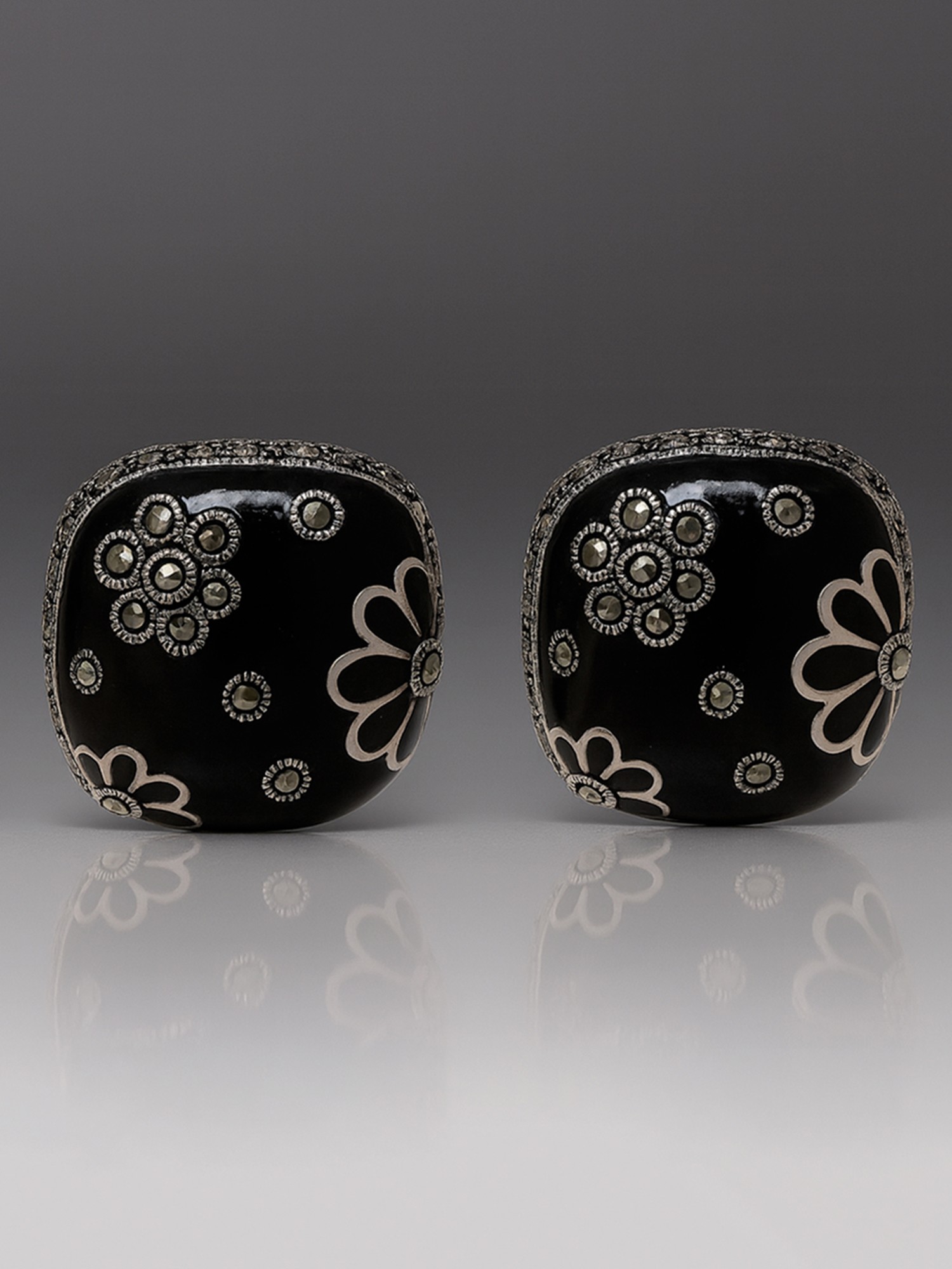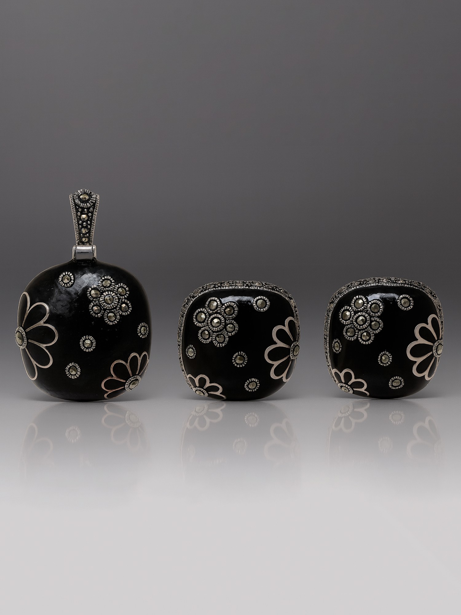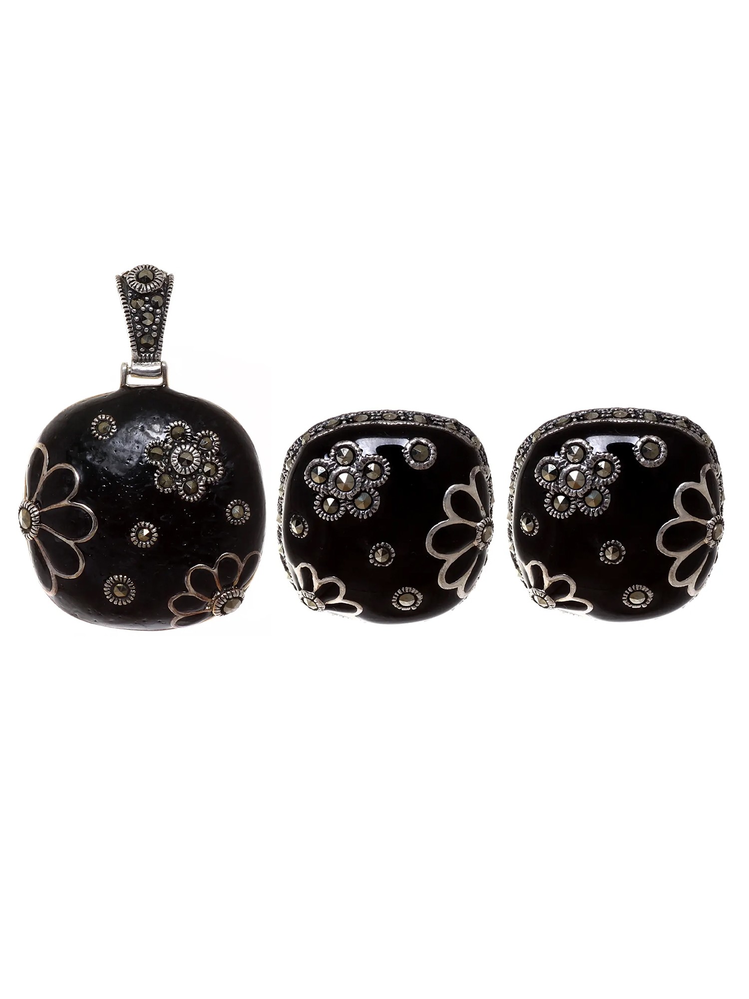 Exotic india presents perfect gemstone which looks elegant and subtle. Its beauty enhances further when it is paired with shining sterling silver. The motifs of flowers and dewdrops are delicately designed on the gemstone. The silver sterling design curves over the edge of the stone and hold it in place. The intricate decorative silver beads design also lines up the edge of earrings and the pendant holder. The marcasite set of pendant and earrings will portray your personality as majestic or class apart. It is believed that Marcasite provides energy to higher chakras. It opens up the chakra system by erasing the negative energy. It's metaphysical energy tones down the brain’s fatigue calm down the nervous system and help us to forget jealousy, hatred, and grudges. It also improves a person’s ability to communicate.