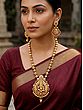 This necklace and earrings set is remarkably versatile and can be styled in numerous ways to suit your personal taste and the occasion. Wear it with traditional Indian attire such as sarees, lehengas, or salwar suits for a complete and authentic look. It also adds a touch of cultural flair when paired with contemporary outfits like a simple kurta or a flowing maxi dress. For a formal event, style the necklace with a silk saree and matching bangles. For a more casual look, pair it with a simple cotton kurta and jeans. The earrings can be worn alone to add a subtle touch of elegance to everyday outfits. This set makes a thoughtful and cherished gift for loved ones on special occasions, symbolizing blessings, prosperity, and good fortune.
